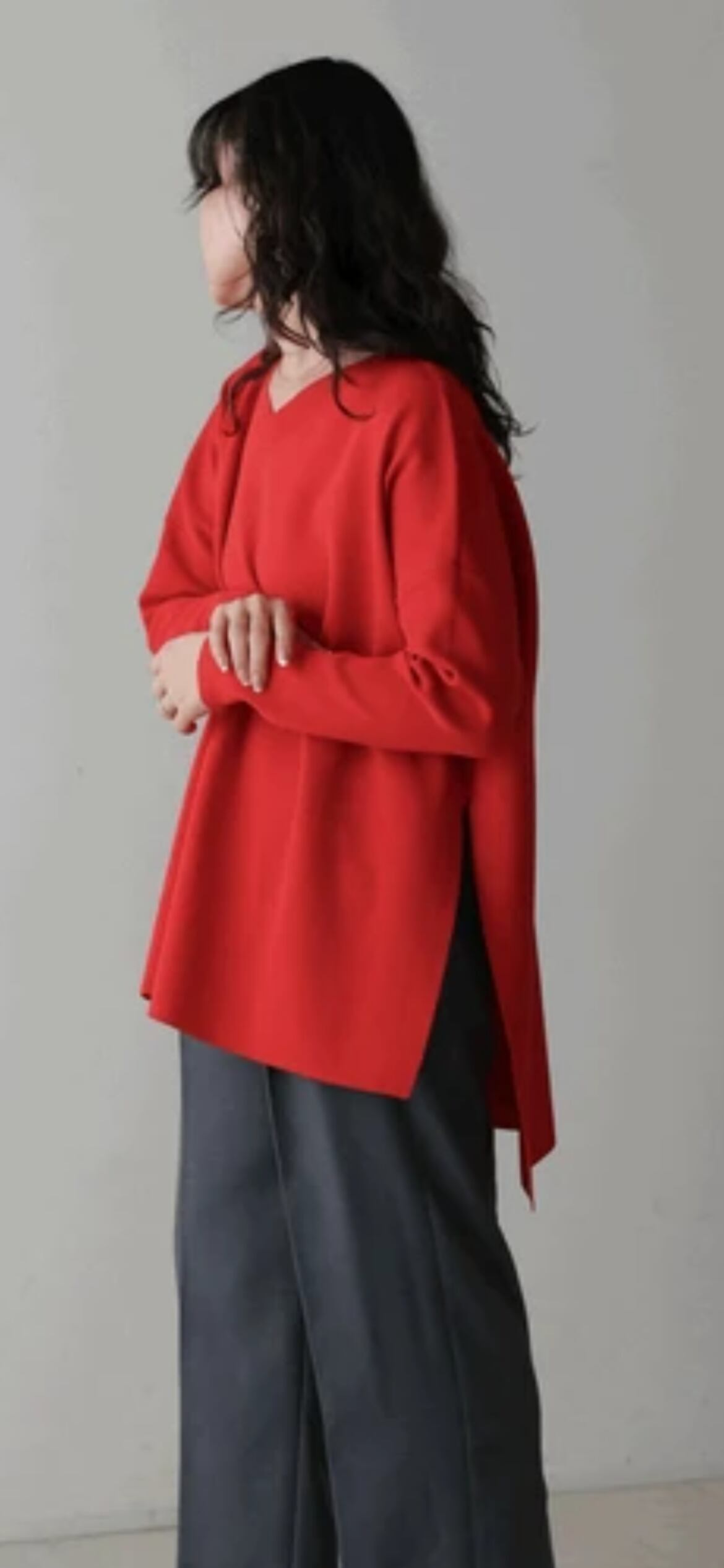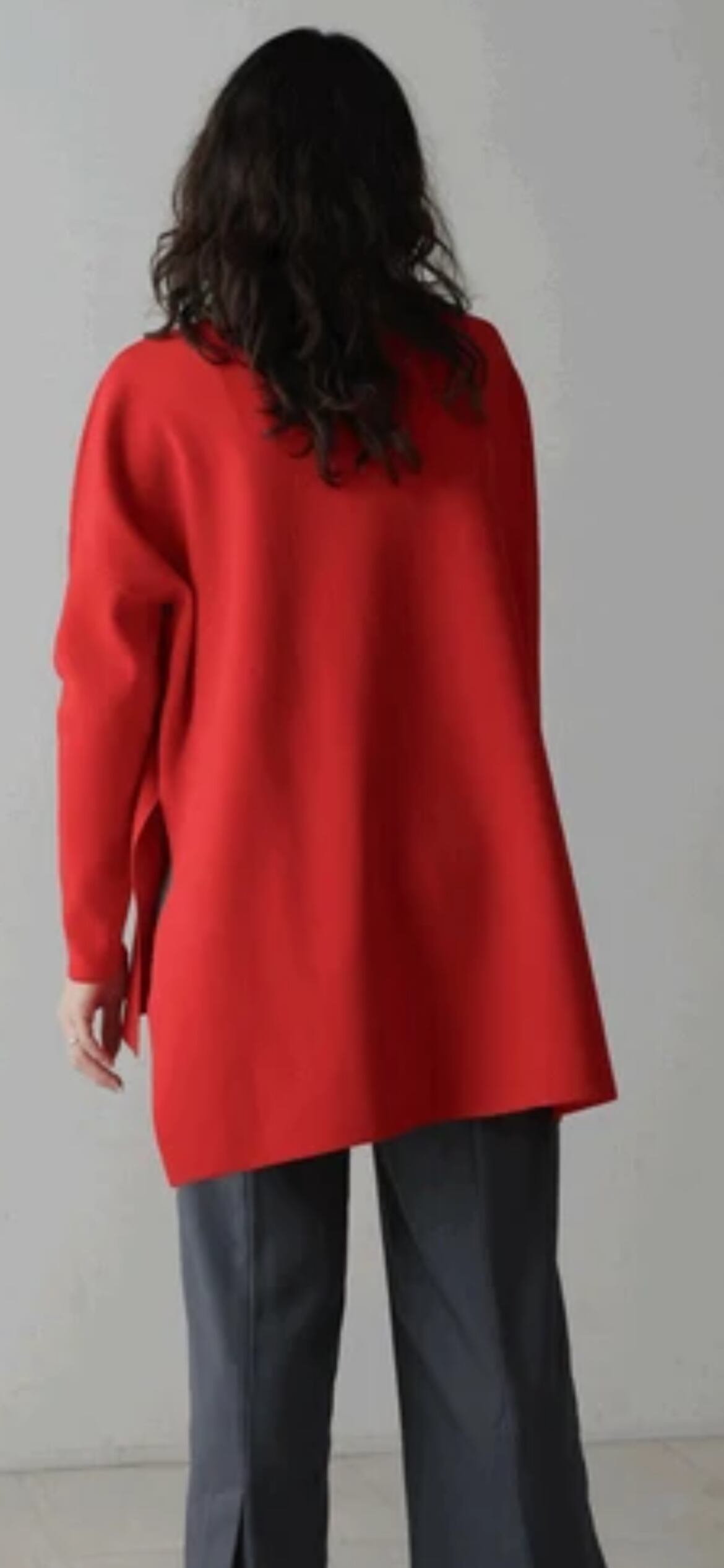 深めに入った裾のスリットに、膝下からのフレアラインなどとことん美脚に見えるように追求。