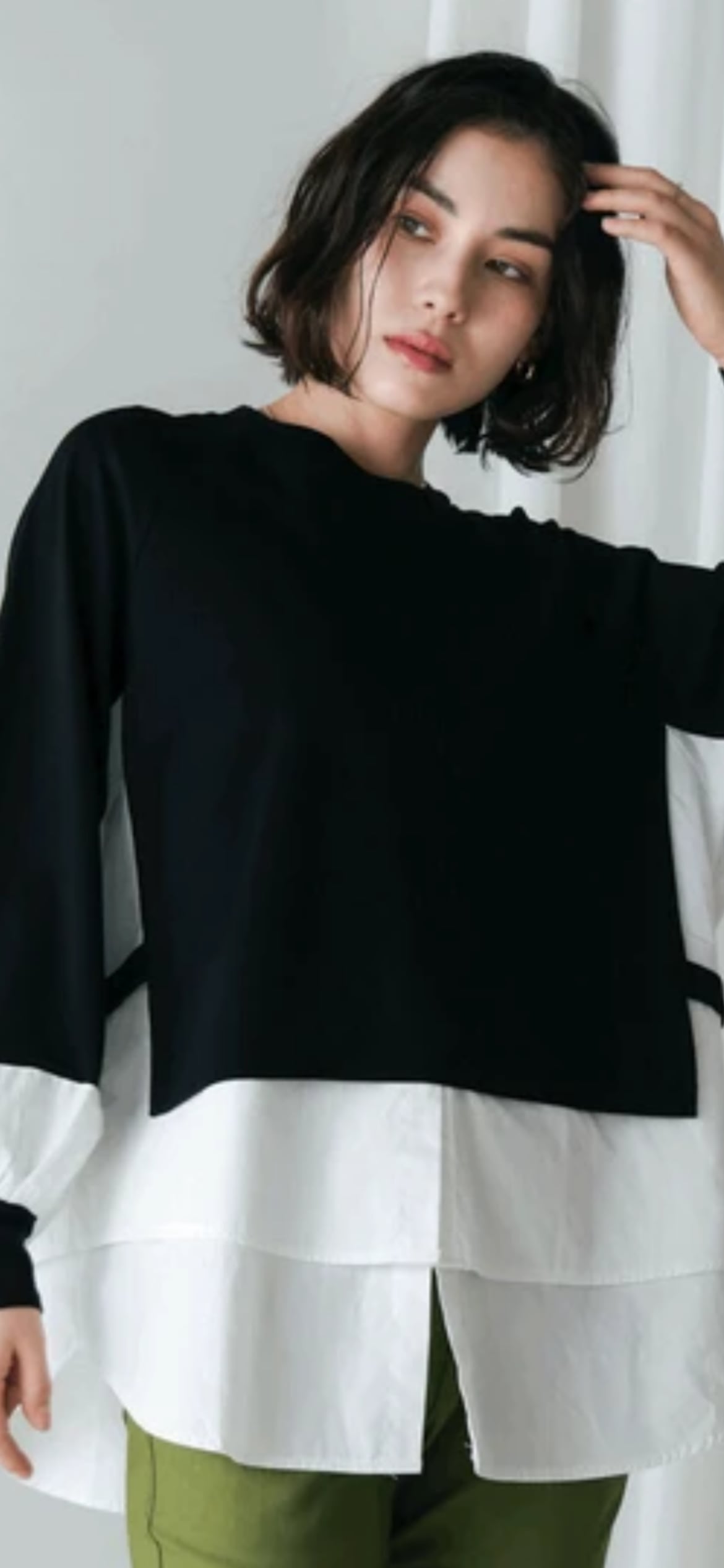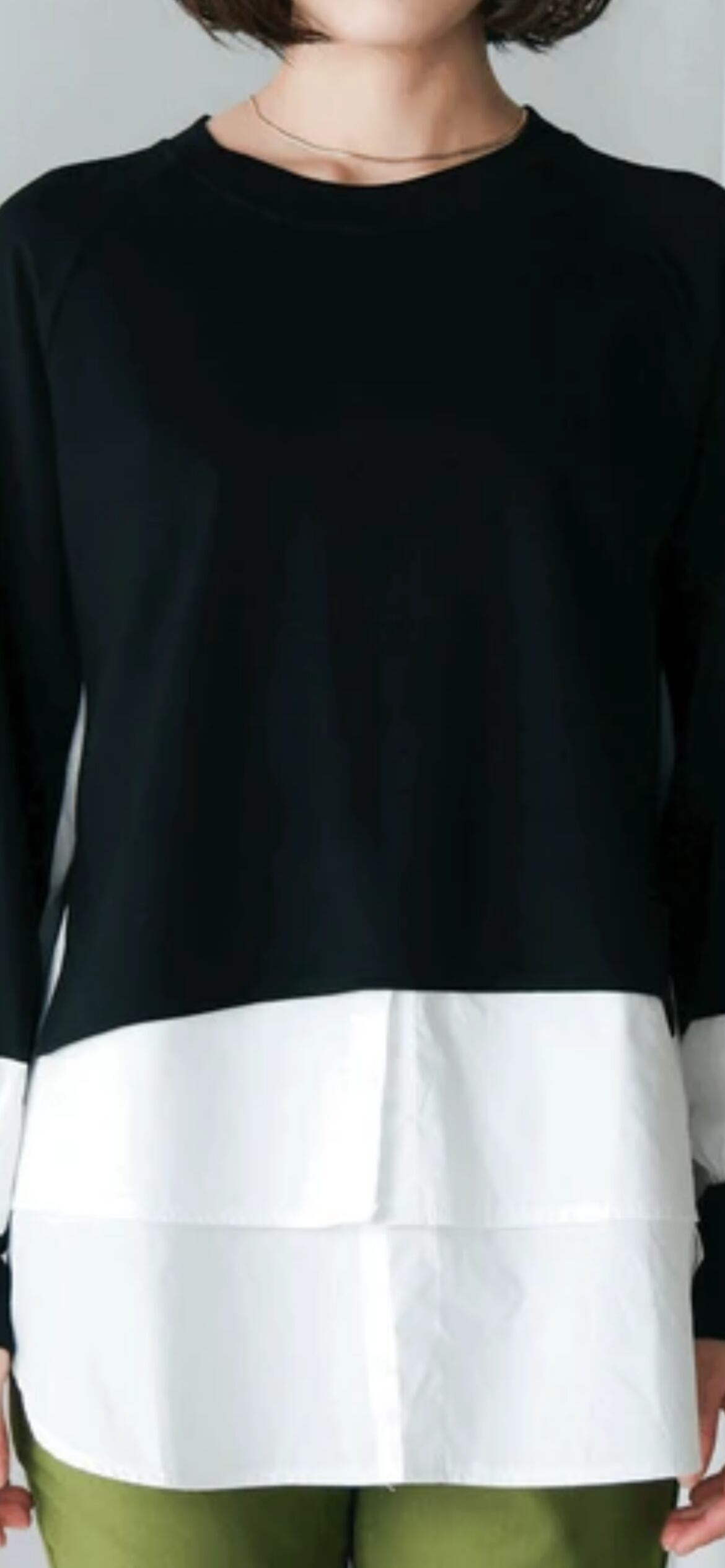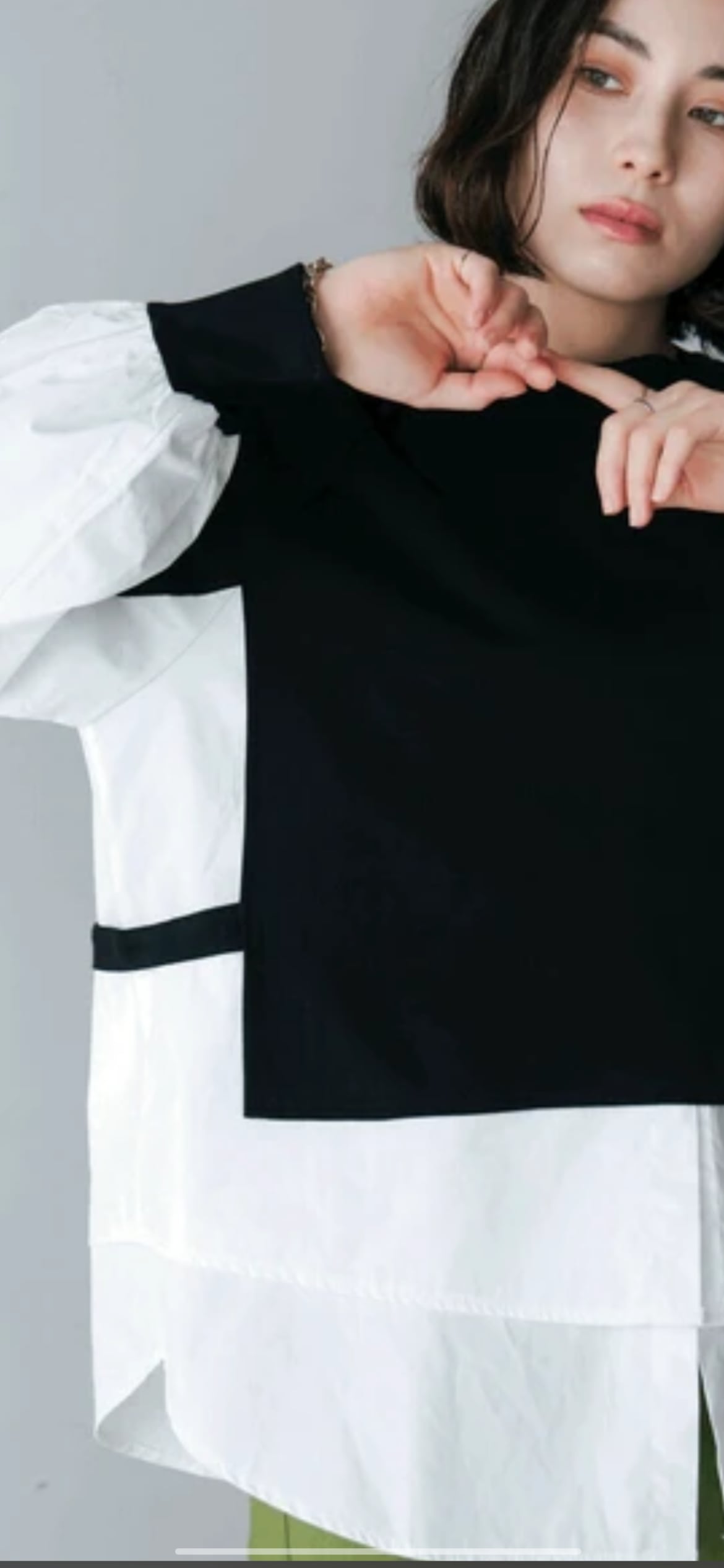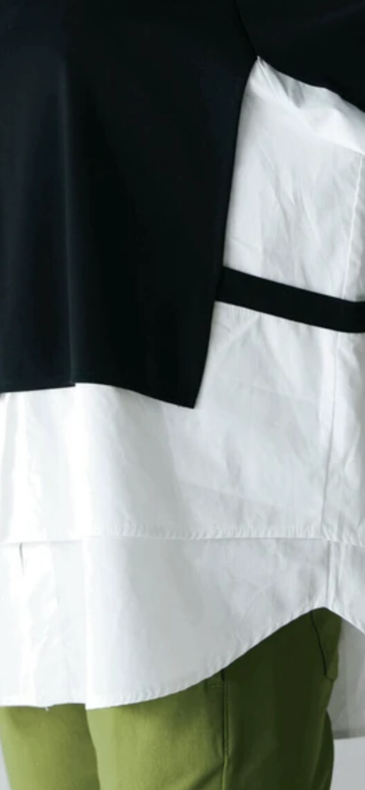 二重にドッキングされた綿100%のシャツ部分できちんと感を演出してくれます。