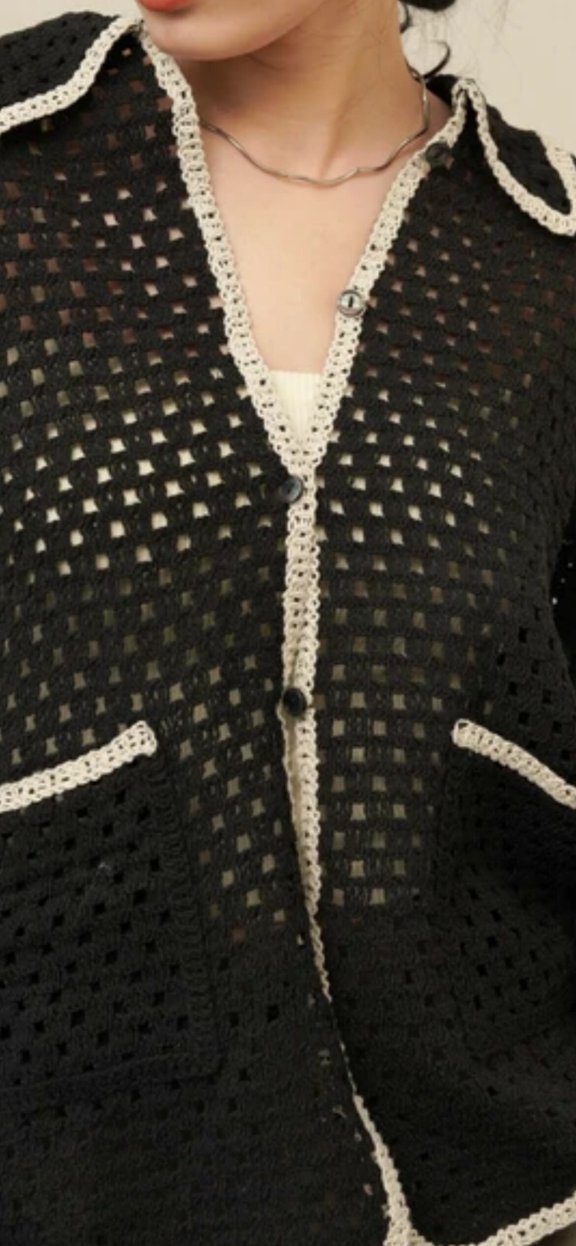 今季のクロシェ編みに衿付きのシャツタイプが登場しました!衿先が少しカーブしているのでメンズライクになりすぎず柔らかい印象でお楽しみいただけます。フロントにはポケットも付いていてアクセントが加わった一枚。編地が透けすぎている感じではないのでさらりとシャツ感覚で羽織っていただけます。A色とB色は配色になっているのでコントラストが効いた1着に仕上がっています。