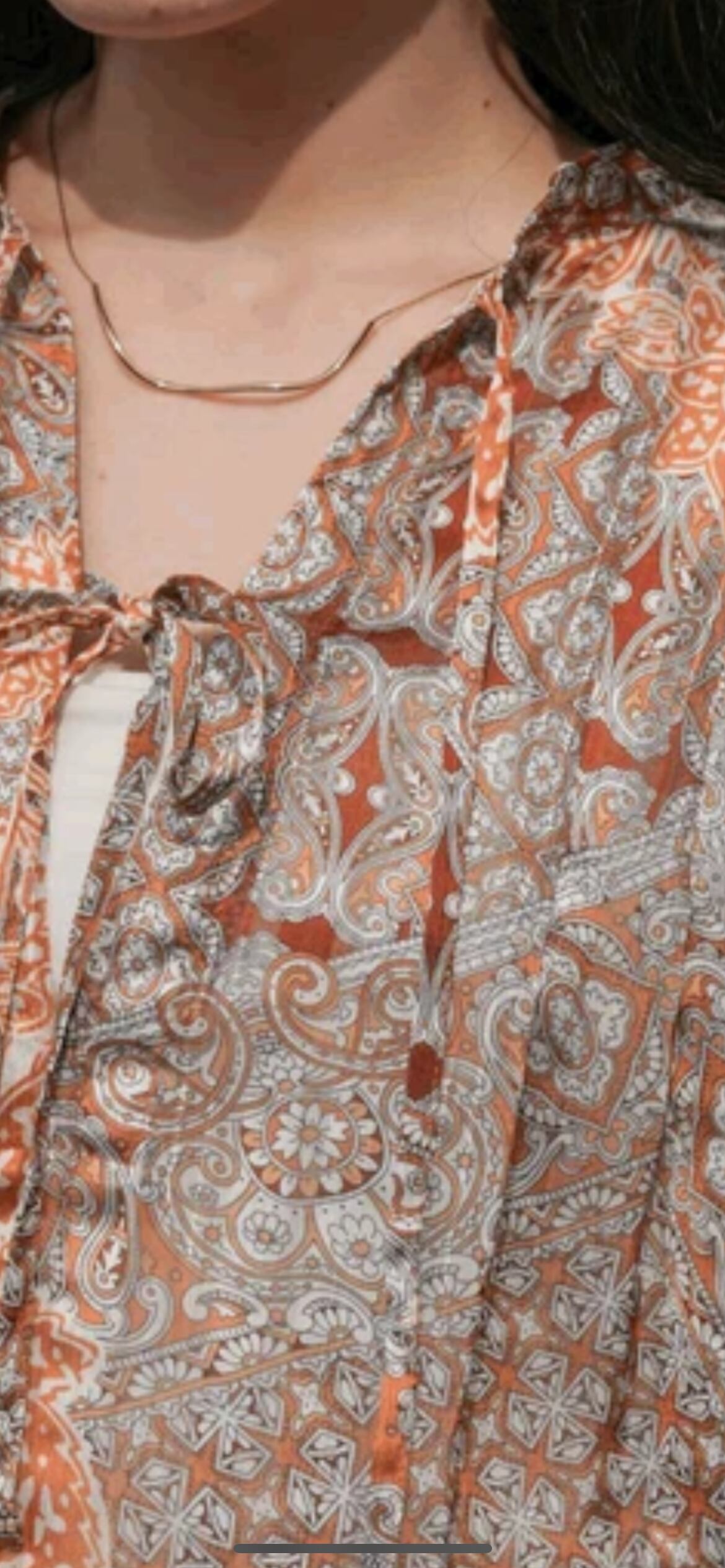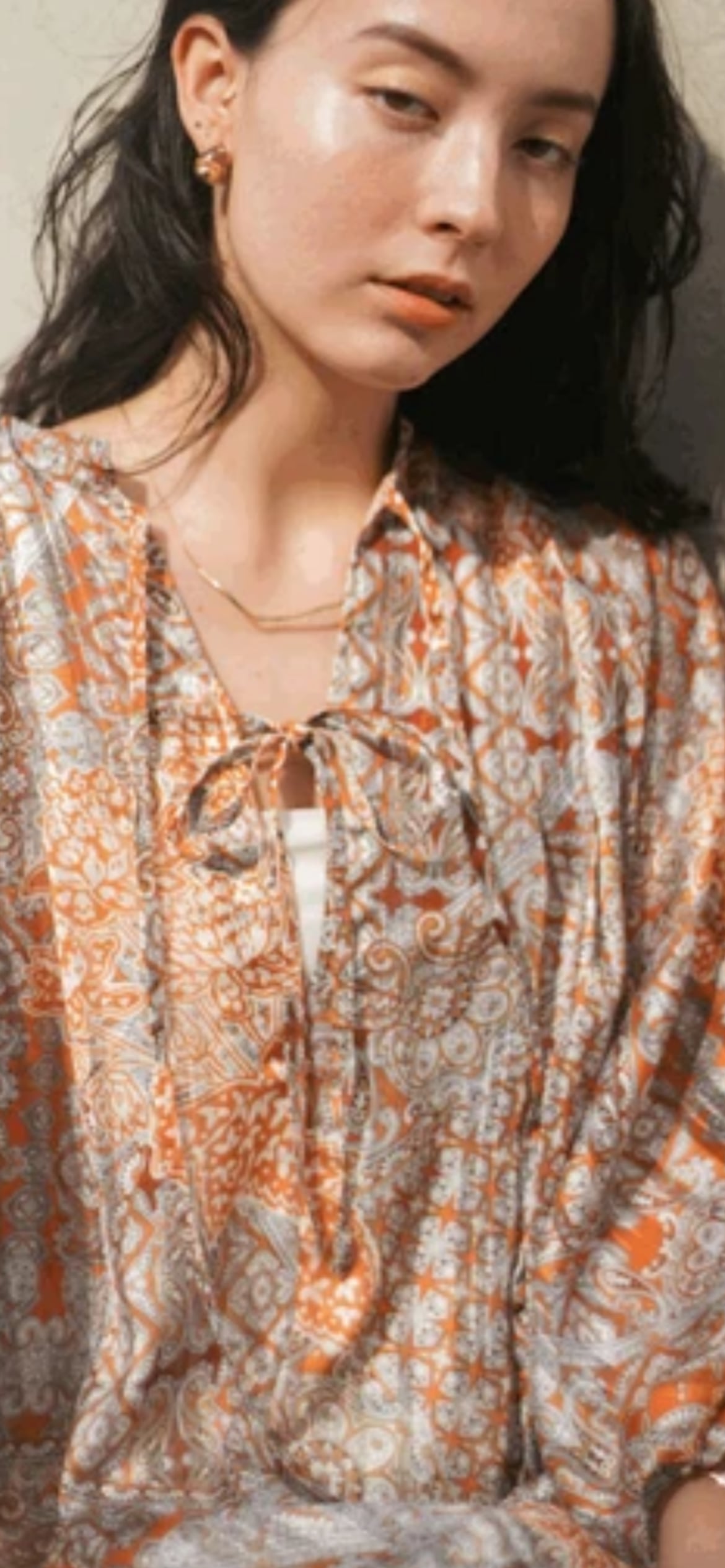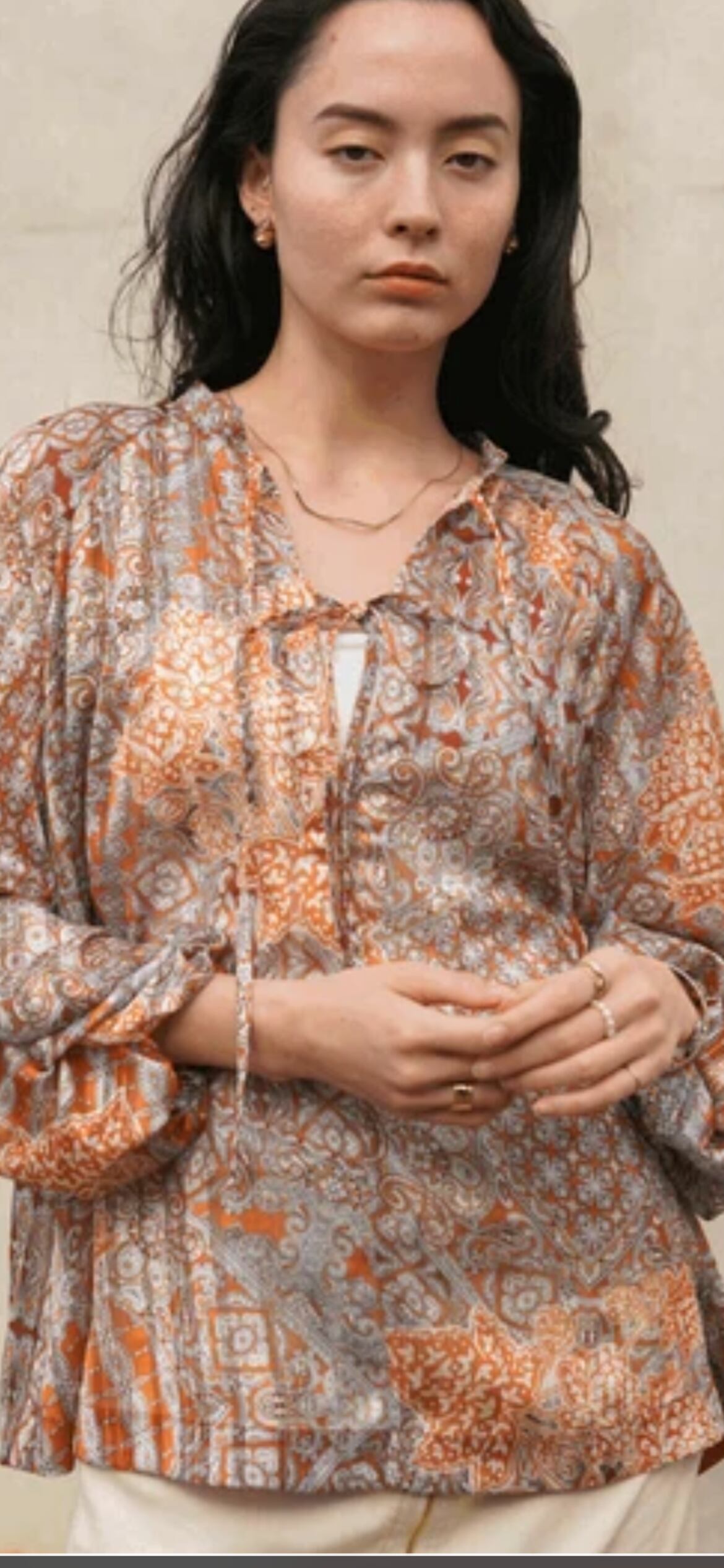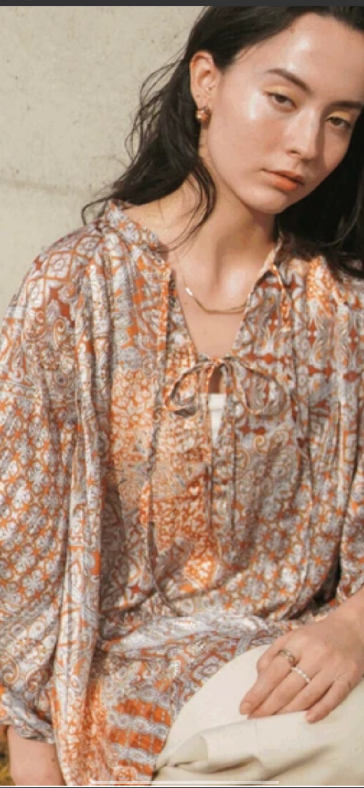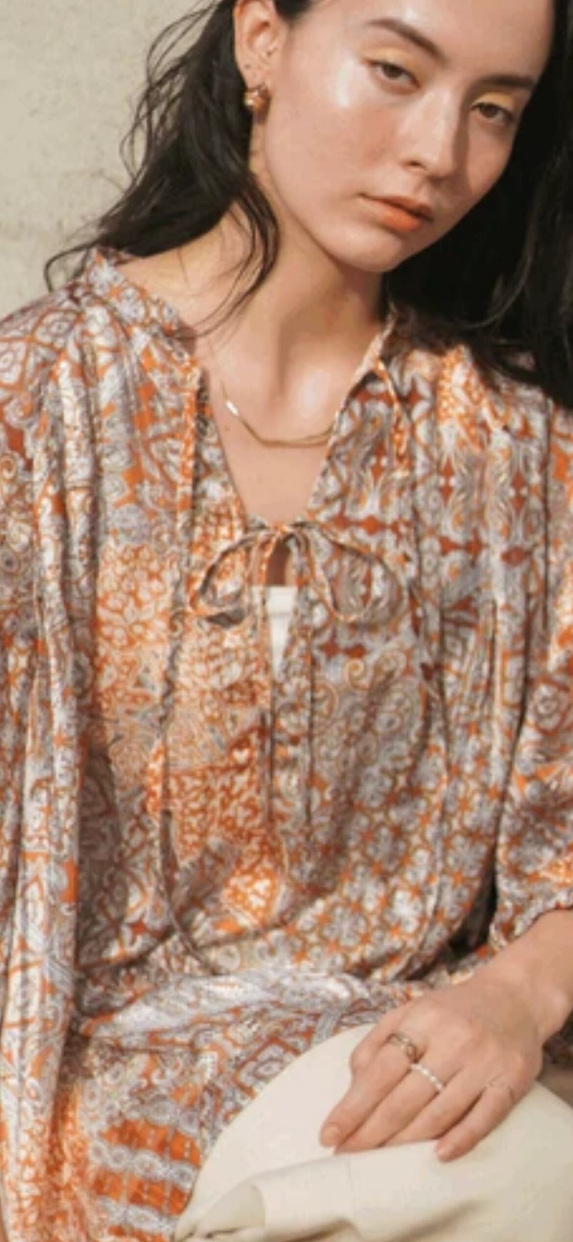 ブランドアイコンなエキゾチックな柄でフロントリボンでトレンド感のあるブラウスにしました。