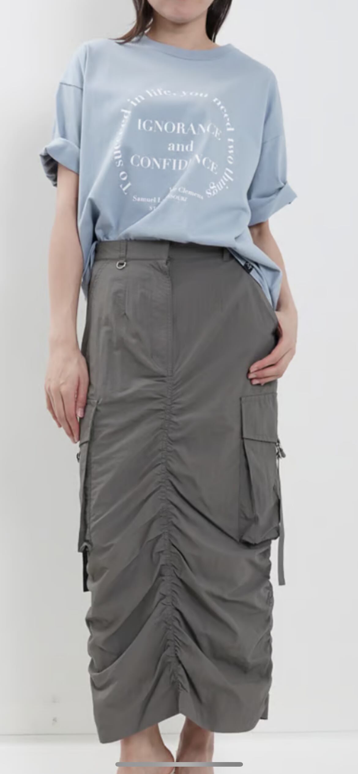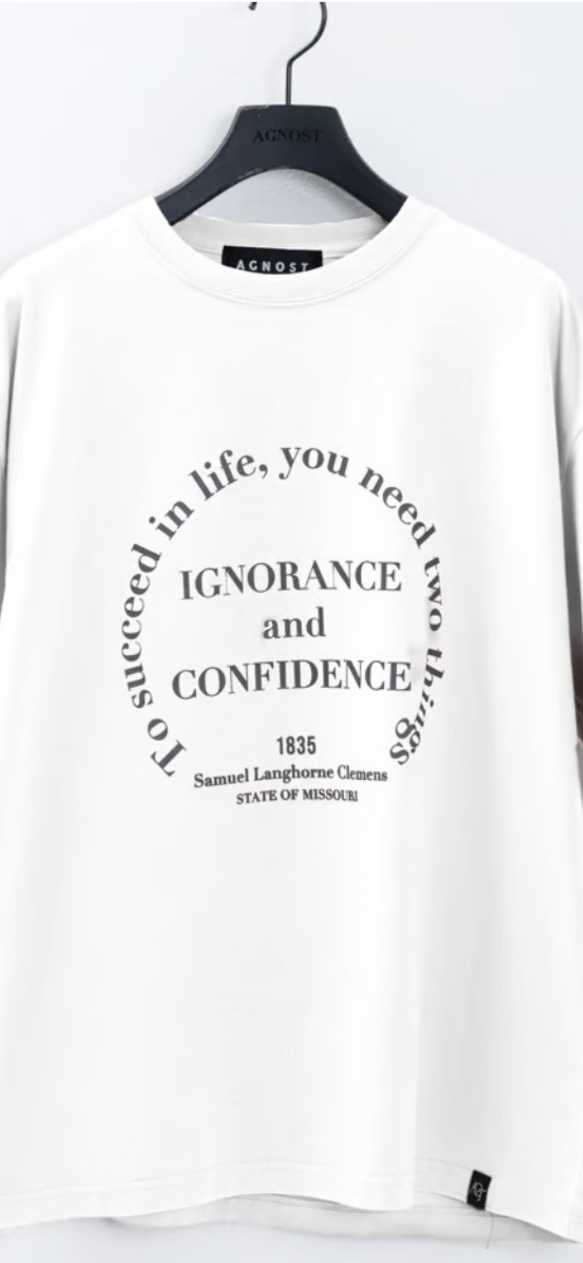 5.60z.軽量コットンで広めにとった身幅と肩幅、バランスが取れるよう計算された身文や袖まわりがポイントのボディーに『トム・ソーヤーの冒険』の著者として知られるマーク・トウェインの名言をサークルロゴに。裾が後やかなAラインなのでドレープ感を強調した着こなしが可能です。