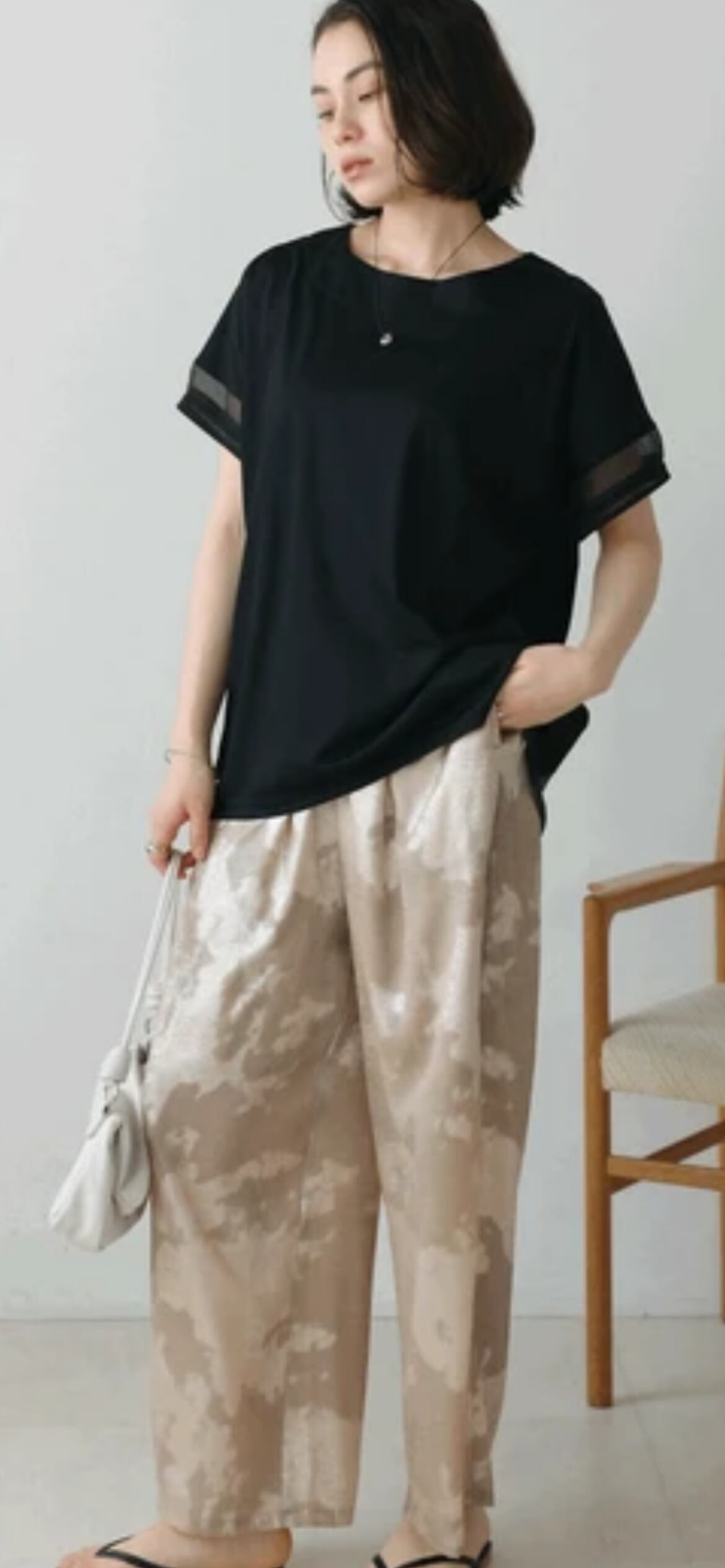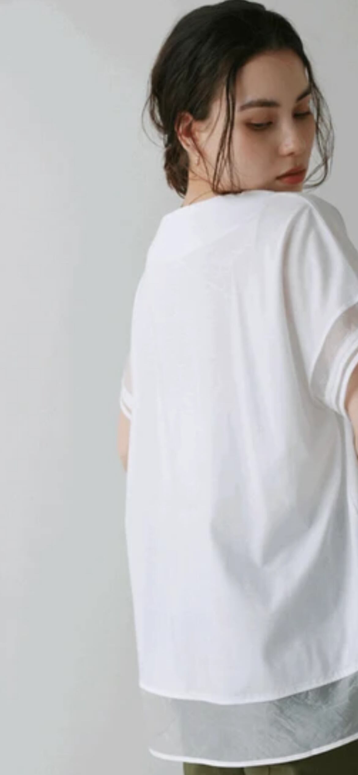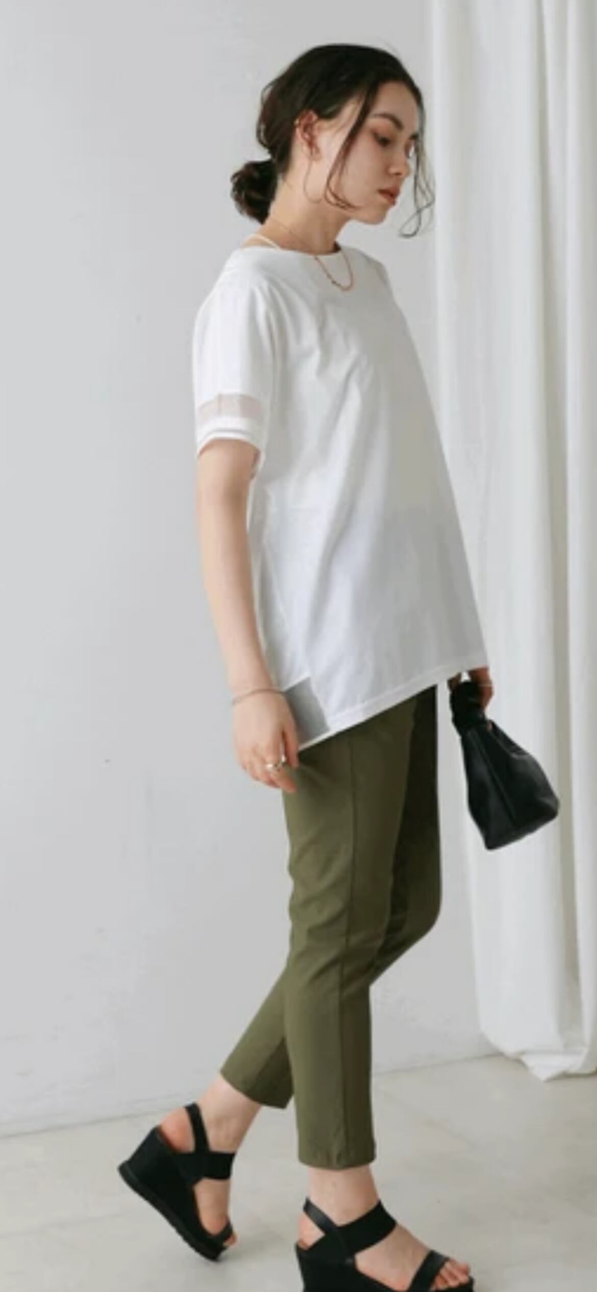 シルケット見えのカットソーはレーヨン混で落ち感があり、ブラウスのような印象です。