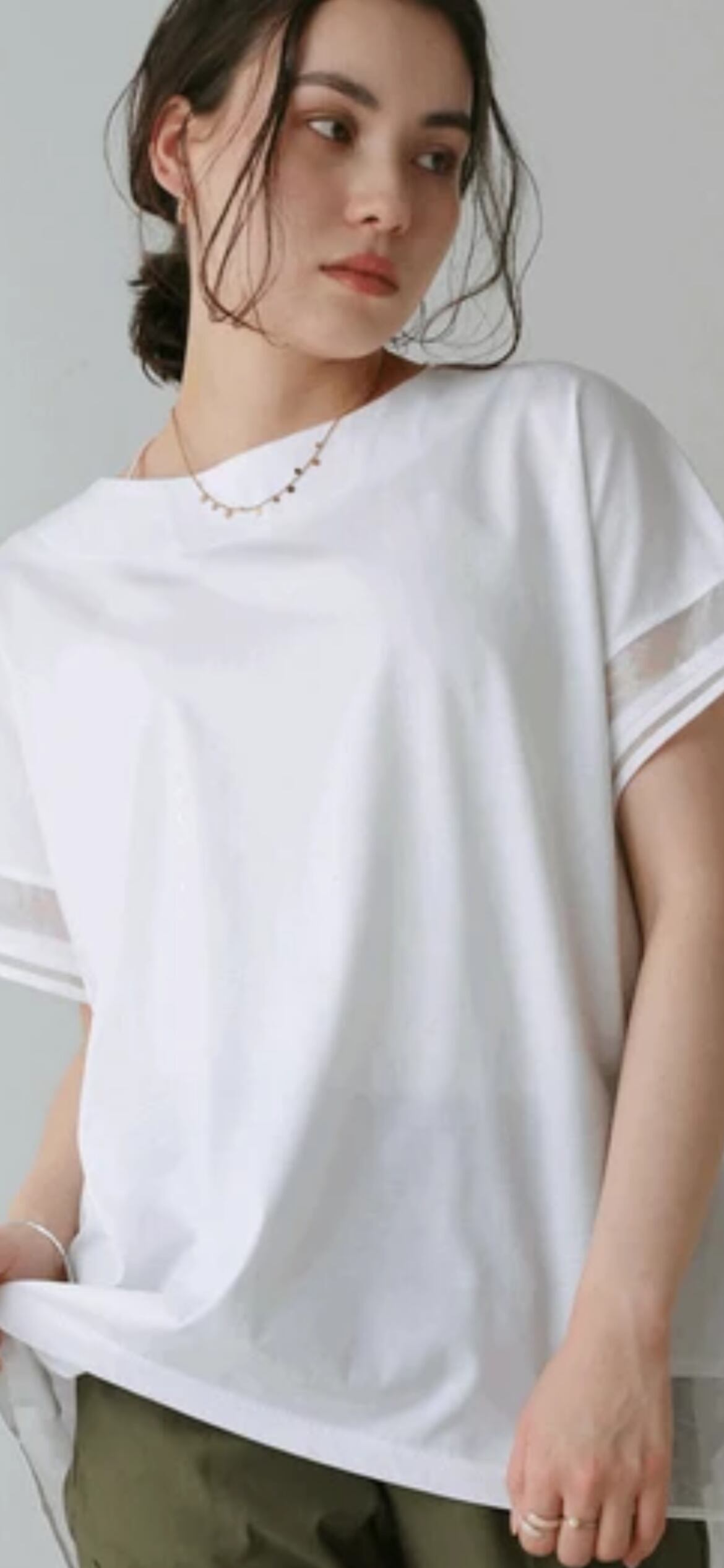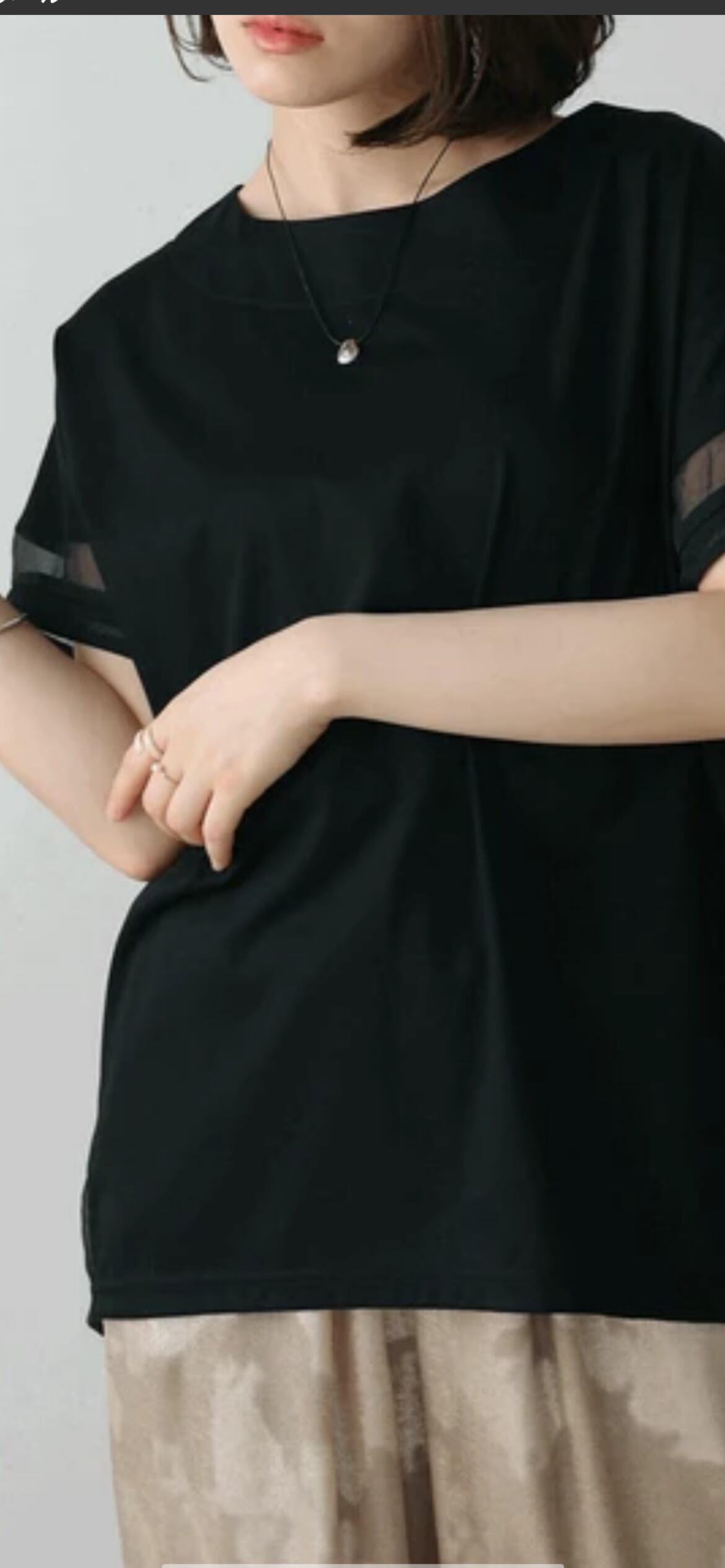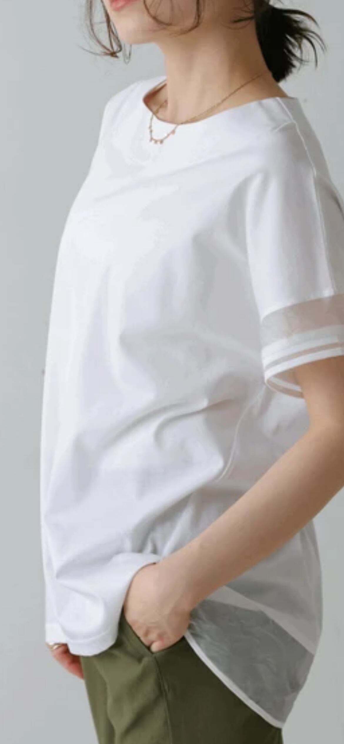 袖のシアー配色がワンポイントになっており、カジュアルになりがちなTシャツの増える夏に嬉しいブラウス見えカットソーです。