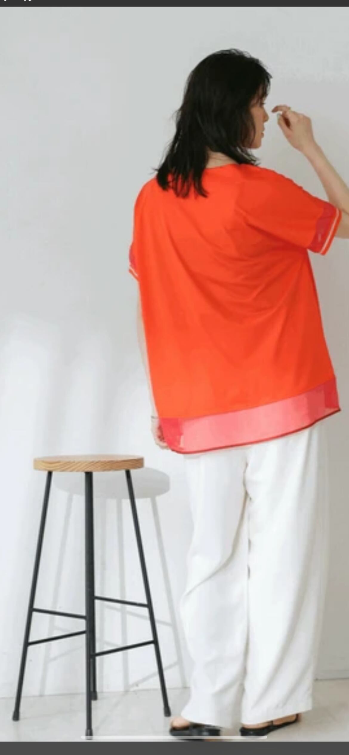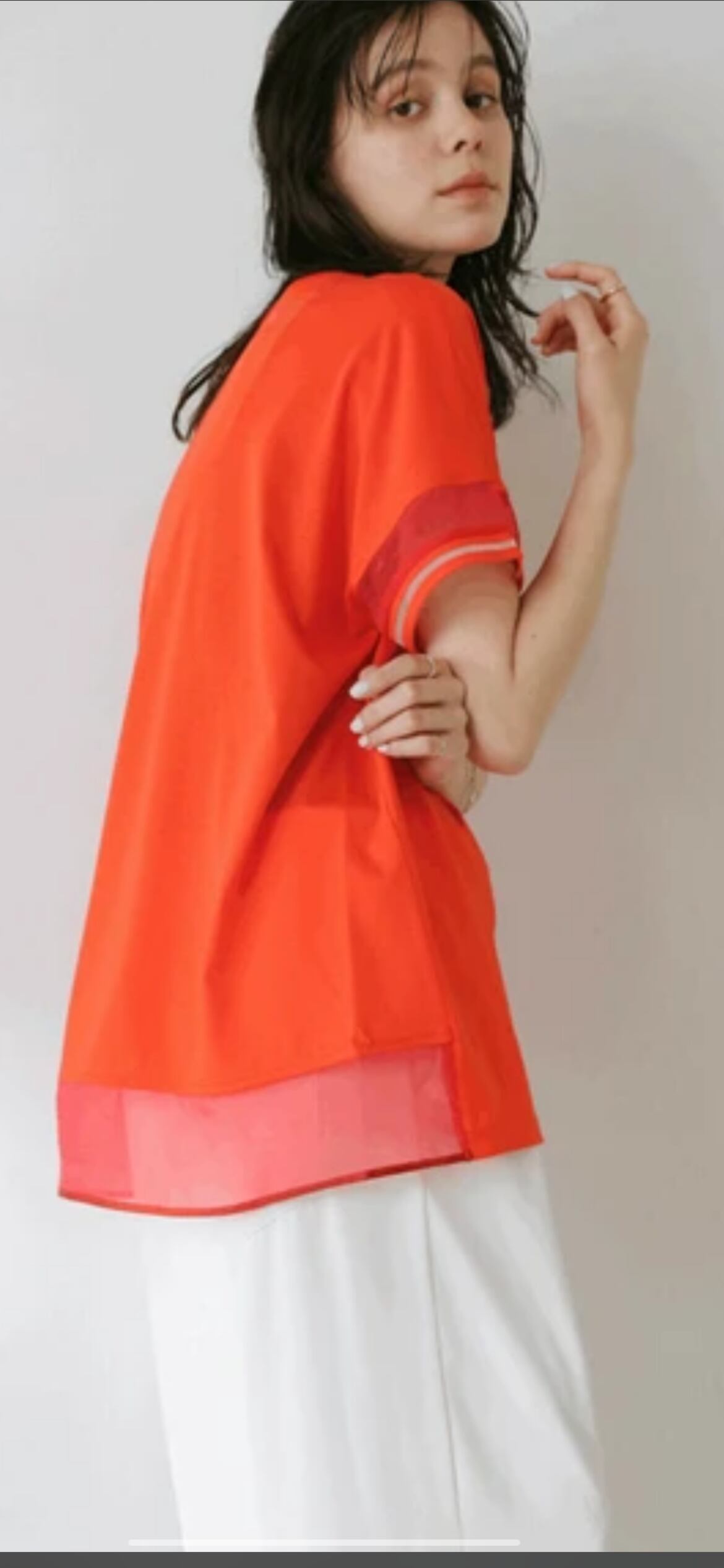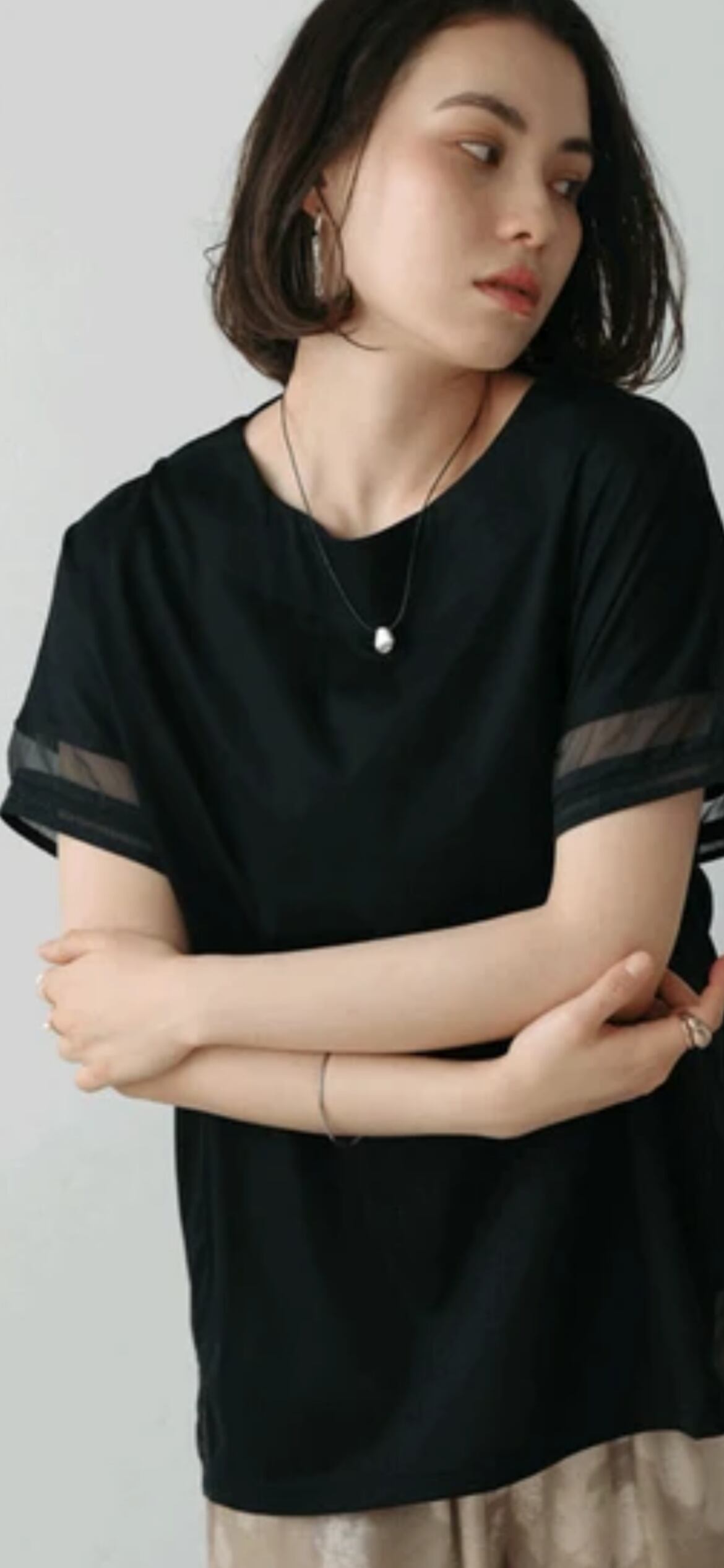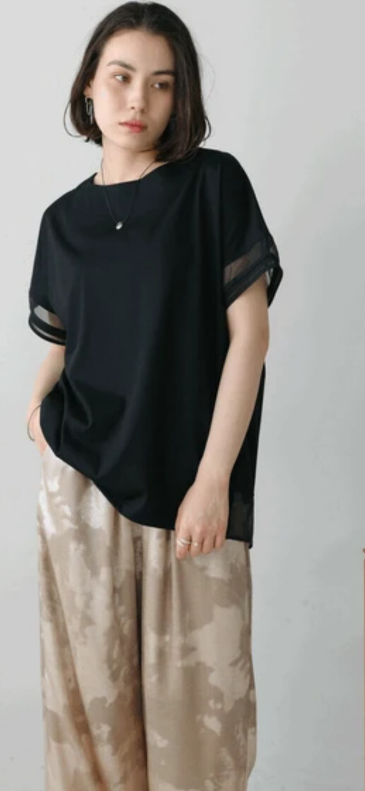 袖のシアー配色がワンポイントになっており、カジュアルになりがちなTシャツの増える夏に嬉しいブラウス見えカットソーです。