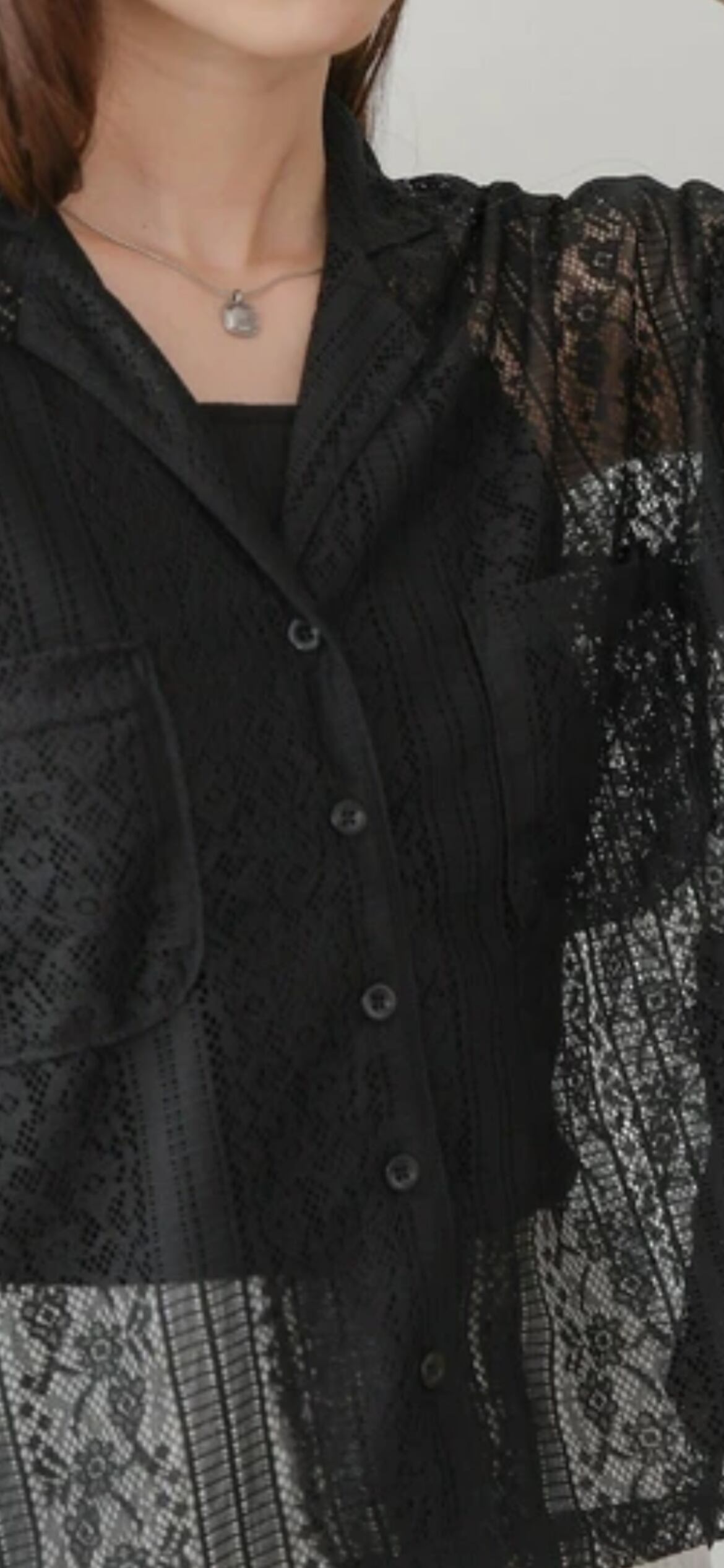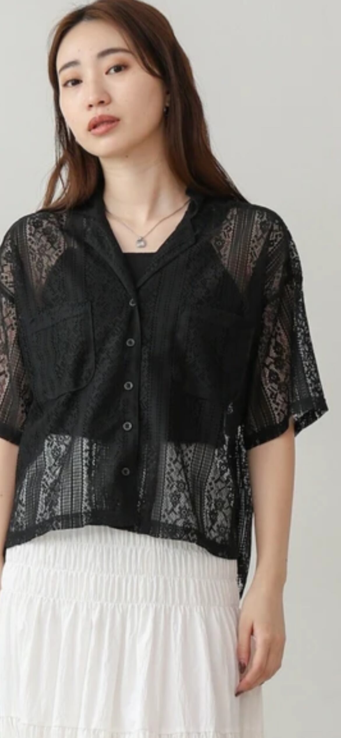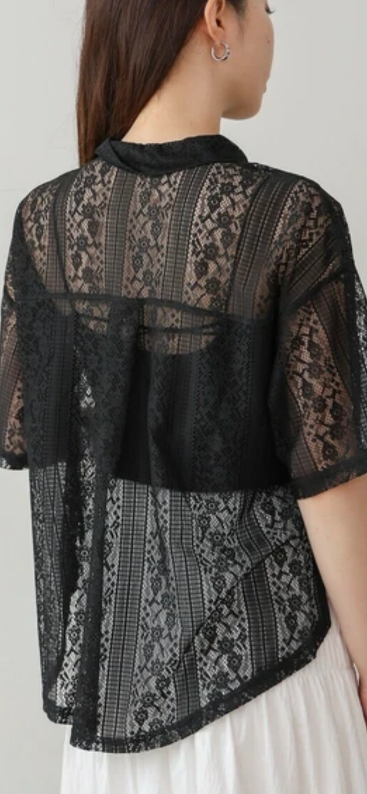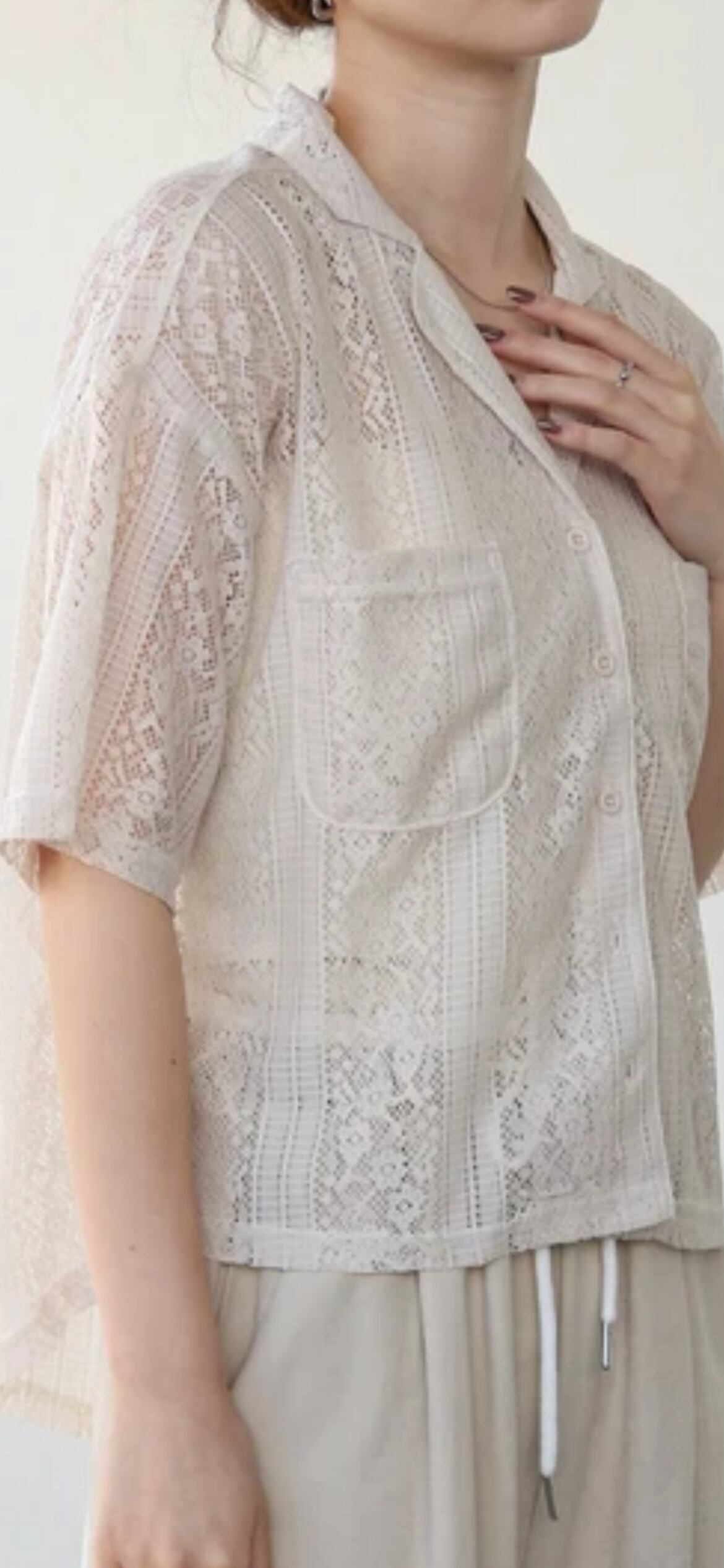 繊細なレースが目を惹く、上品で女性らしい印象のブラウスが登場。軽やかな素材感で、春夏のコーディネートにぴったりの一枚です。首元はすっきりとした襟付きシャツ仕様で、アクセサリーとの相性も抜群。