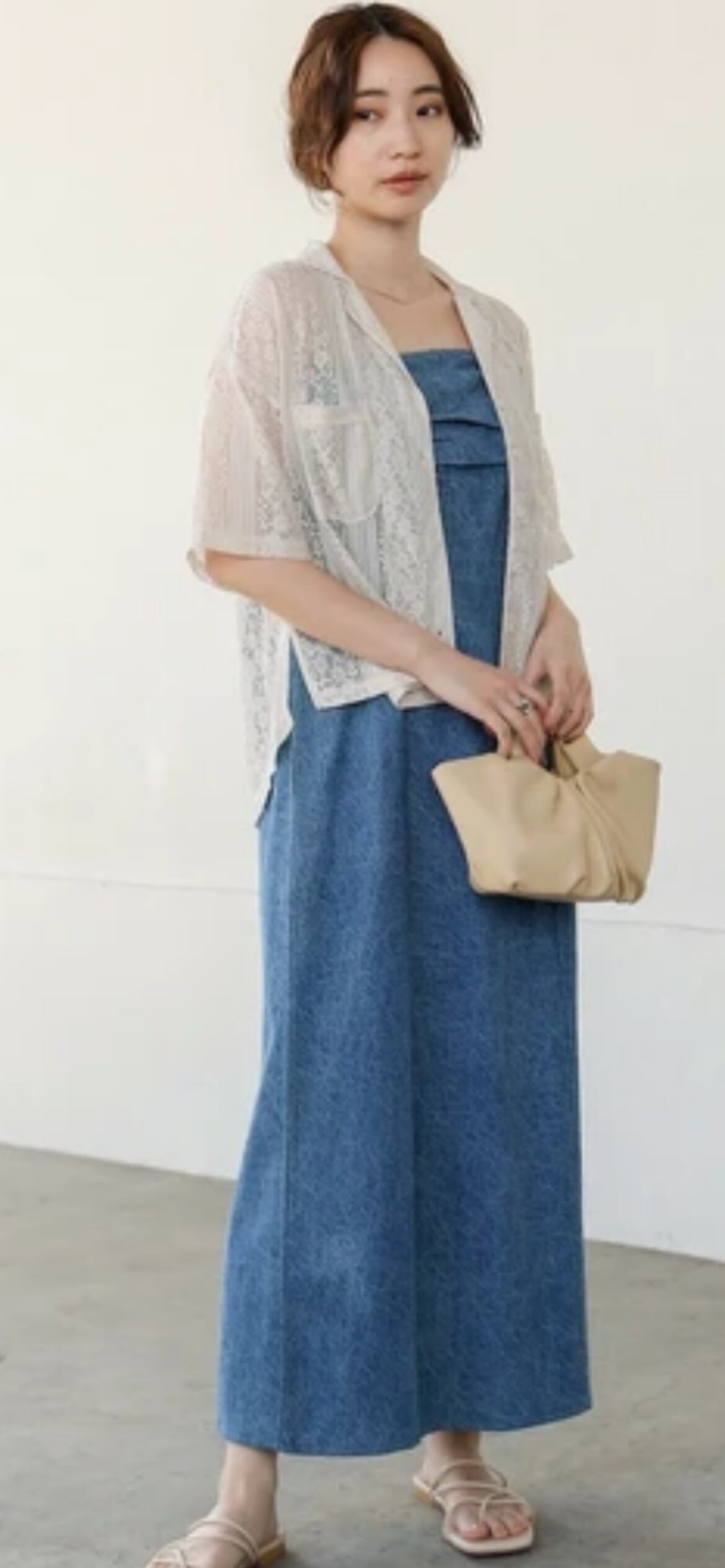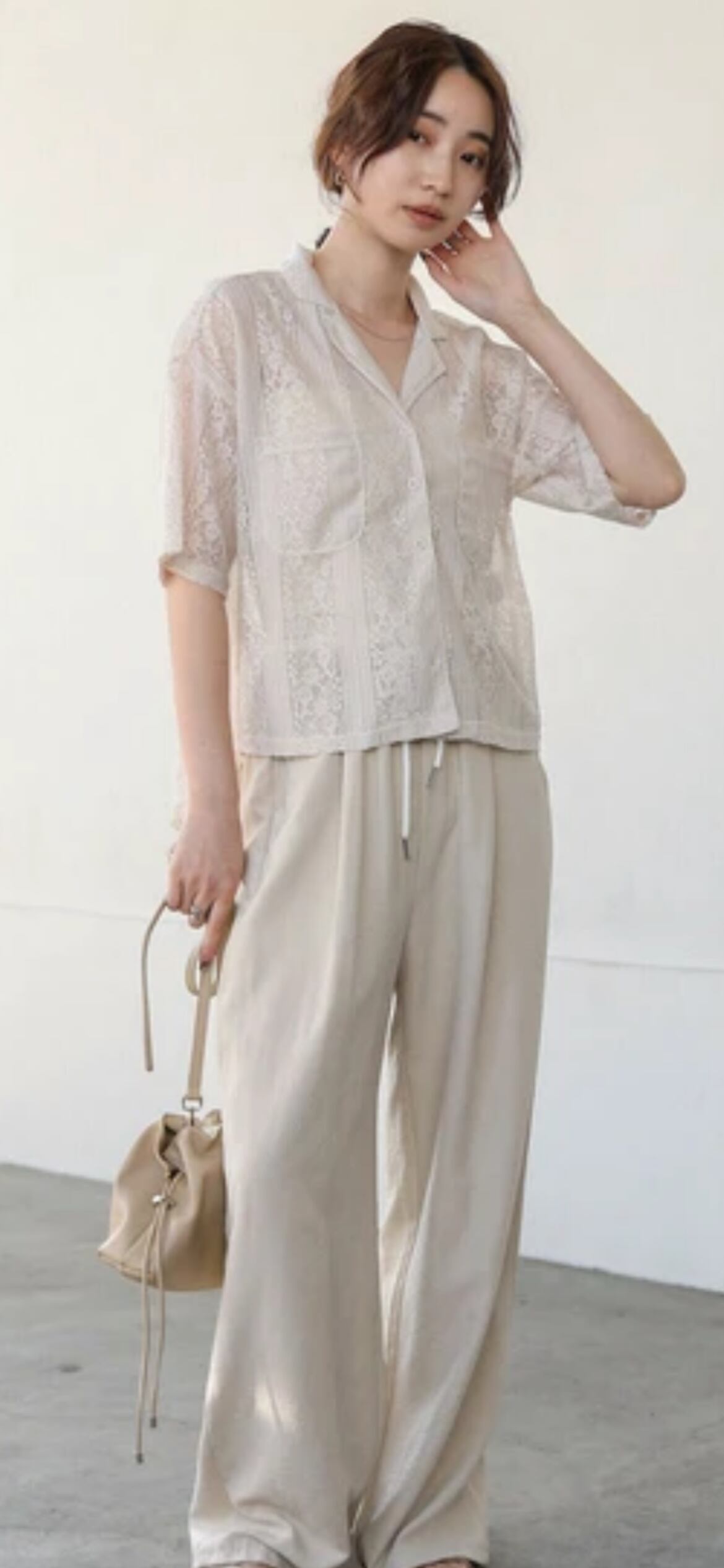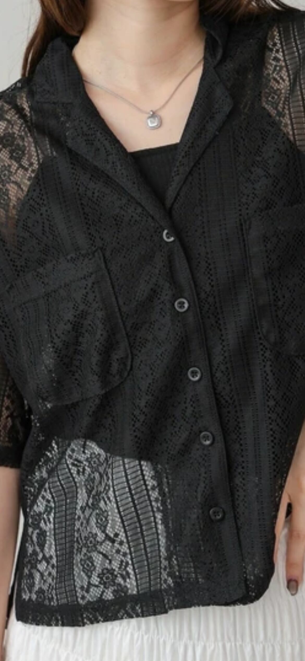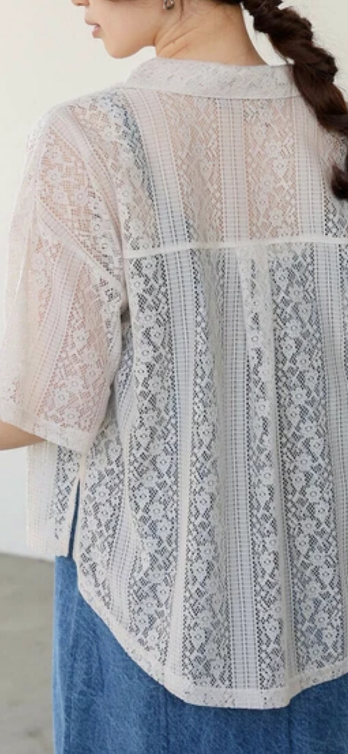 繊細なレースが目を惹く、上品で女性らしい印象のブラウスが登場。軽やかな素材感で、春夏のコーディネートにぴったりの一枚です。首元はすっきりとした襟付きシャツ仕様で、アクセサリーとの相性も抜群。