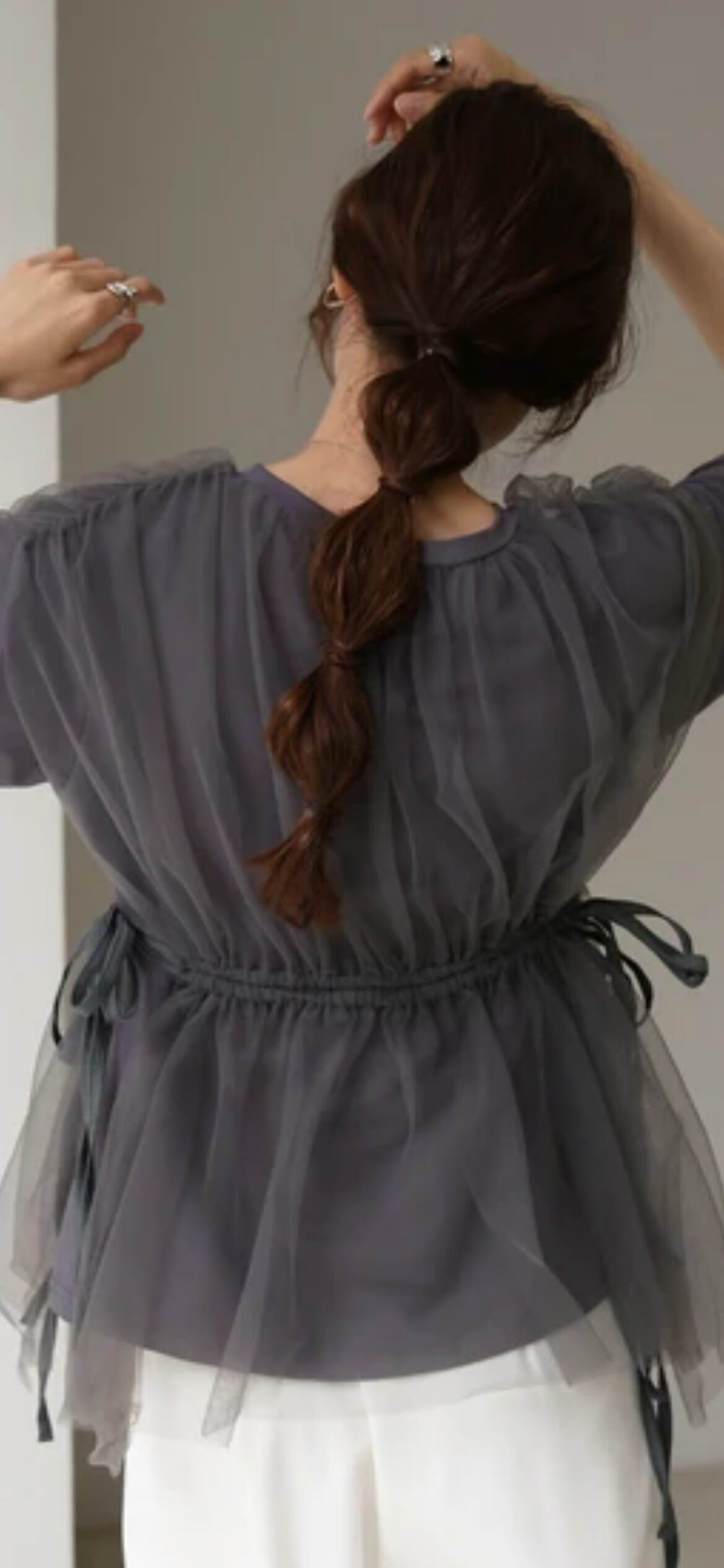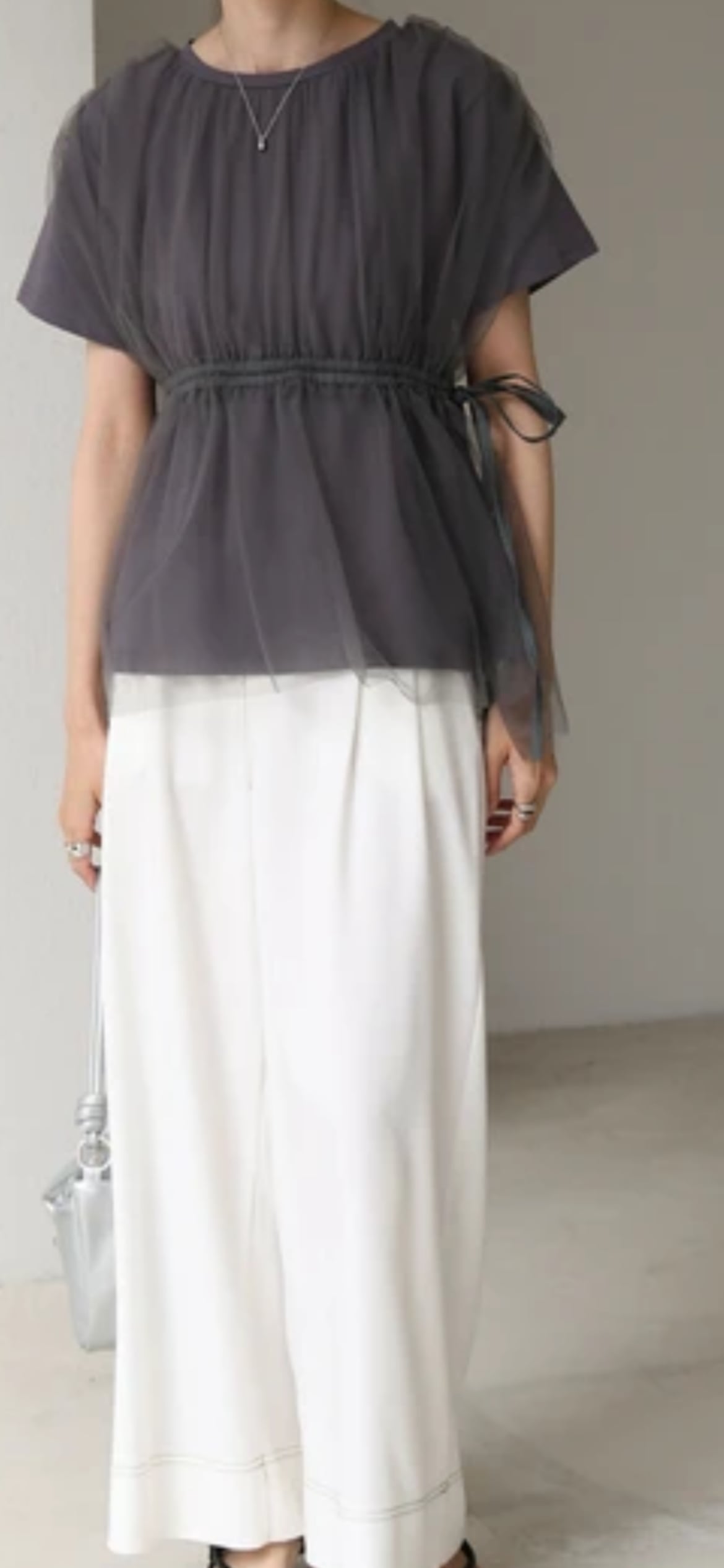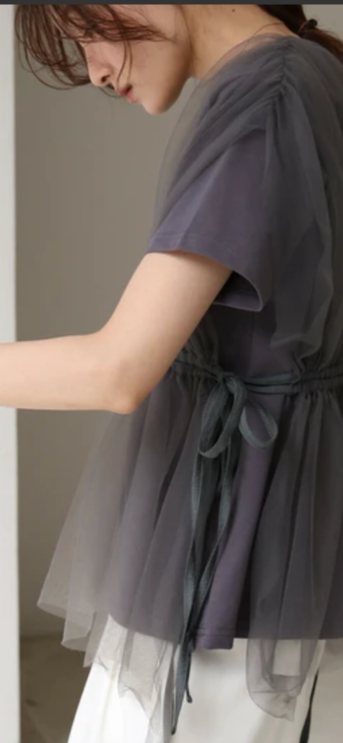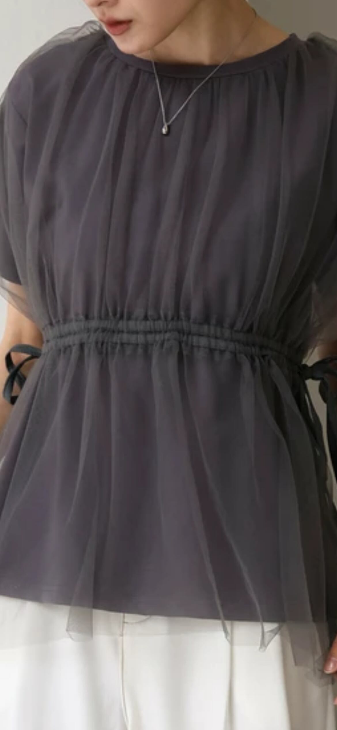 チュール生地は若干ハリがあり、ふわっとしたシルエットが保たれエアリー感があります。カットソー生地はこれからの時期に嬉しい吸湿性も期待できる綿の混紡です。