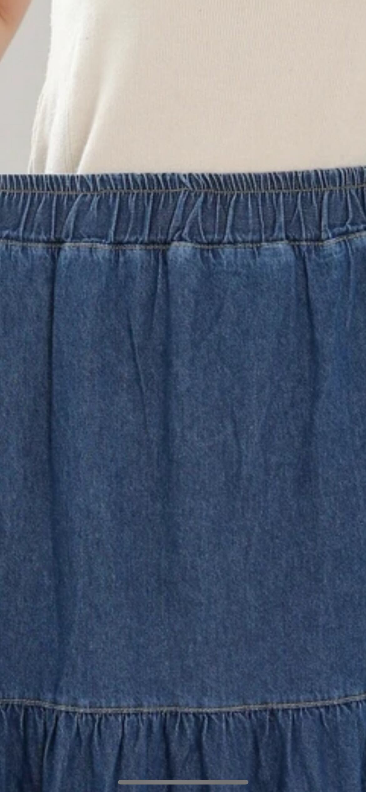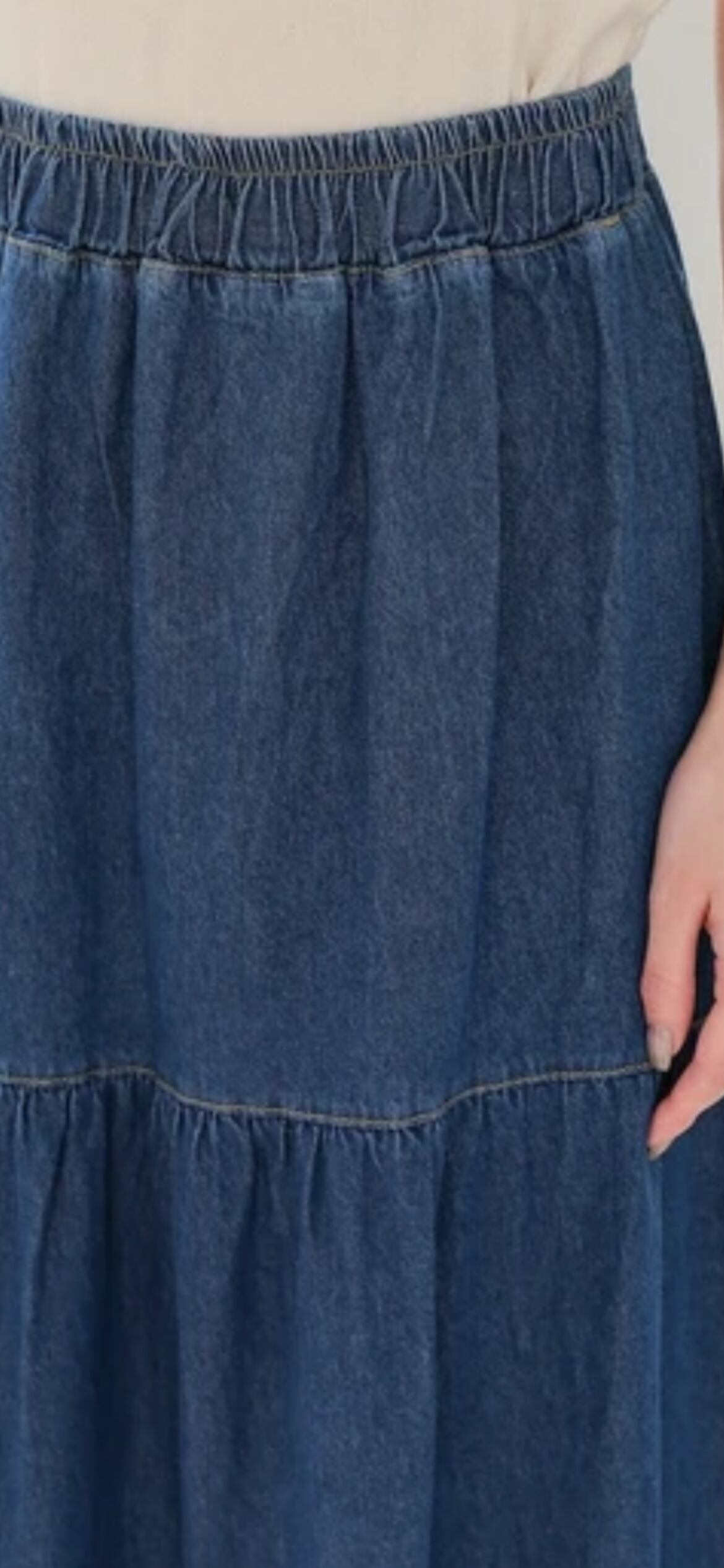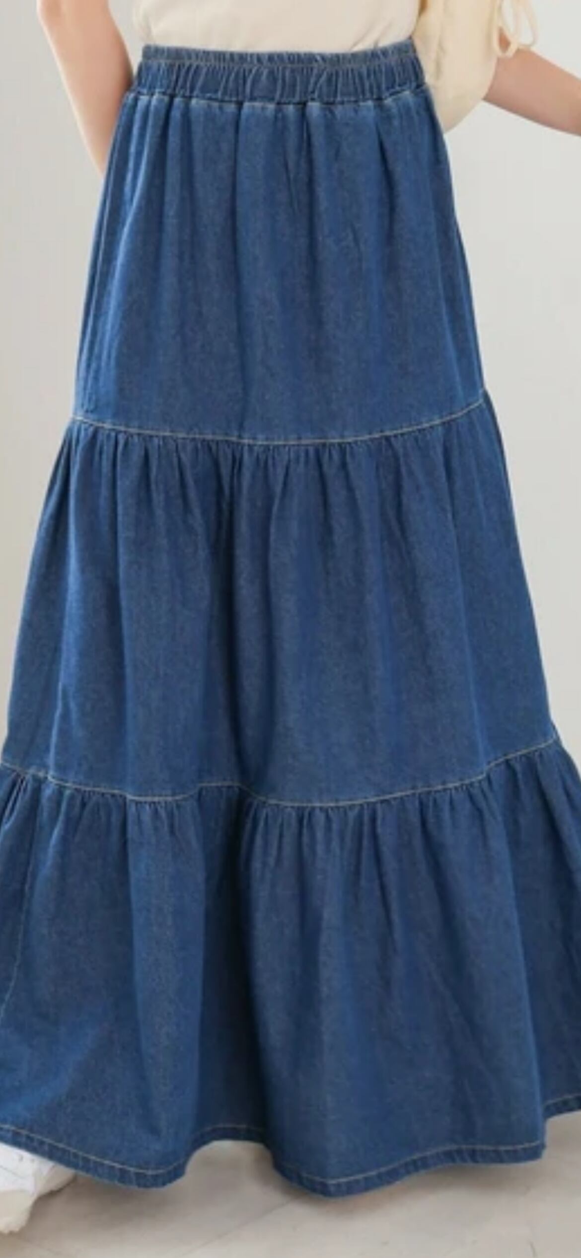 デニム生地で広がりすぎない2段ティアードのスカート!ベーシックなデニム素材は着回し抜群で様々なコーデに馴染みます。動くたびに裾が揺れるので、大人可愛い雰囲気を演出。ウエストはオールゴムなので着脱しやすいのもおすすめポイントです。