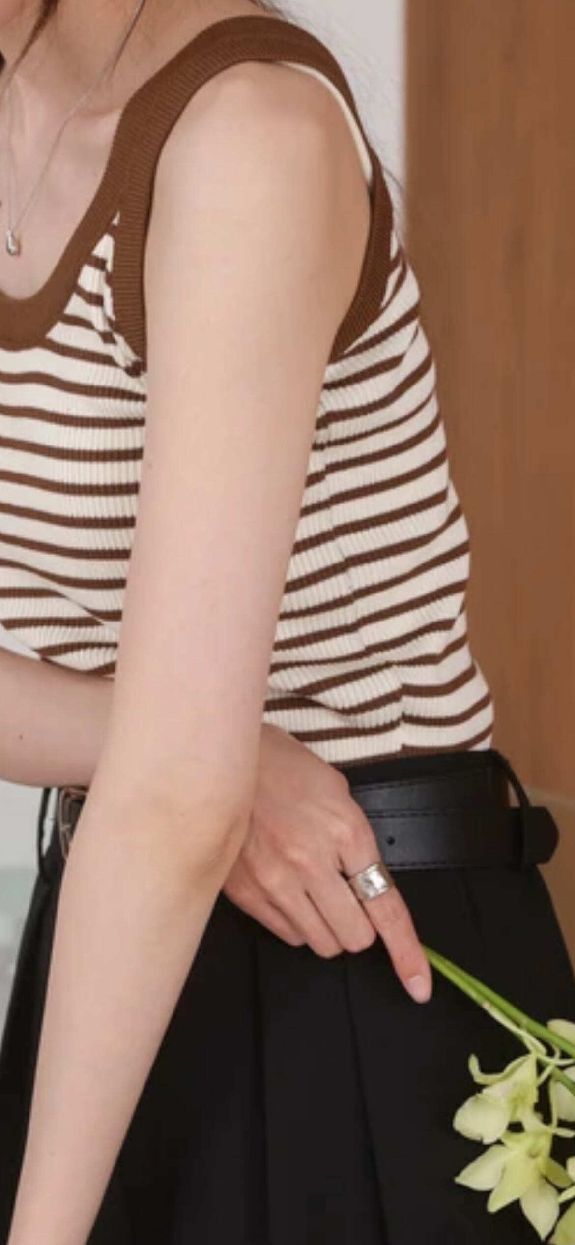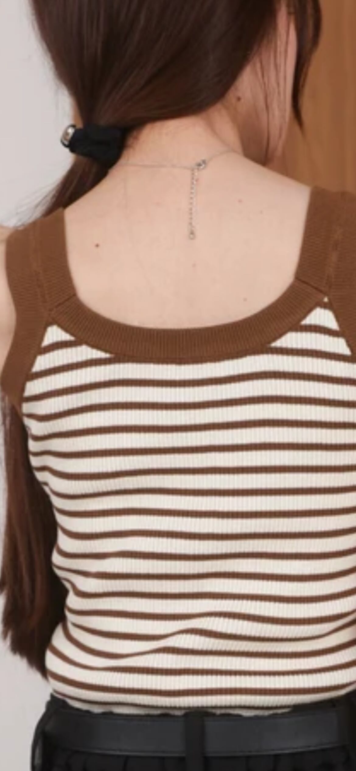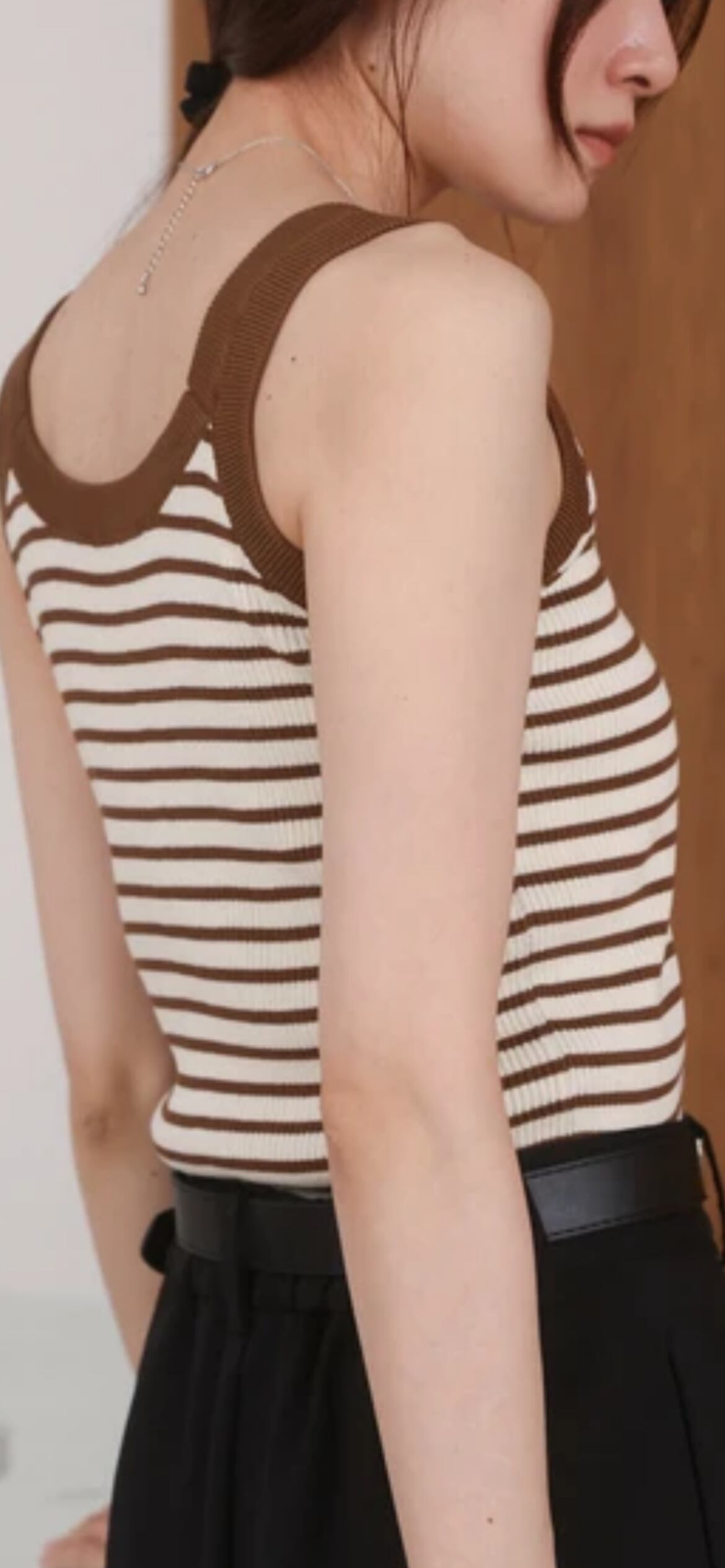 ボーダー柄の一枚で着映えするタンクトップが登場。しっかりと幅のあるショルダーストラップで、柄に合わせてバイカラーになっているのもポイント。伸びのある素材でストレスフリーな着心地です。