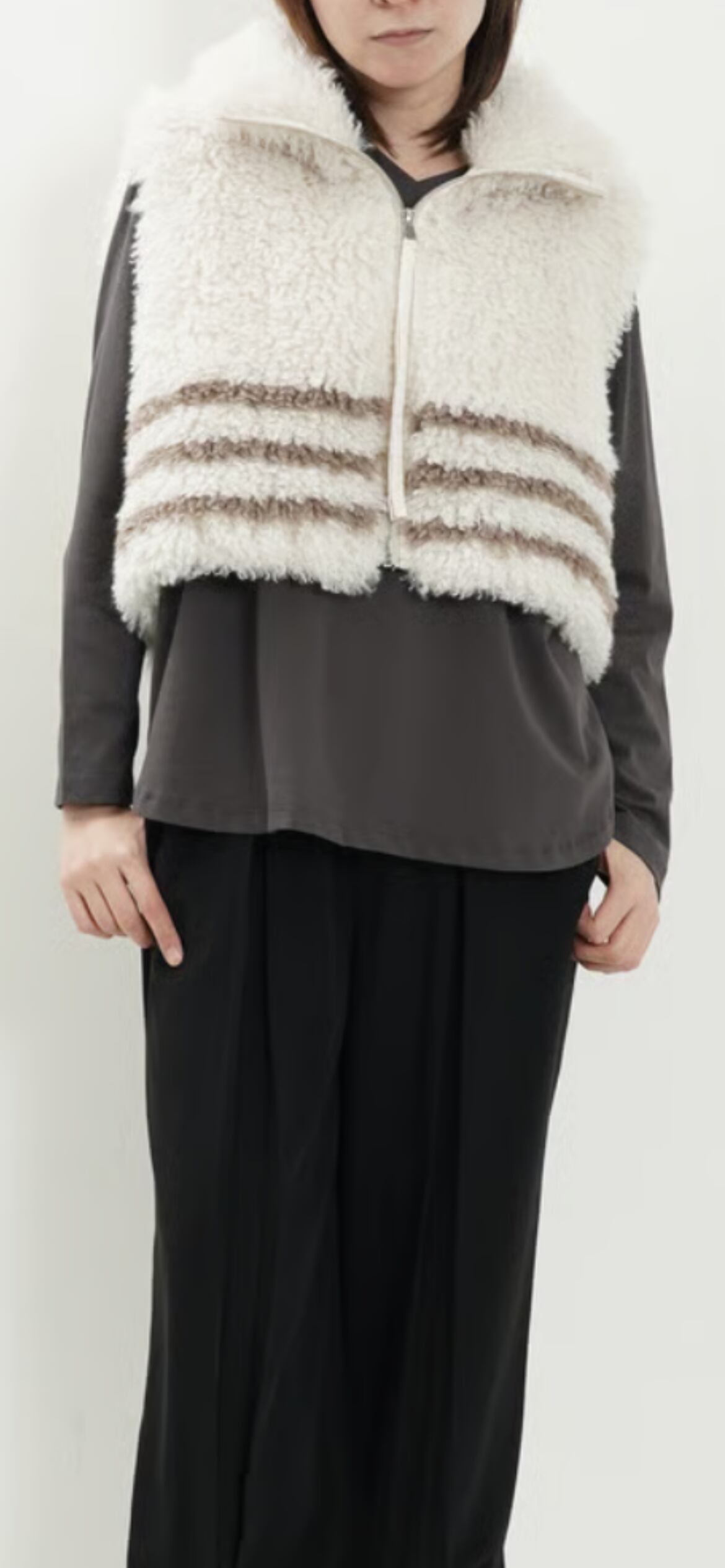まるでプードルのようなふわふわとした毛並みがかわいいフェイクファーショートベスト。プルオーバーや羽織として2WAYで使えるトレンドのクロップ丈でいつものコーディネートにプラスするだけで、ぐっとシーズンムードが高まるアイテム。Tシャツやカットソーに重ねてカジュアルに、ワンピースやブラウスに羽織ってフェミニンにと、幅広いスタイリングを楽しめます。軽やかな着心地で、気軽にトレンドを取り入れられる一枚です。