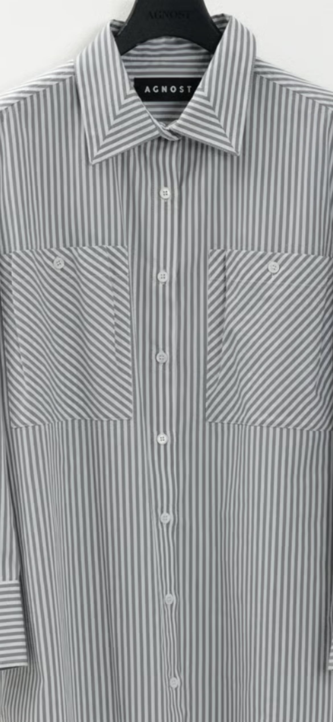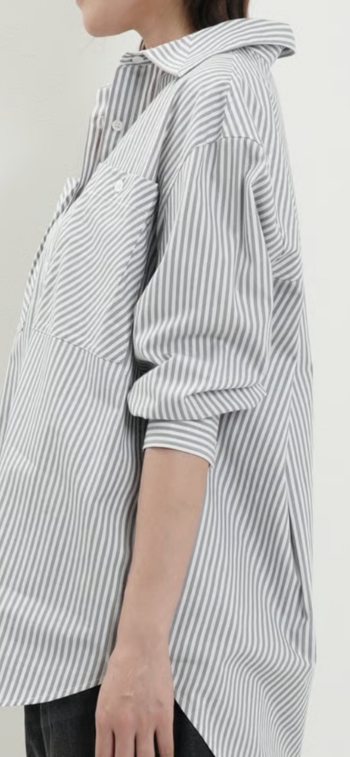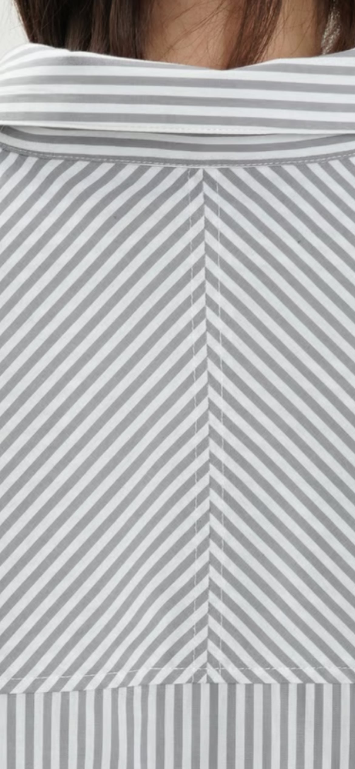 コットン100%のホワイトブロードとロンドンストライプのアソート展開が魅力のオーバーサイズシャツ。色展開はベーシックでありながらも、立体感のあるバイアス使いのビッグポケットや、切り替え襟がディテールポイント。スタイリングにモードなアクセントを添える一着です。