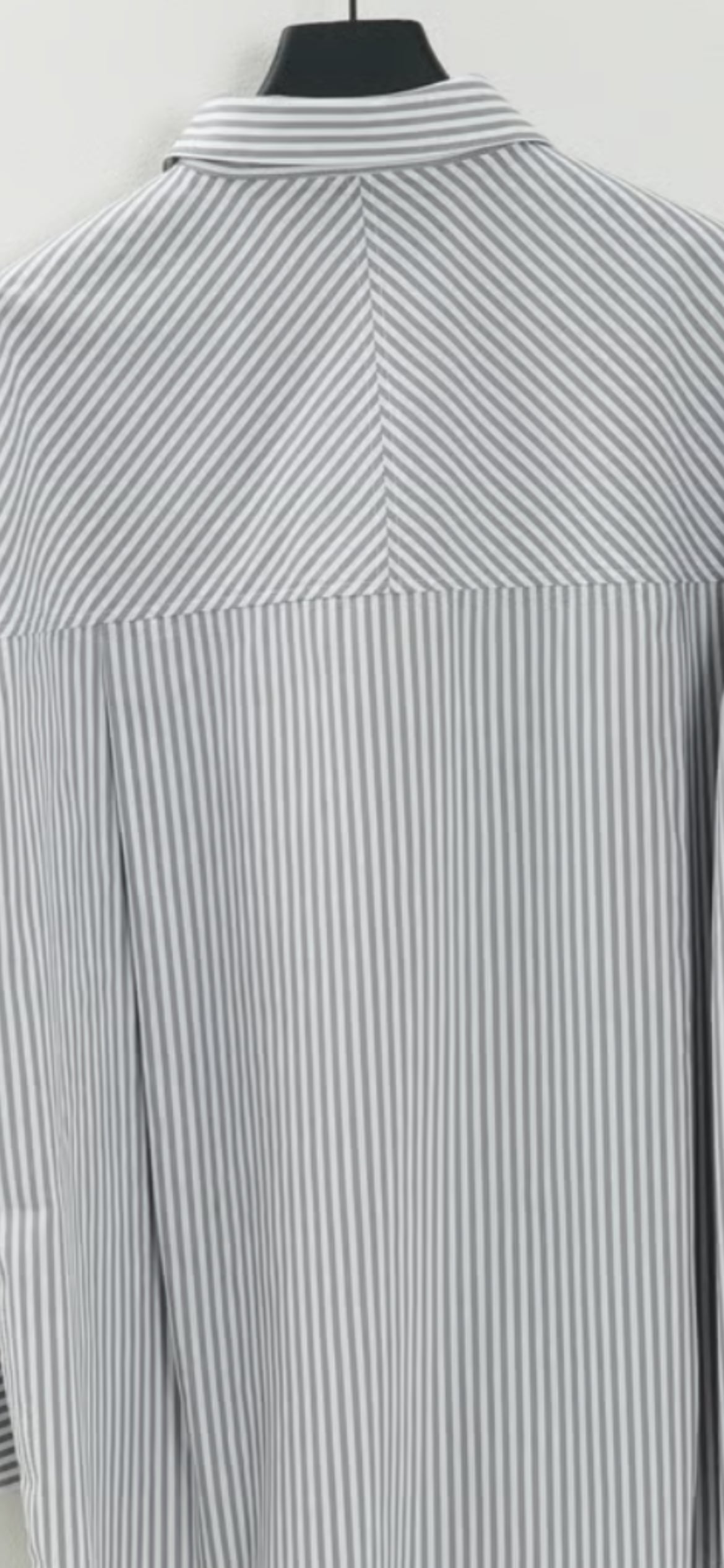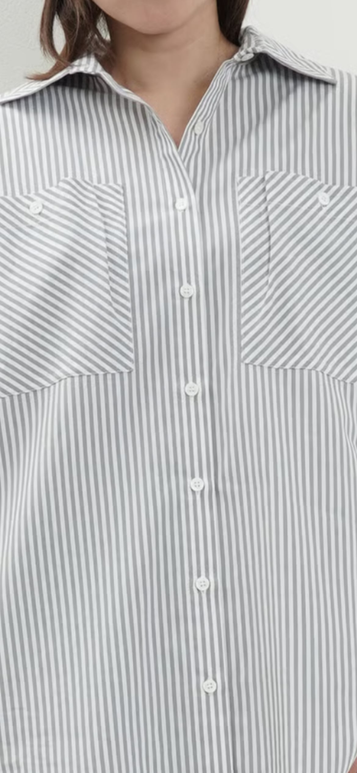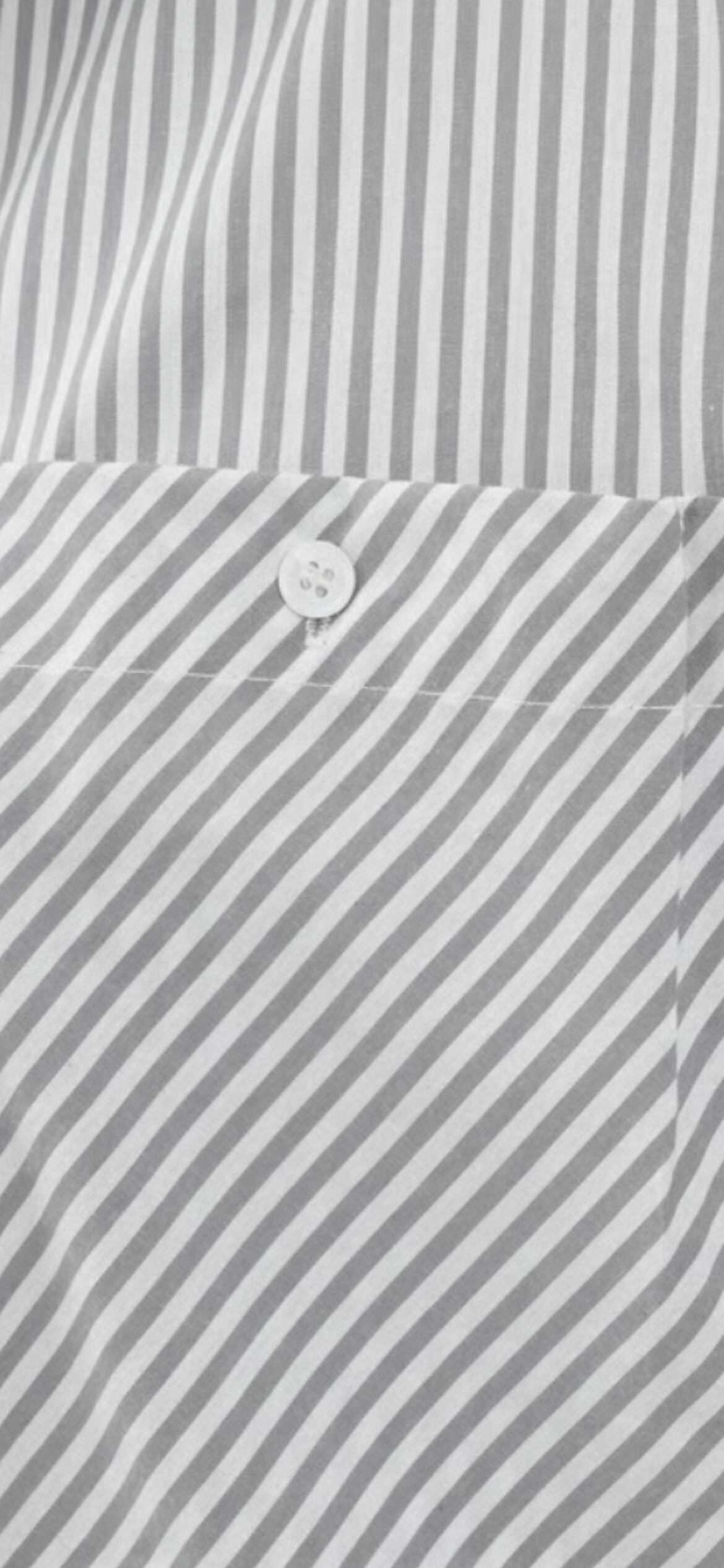 コットン100%のホワイトブロードとロンドンストライプのアソート展開が魅力のオーバーサイズシャツ。色展開はベーシックでありながらも、立体感のあるバイアス使いのビッグポケットや、切り替え襟がディテールポイント。スタイリングにモードなアクセントを添える一着です。