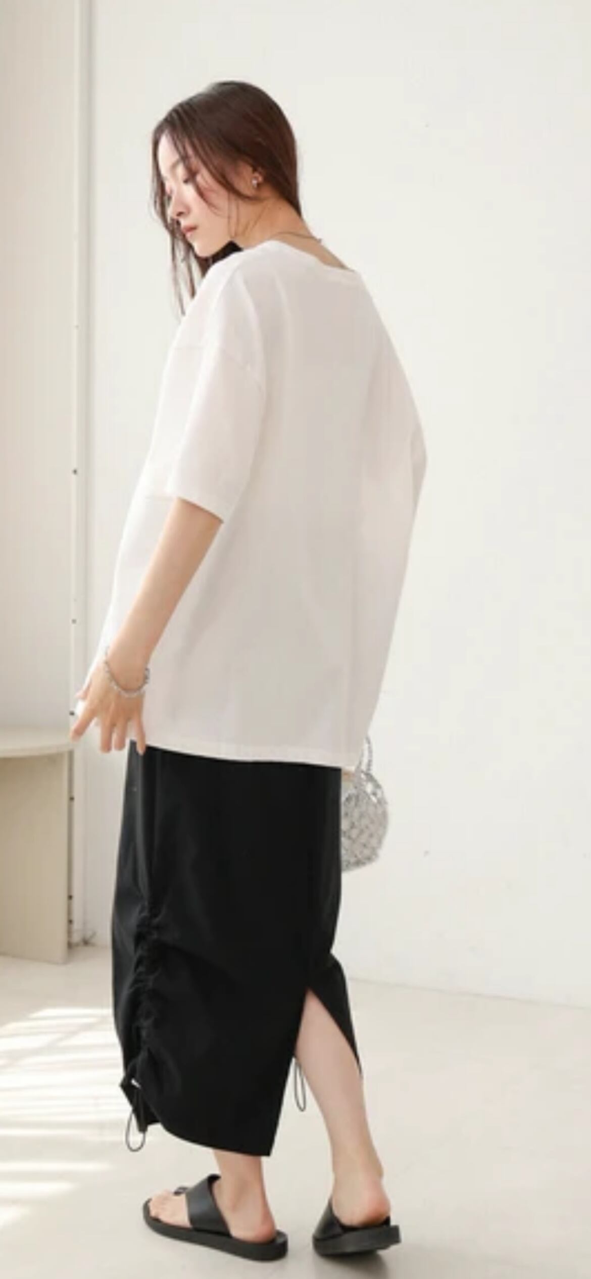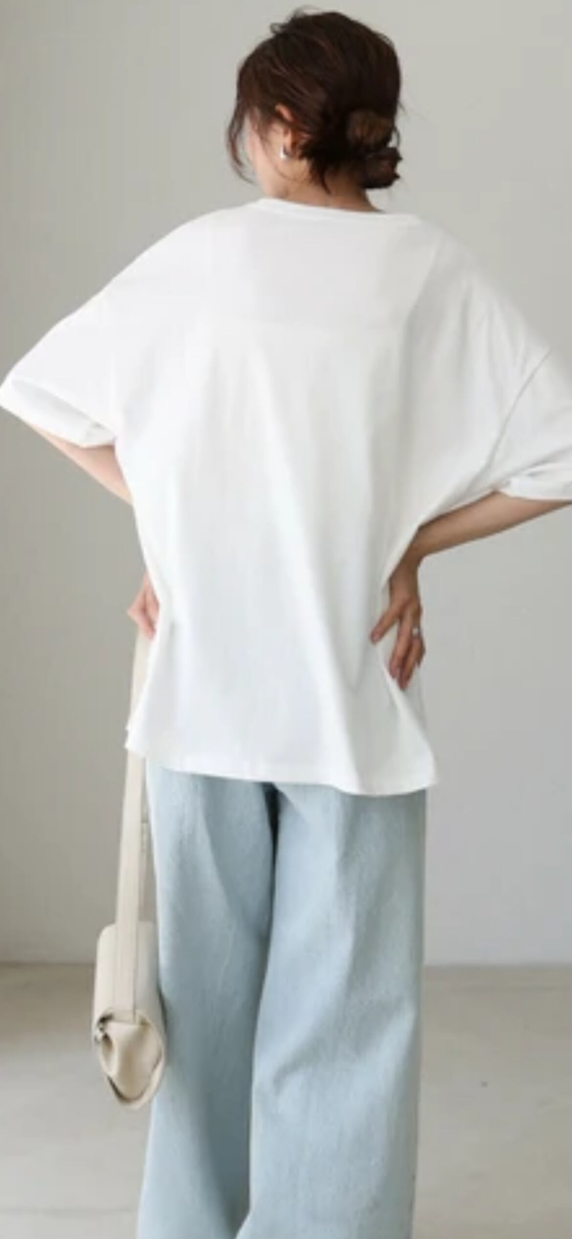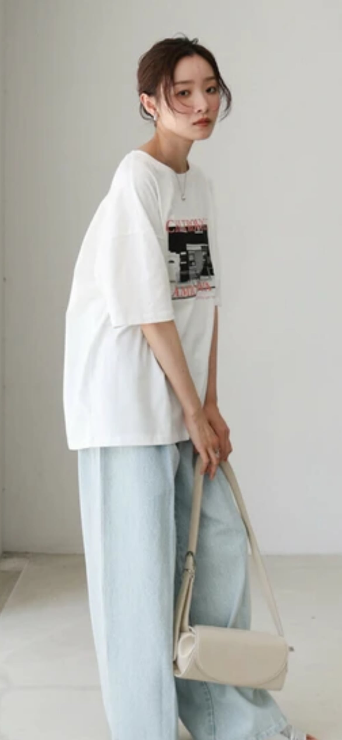 ナチュラルカラーのプリーツスカートやワイドパンツに合わせれば、ほどよく甘さをプラスした淡色コーデに仕上がります。足元は白やベージュのスニーカーやバレエシューズで軽やかに、バッグや帽子はくすみカラーでまとめると全体がふんわり優しい印象に。Tシャツはオーバーサイズでゆるっと着るのがおすすめ。