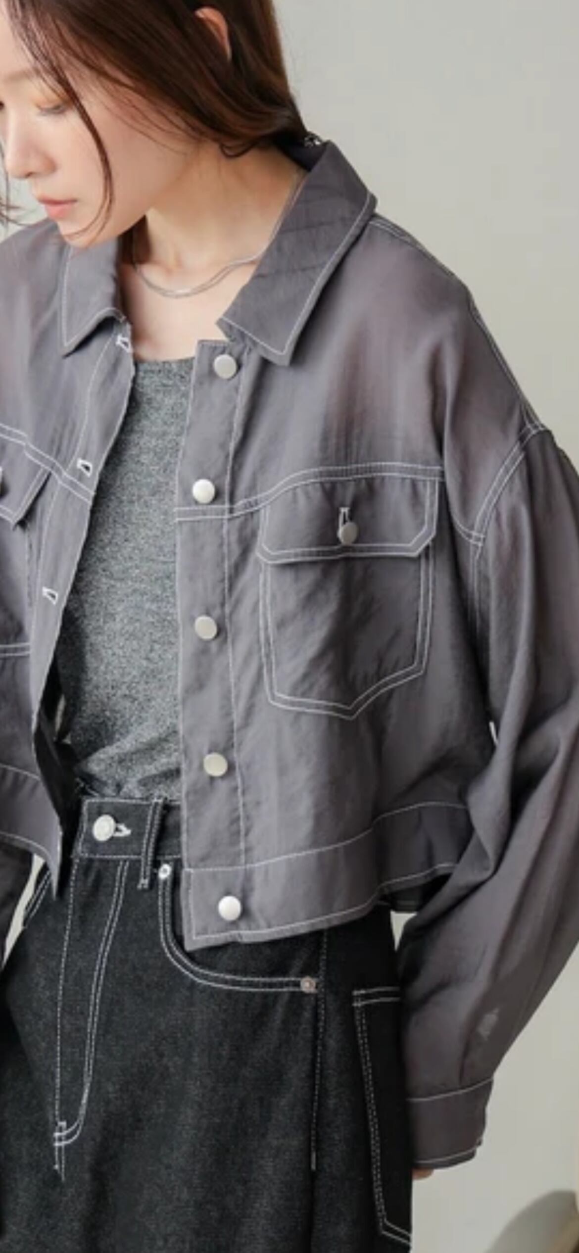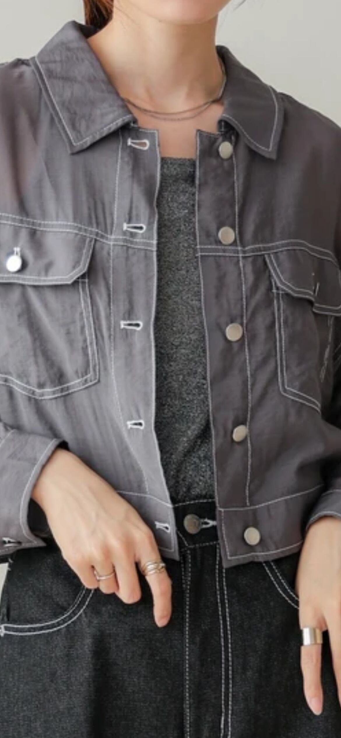 目を引く配色ステッチで遊び心溢れるシアー素材のブルゾンが登場しました!デニムジャケット風の一癖あるデザインがシンプルなコーディネートにアクセントをつけます。適度な透け感でシアー初心者さんでも手に取りやすい1枚。マットなネオバボタンが優しい風合いの中に高級感とクールさを演出し、モードな見た目ながら様々なシンプルアイテムに合わせやすい旬なアイテムです。