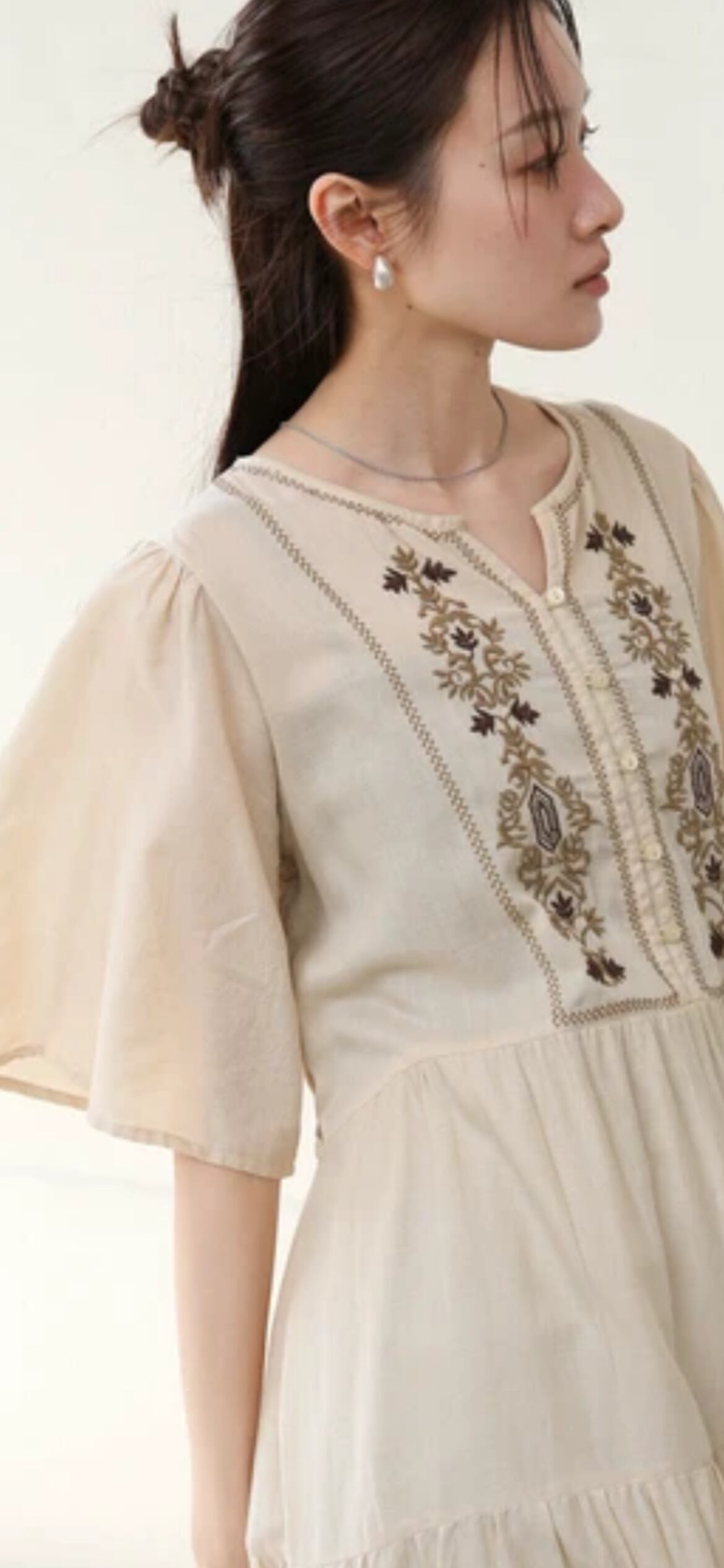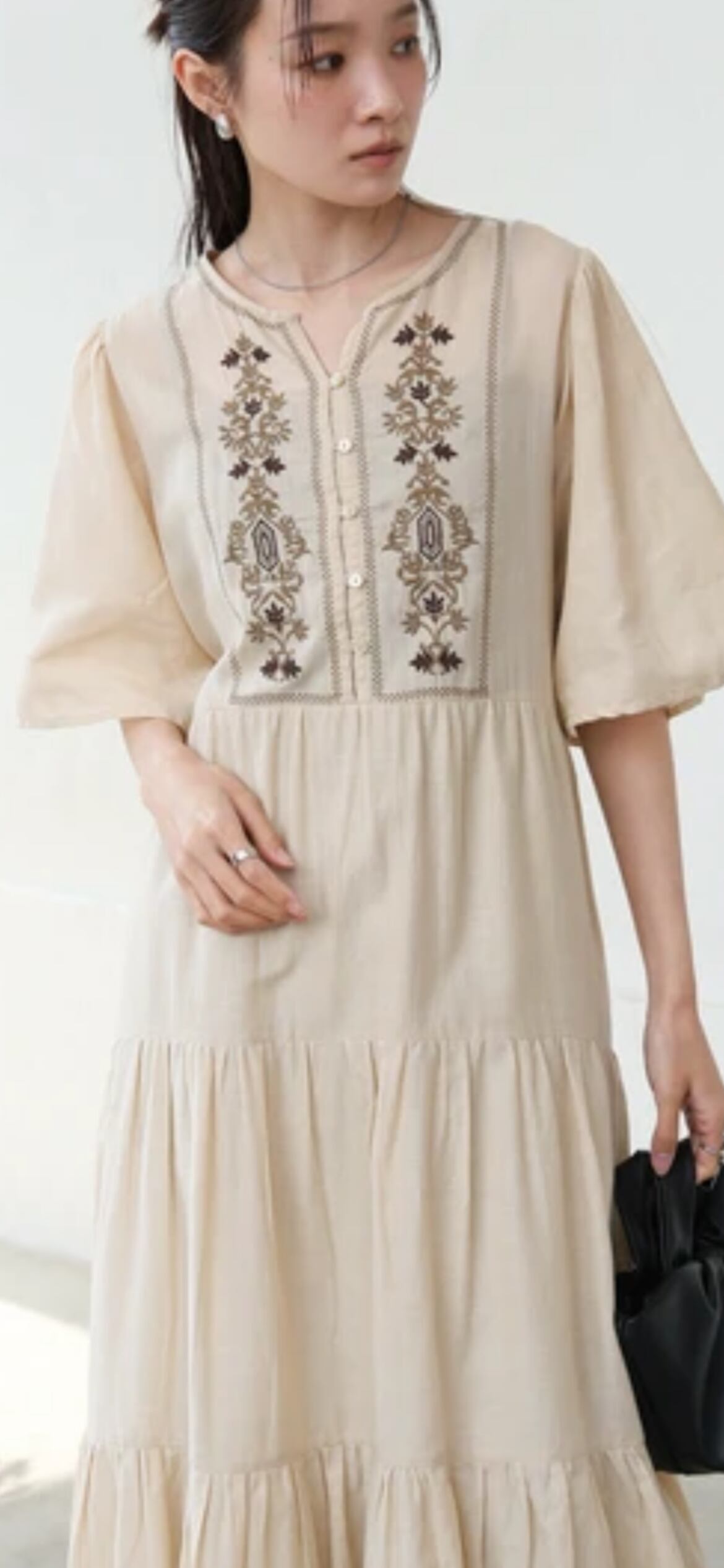 胸元に施された刺繍が魅力的なワンピース。全体的にゆったりとしたシルエットでリラックス感がありつつ袖などにたっぷりとギャザーが入っていて女性らしい雰囲気も。3段ティアードになっており締め付けなく1枚でラフに着用できるワンピースになっています。