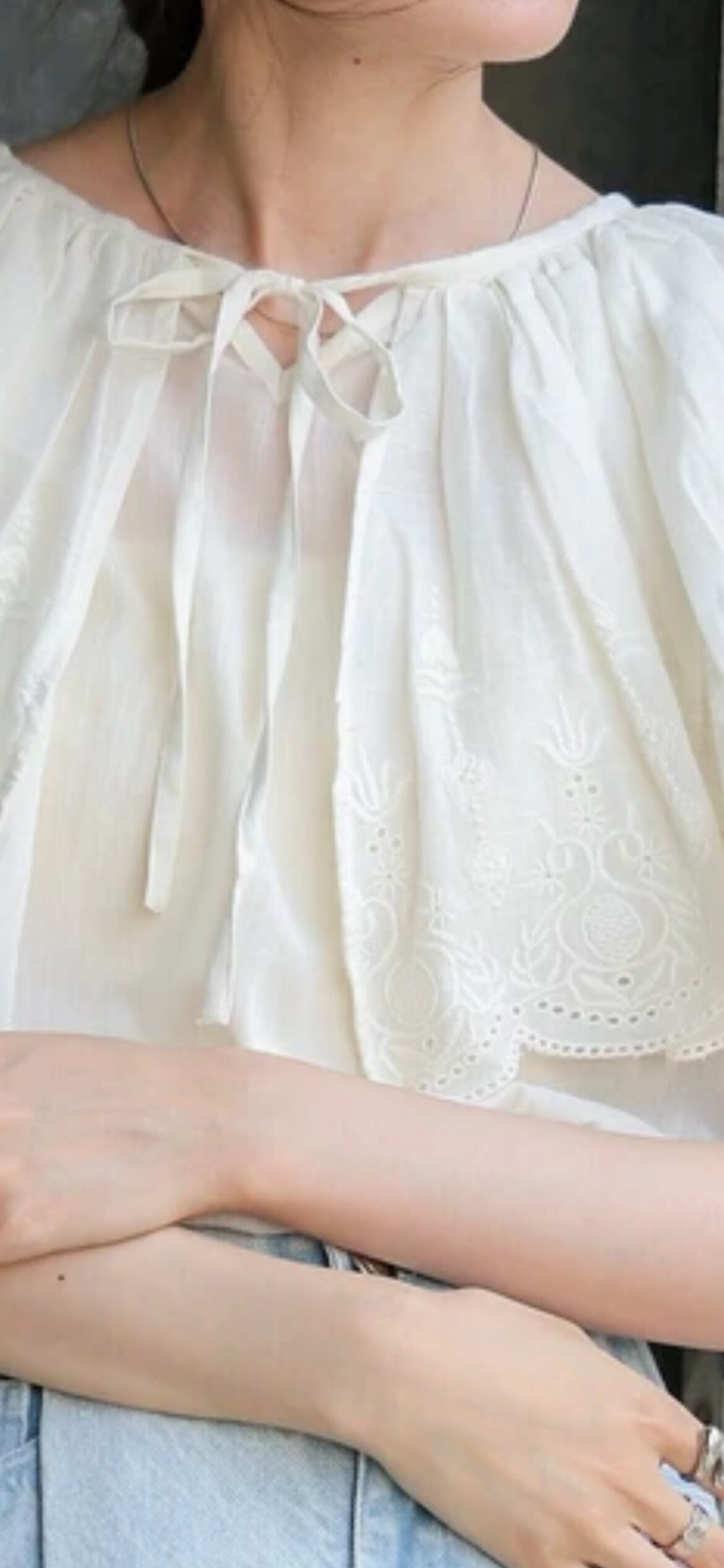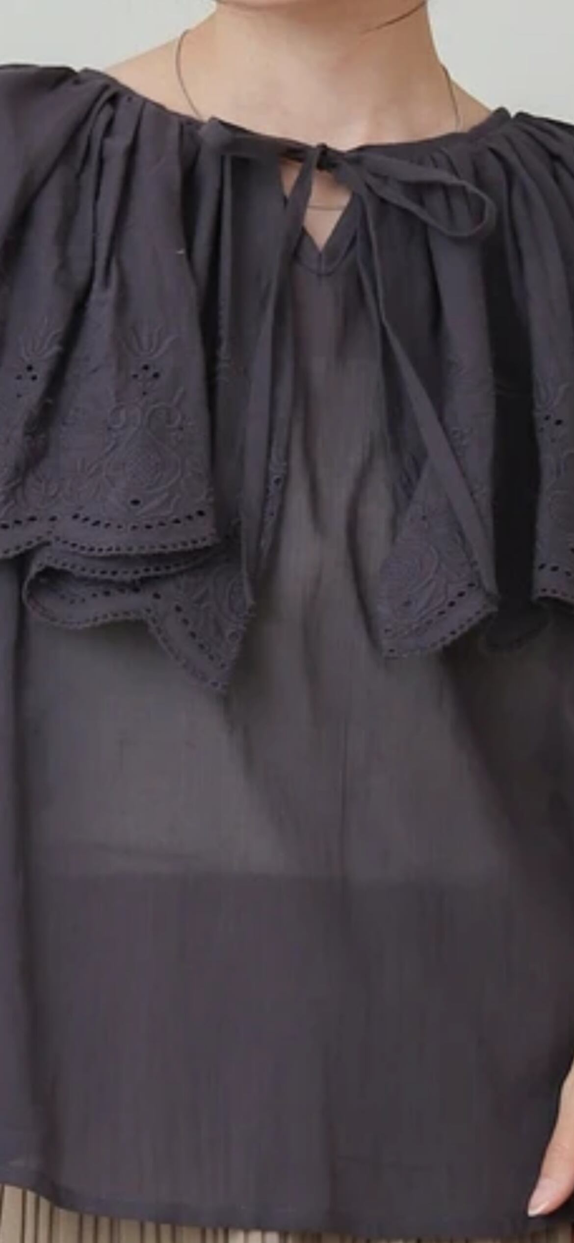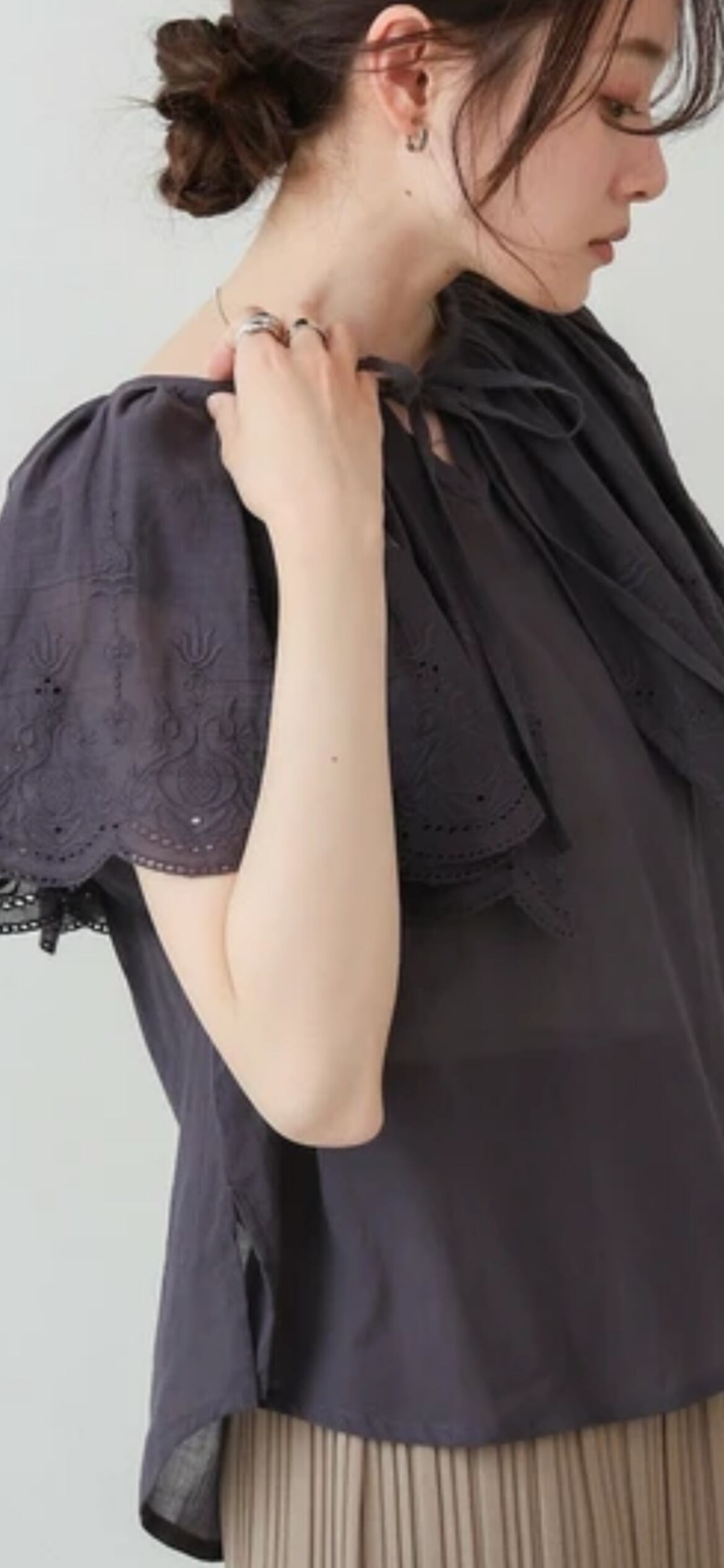 ふんわりとした質感が特徴のコットンボイル生地のブラウスが登場!肩から胸元にかけてフリルケープ風デザインになっており、顔周りに華やかさと立体感をプラス。ボリューム感があるため華奢みえ効果も◎レースの透け感がナチュラルでありながら大人の上品さを演出。フリル部分にはパンチングレースが施されており、繊細でフェミニンな印象を出してくれます。