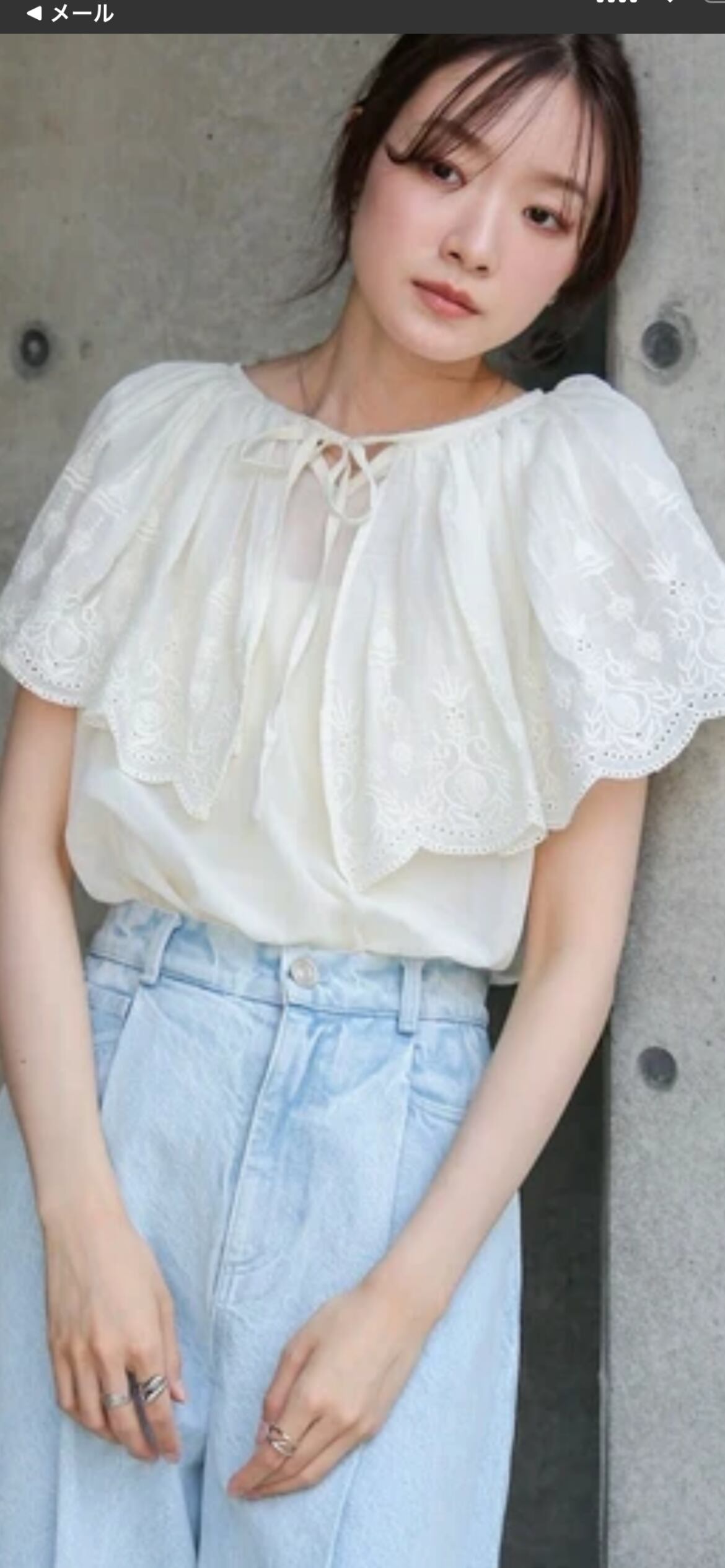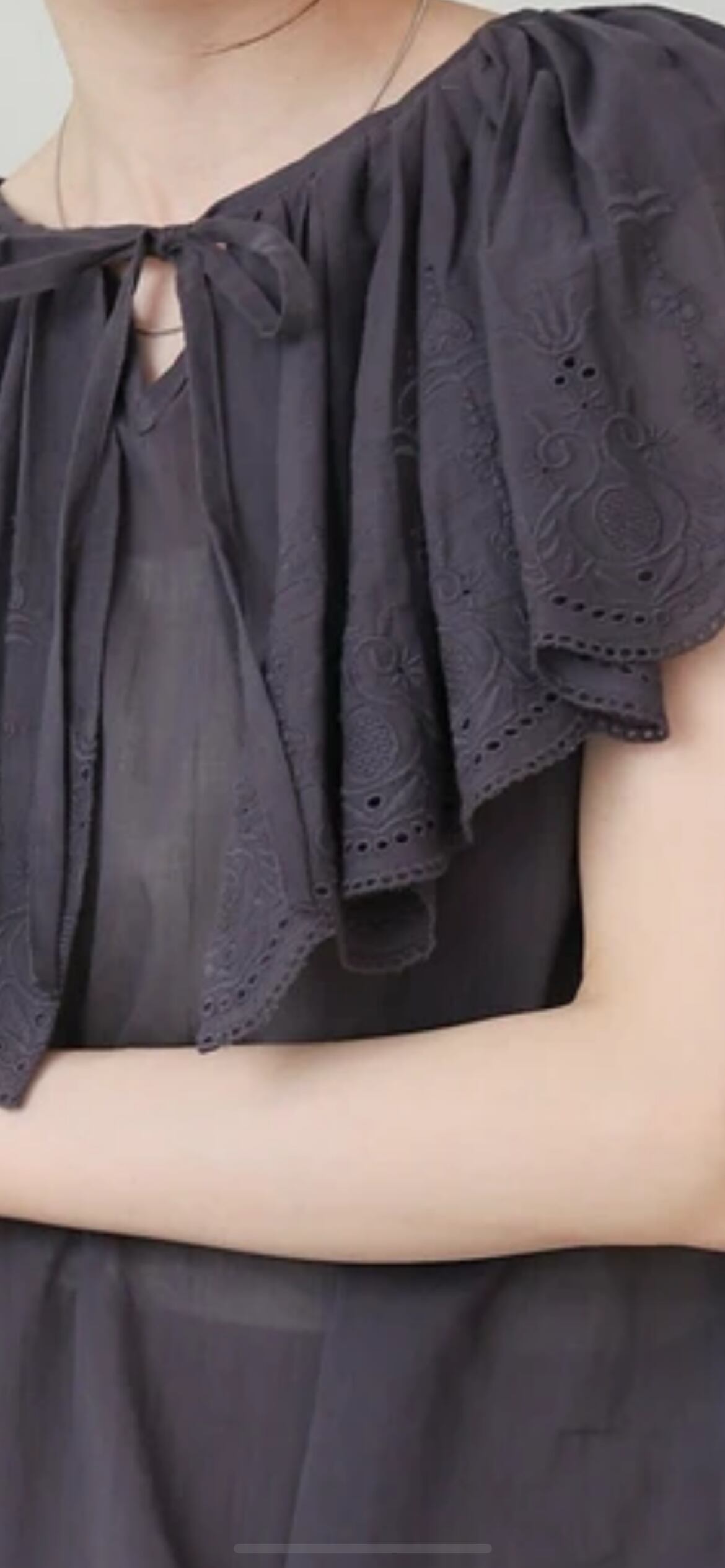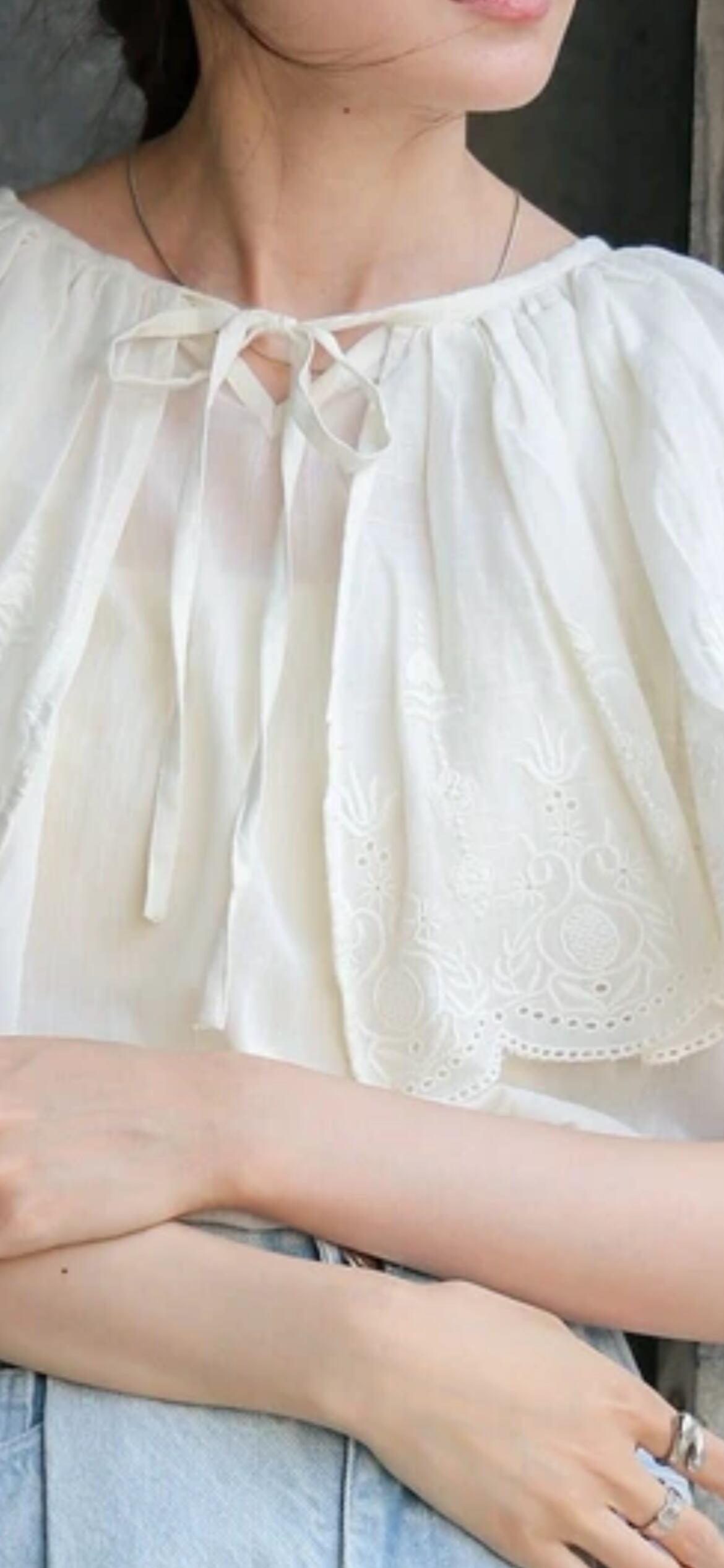 ふんわりとした質感が特徴のコットンボイル生地のブラウスが登場!肩から胸元にかけてフリルケープ風デザインになっており、顔周りに華やかさと立体感をプラス。ボリューム感があるため華奢みえ効果も◎レースの透け感がナチュラルでありながら大人の上品さを演出。フリル部分にはパンチングレースが施されており、繊細でフェミニンな印象を出してくれます。