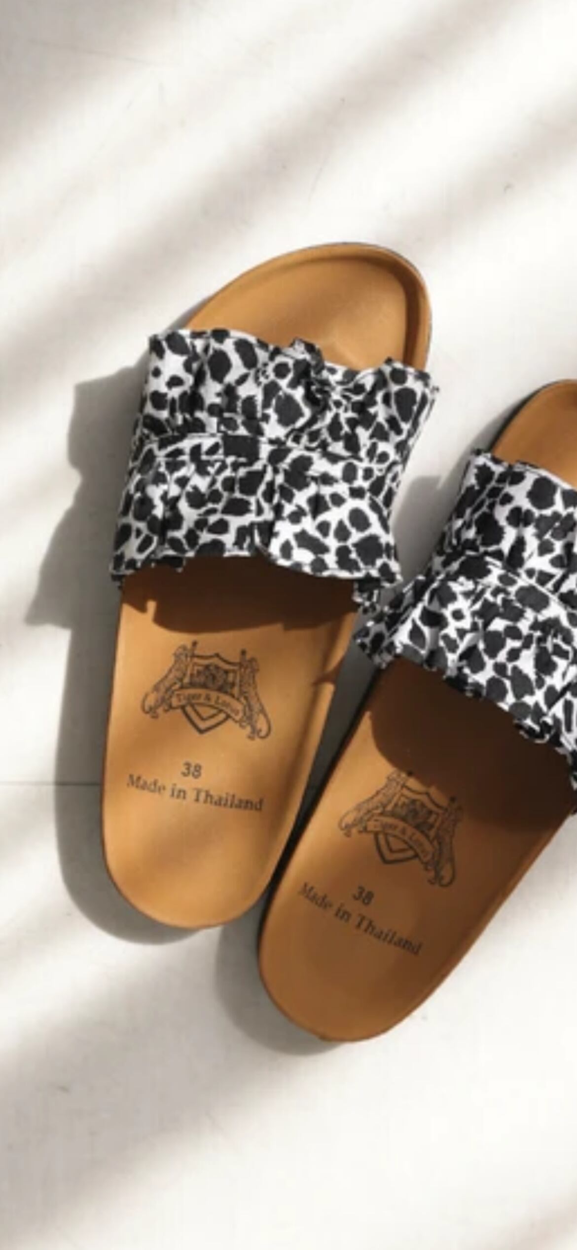 モノトーンのレオパード柄に立体感のあるフリルをあしらったアッパーデザイン。