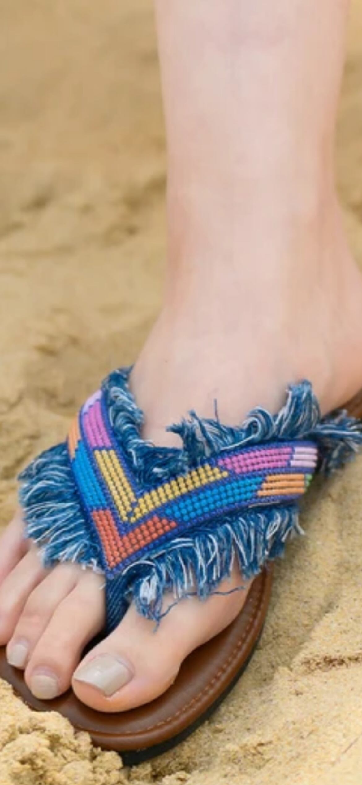 ナチュラルな風合いのフリンジと、きらりと輝くビーズが目を惹くトングサンダル。