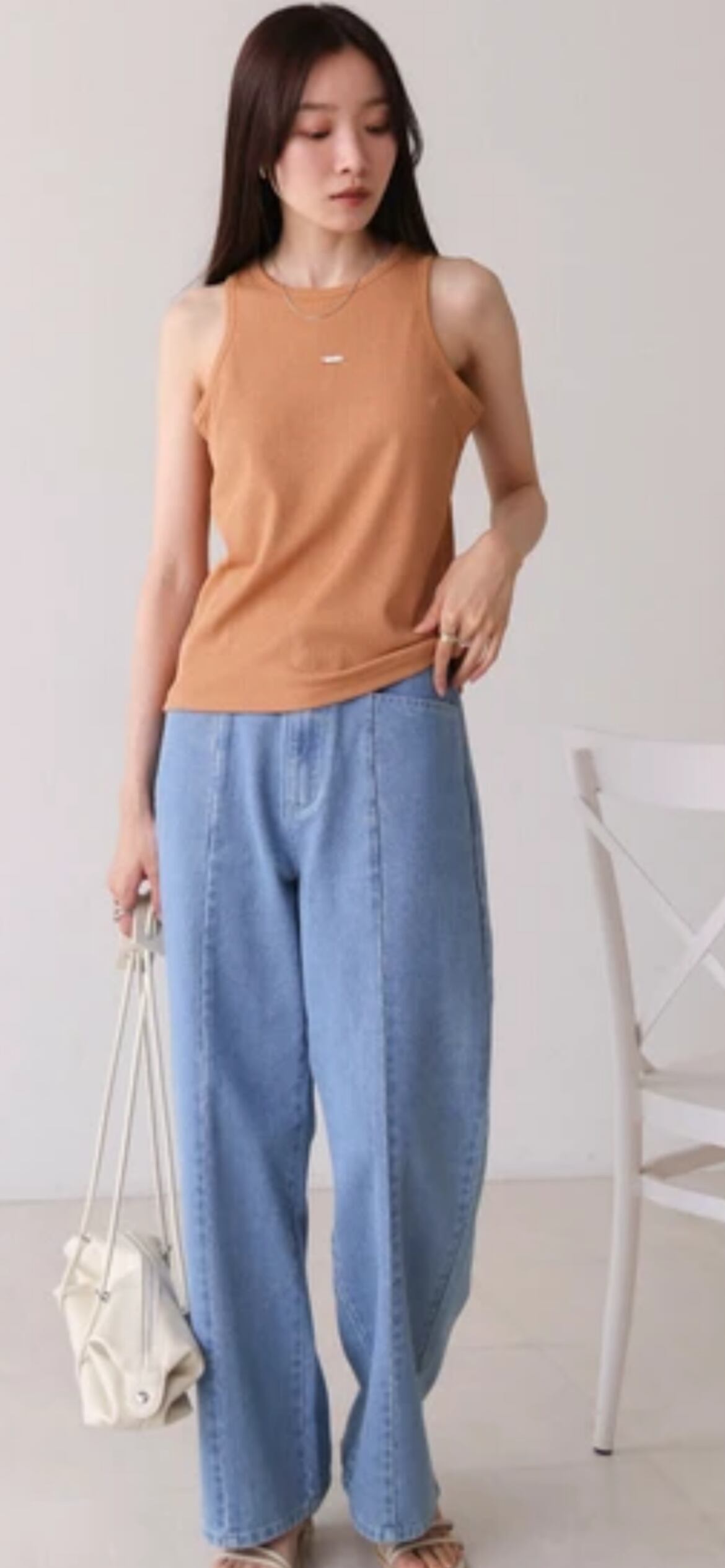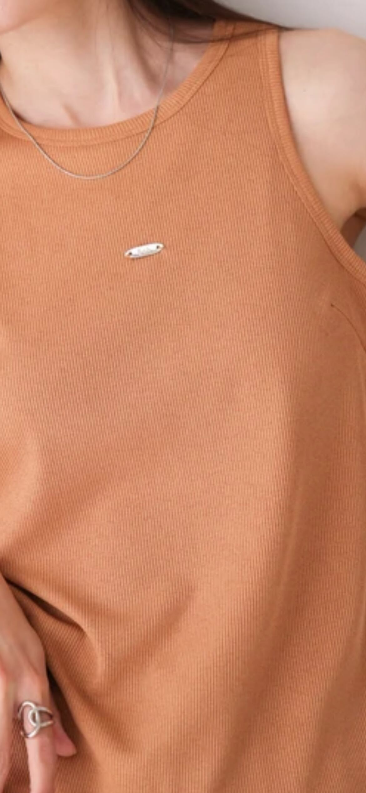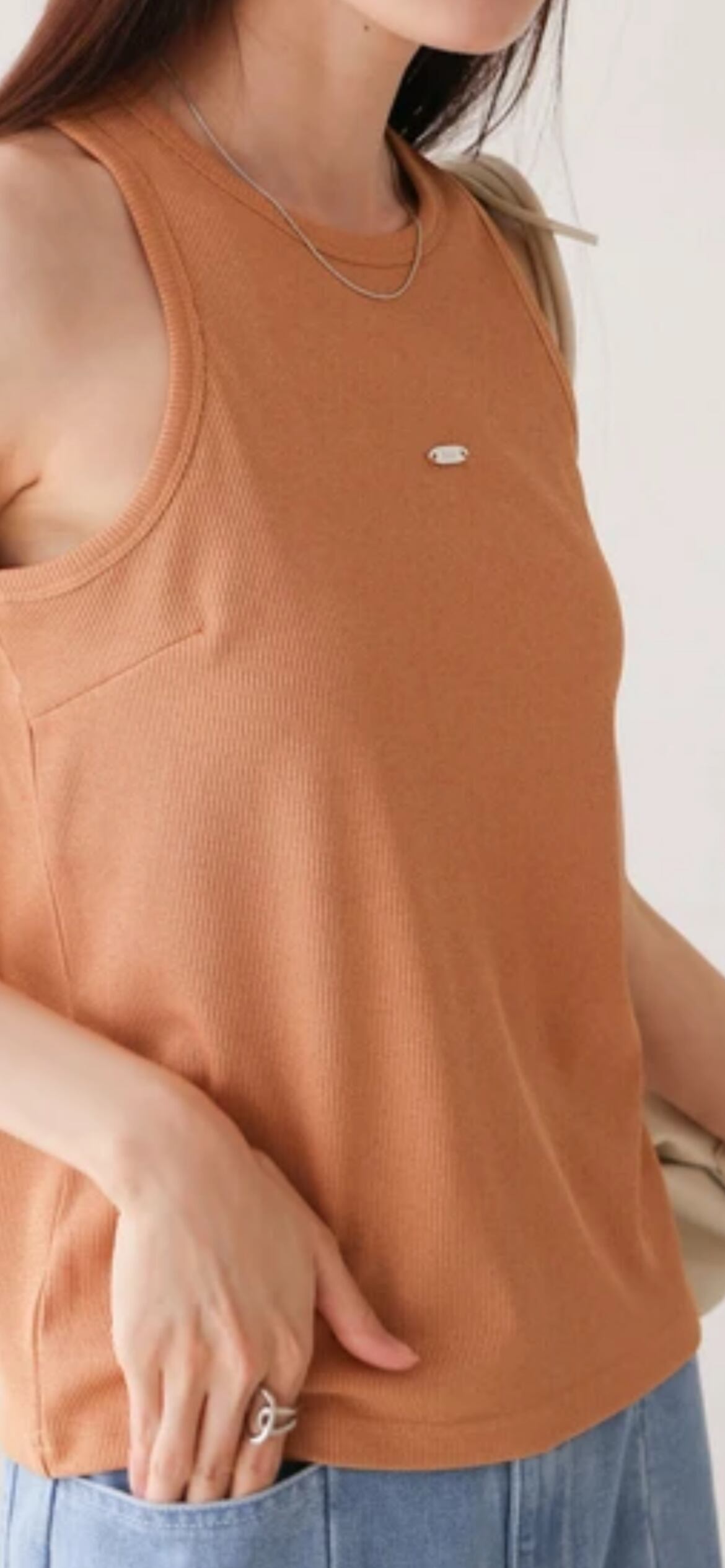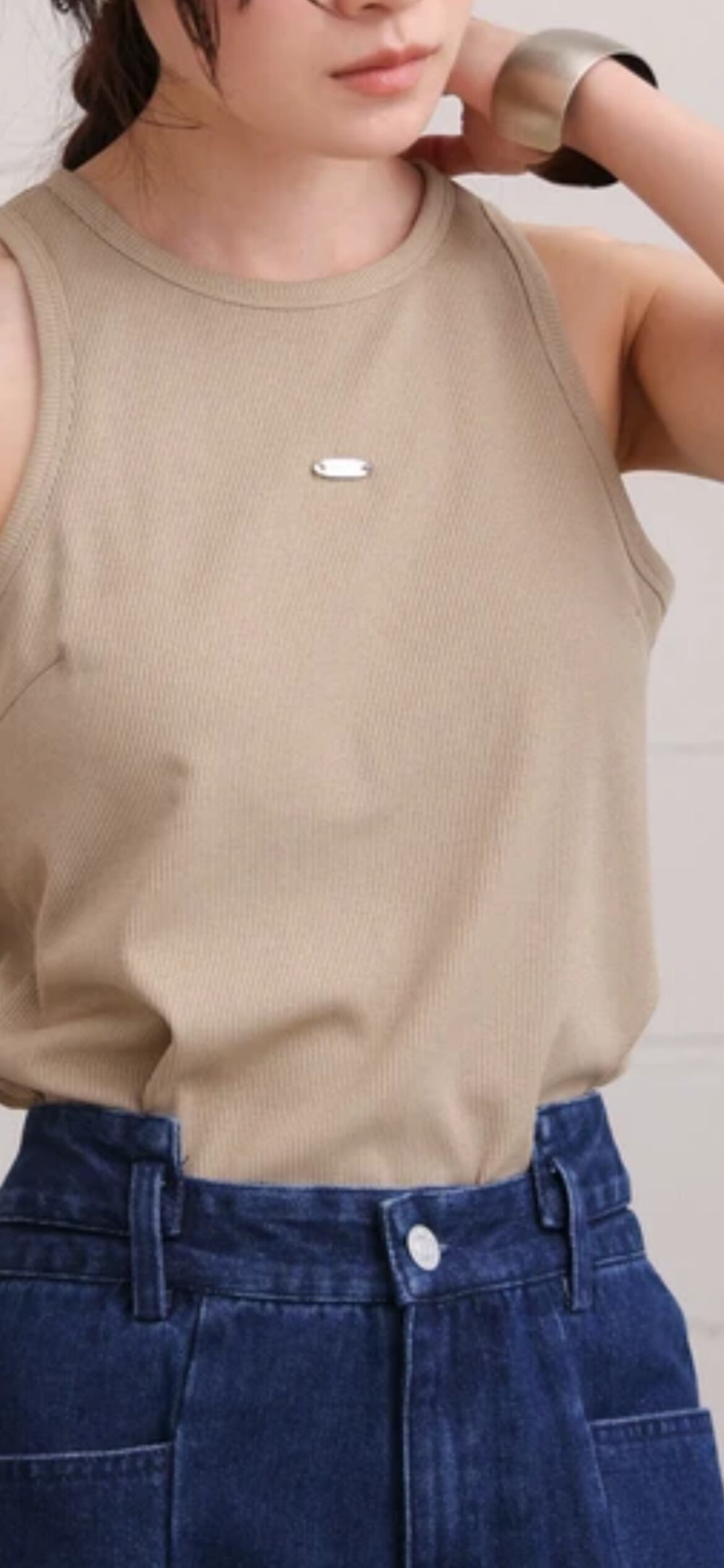 ロゴプレートがきらりと目を惹くアメスリタンクトップが登場!伸縮性のあるリブニット素材が程よくフィットして快適な着心地です。アメリカンスリーブの仕様でヘルシーな肌見せができ、またカップ付きなので1枚で着られるのも嬉しいポイント。