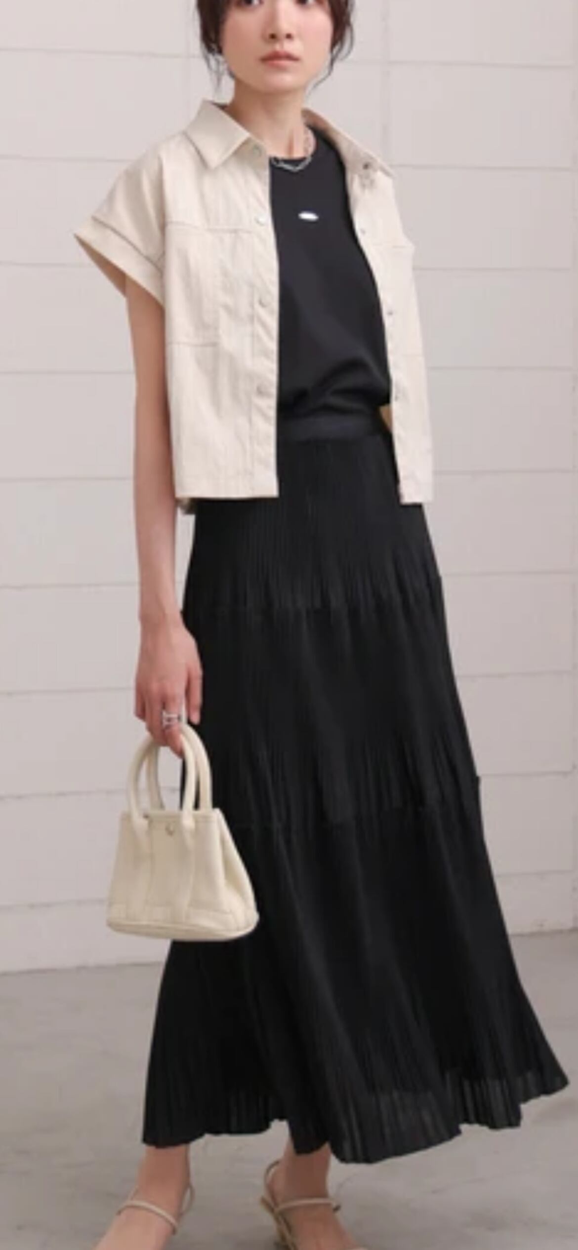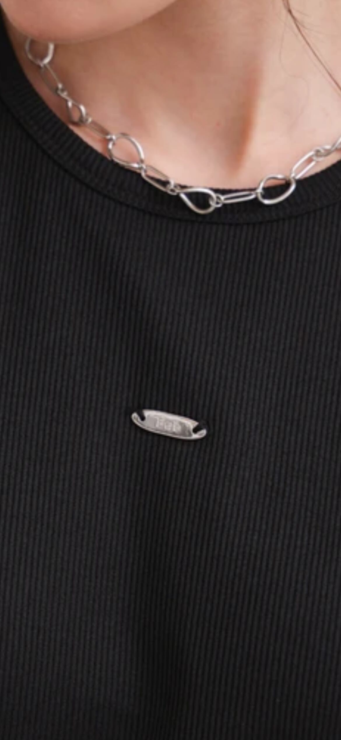 アメスリのシルエットと、アクセントになるロゴプレートが付いているのでデニムやスカートに合わせて1枚で着ても様になります。シャツやジャケットの中にインしても◎