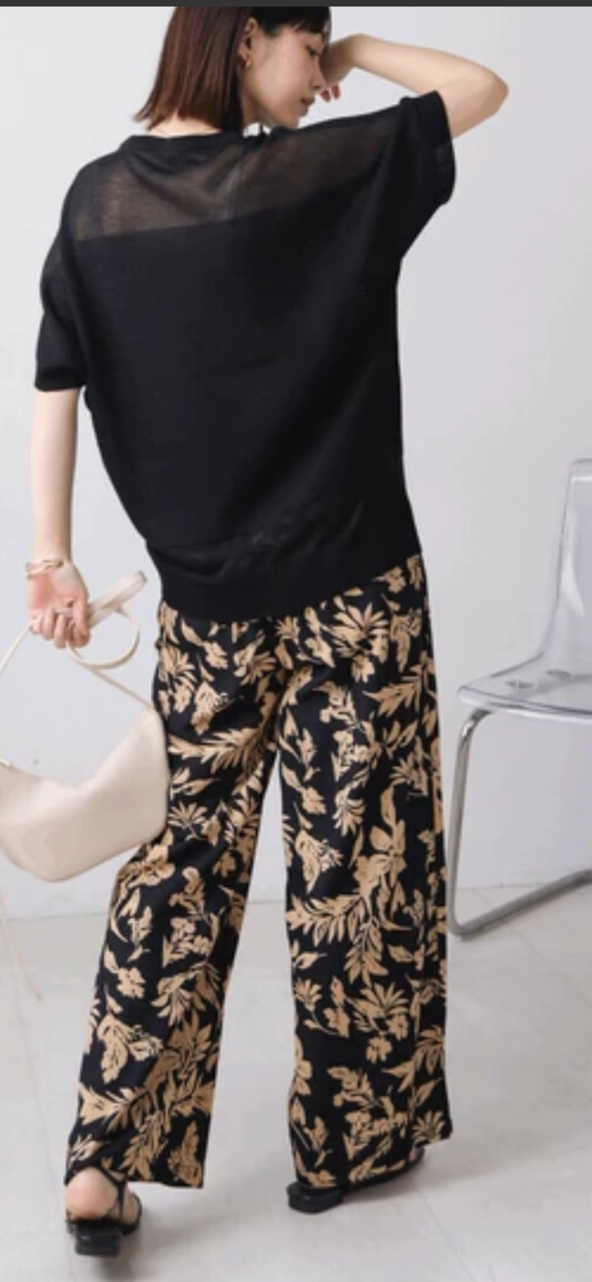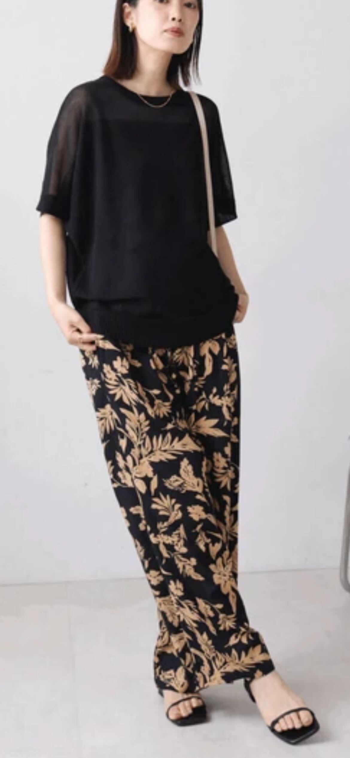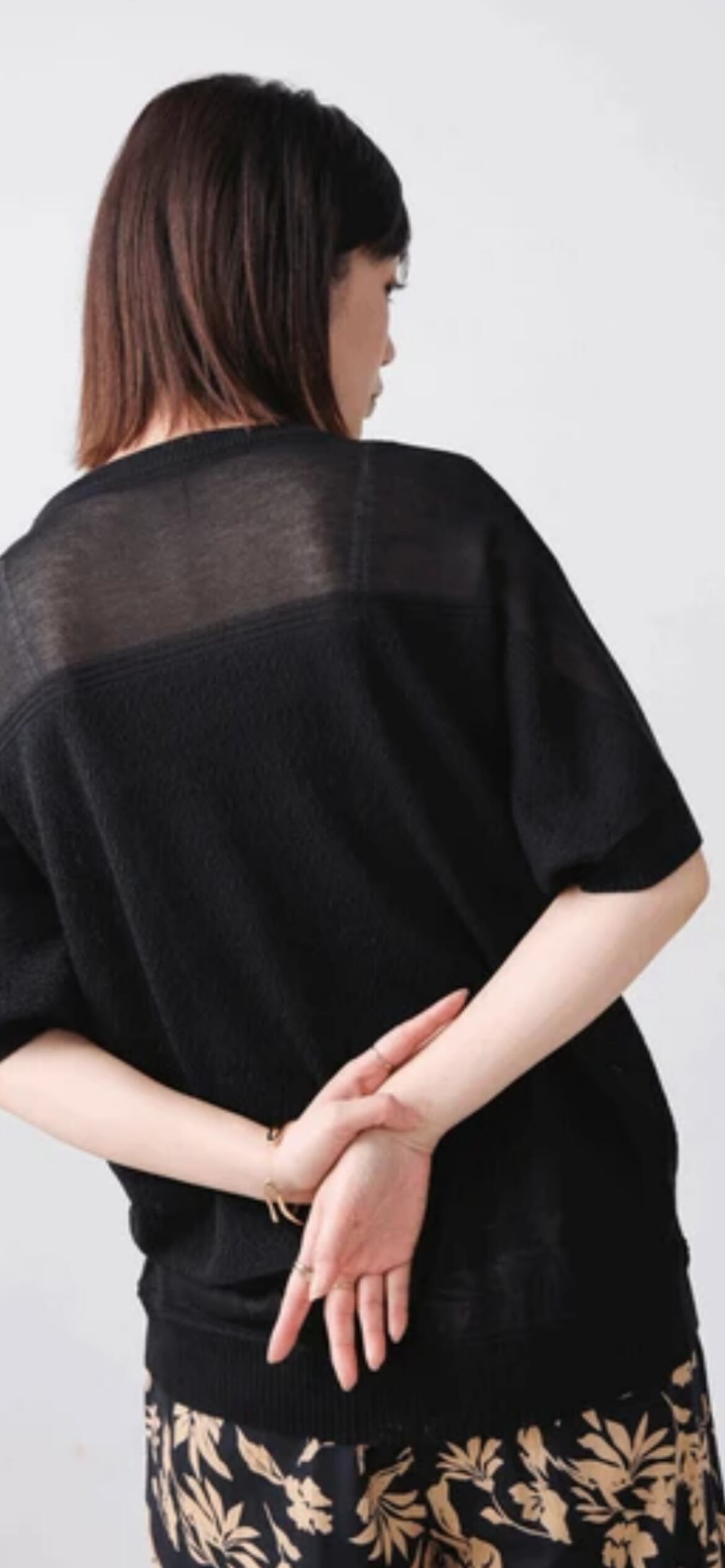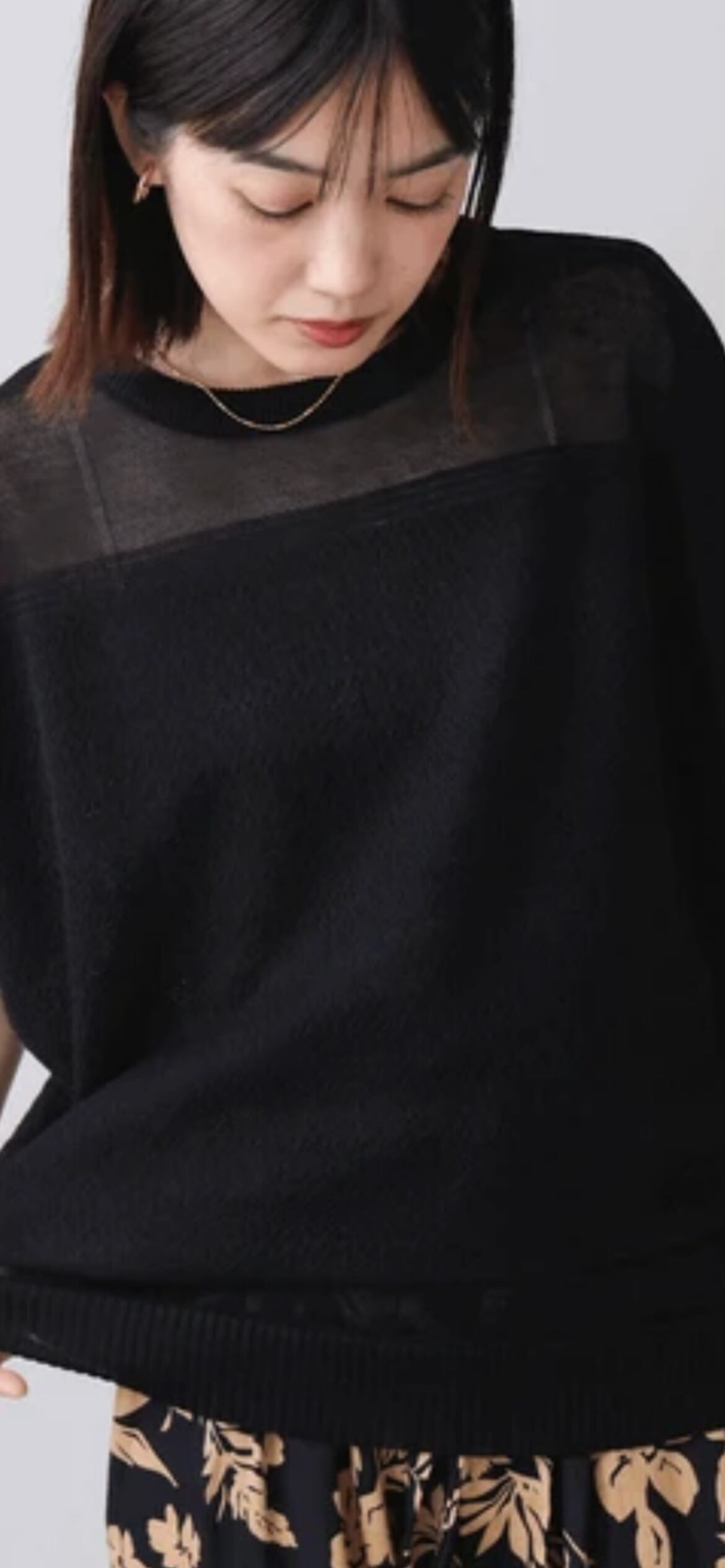シルエットはシンプルにどんな体型の人にも合うサイジング、肩回りや裾に透け感を持たせることでスッキリと細見えが叶います。