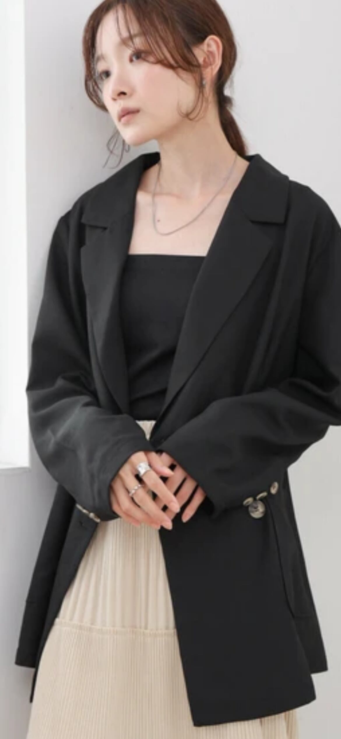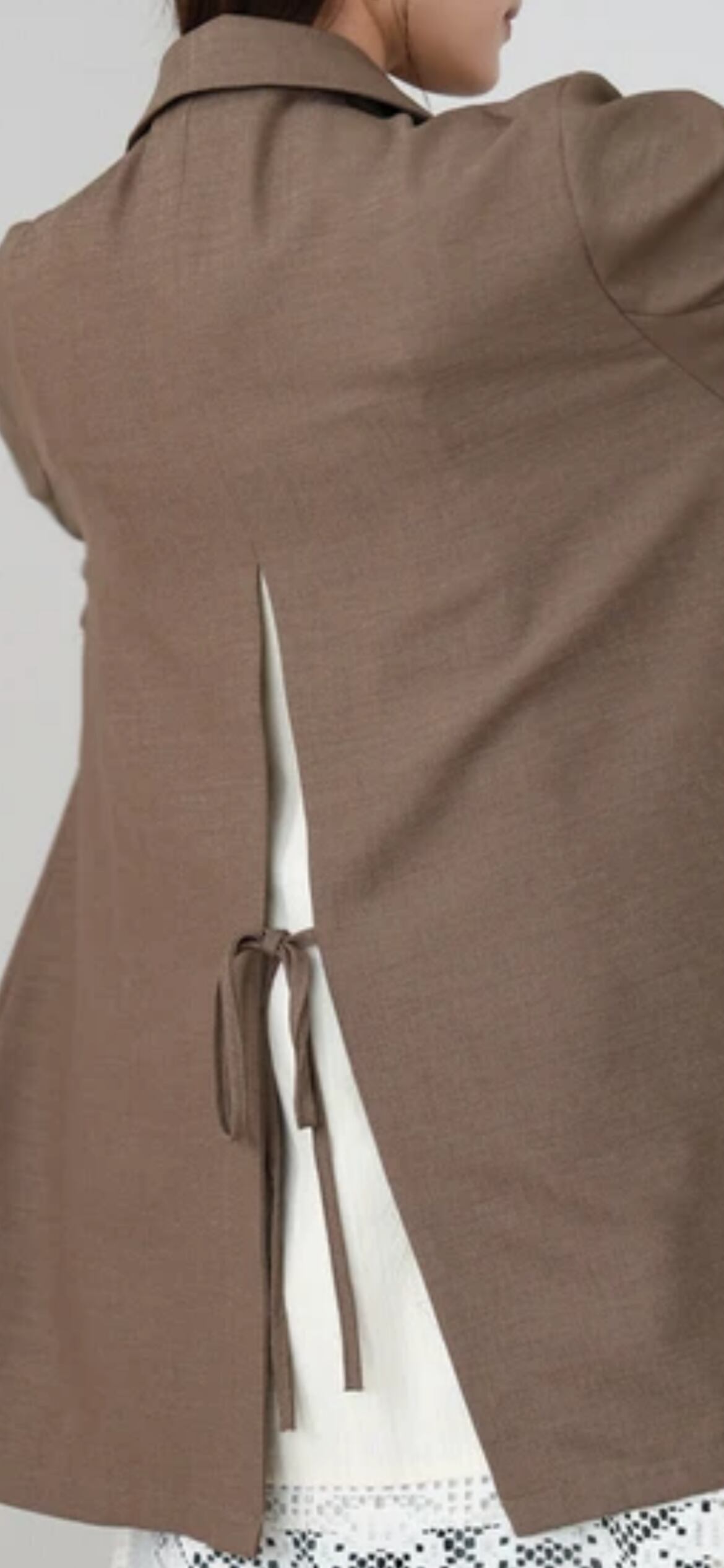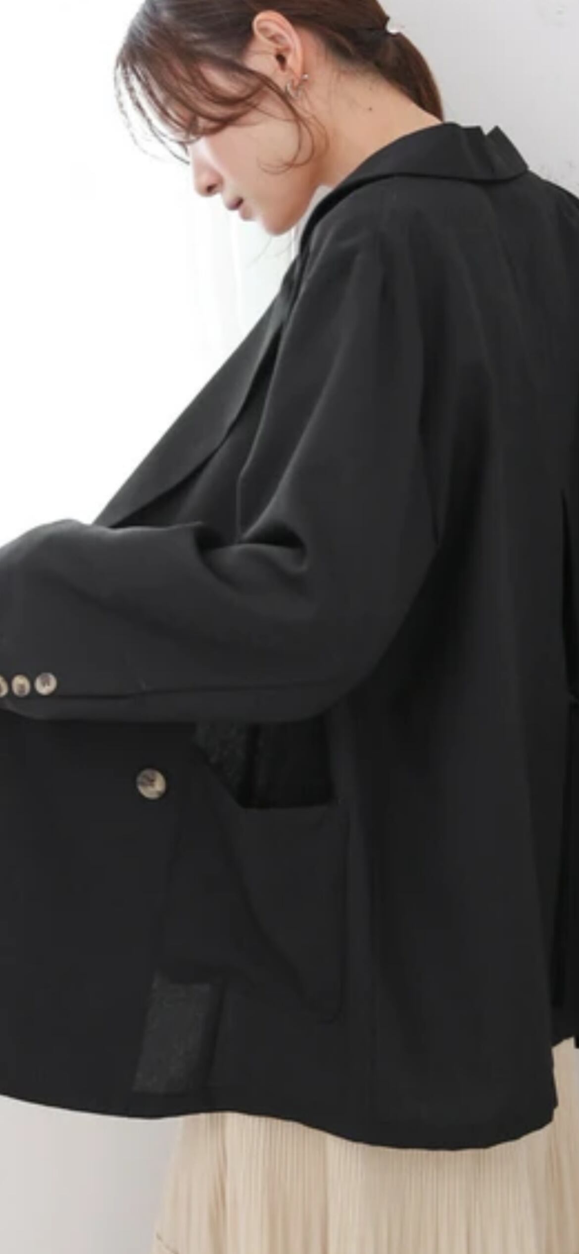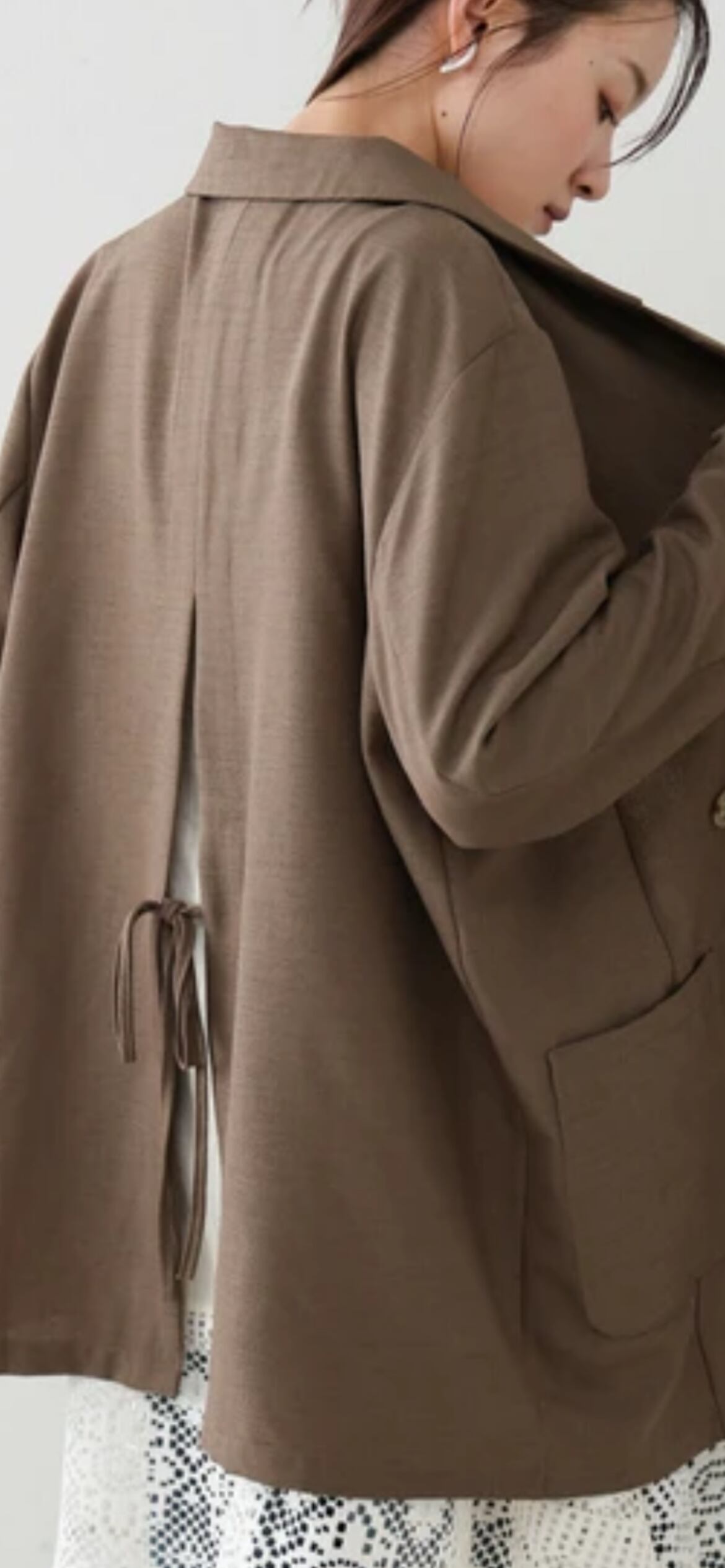 バックデザインがポイントの秋ジャケットが登場しました!バックに入った大胆なスリットにリボンがあしらわれています♪重たすぎずな質感なのでワンピースに羽織として、デニムとチュニックなどのレイヤードとして秋シーズン大活躍なジャケットです!流行りのリボンにダブルボタンでトレンドライクなジャケットに仕上がっています!