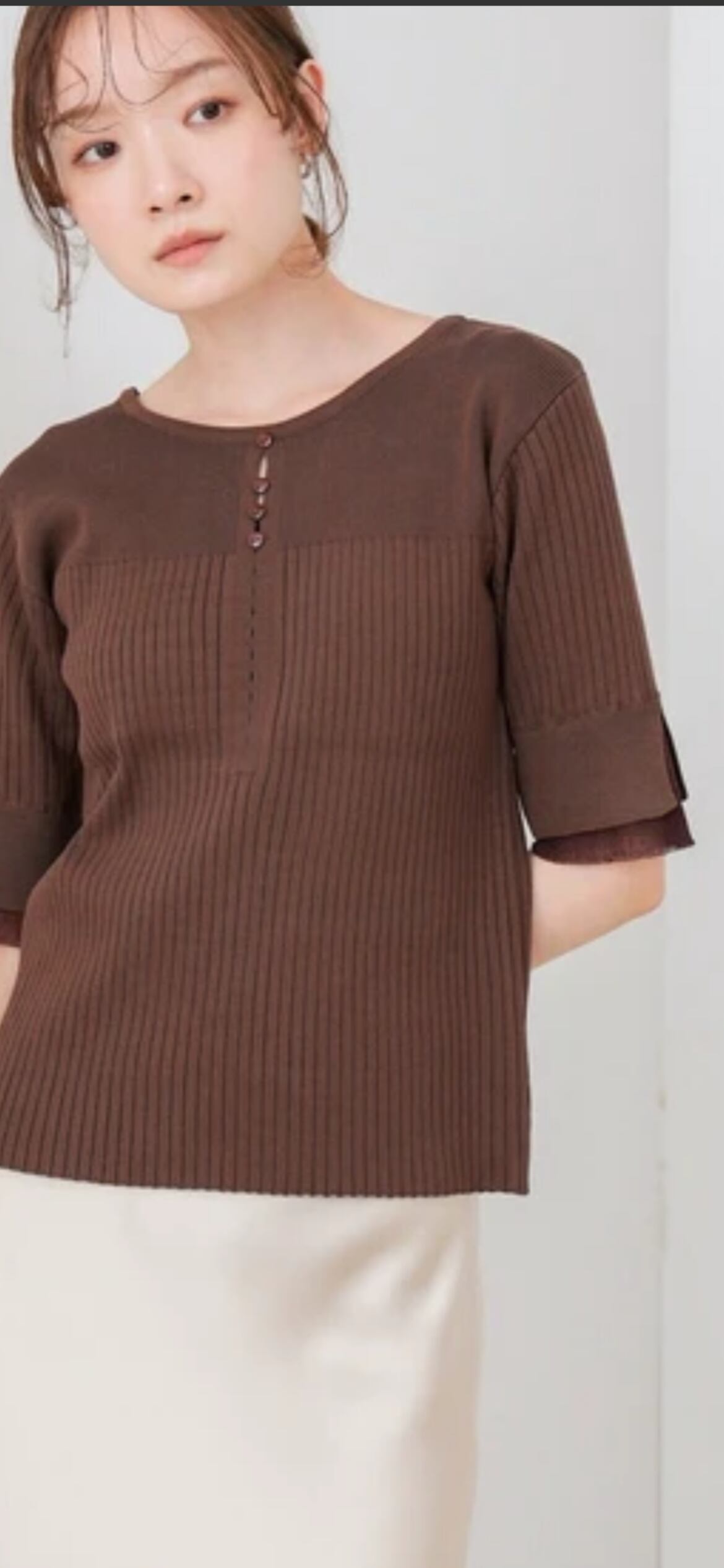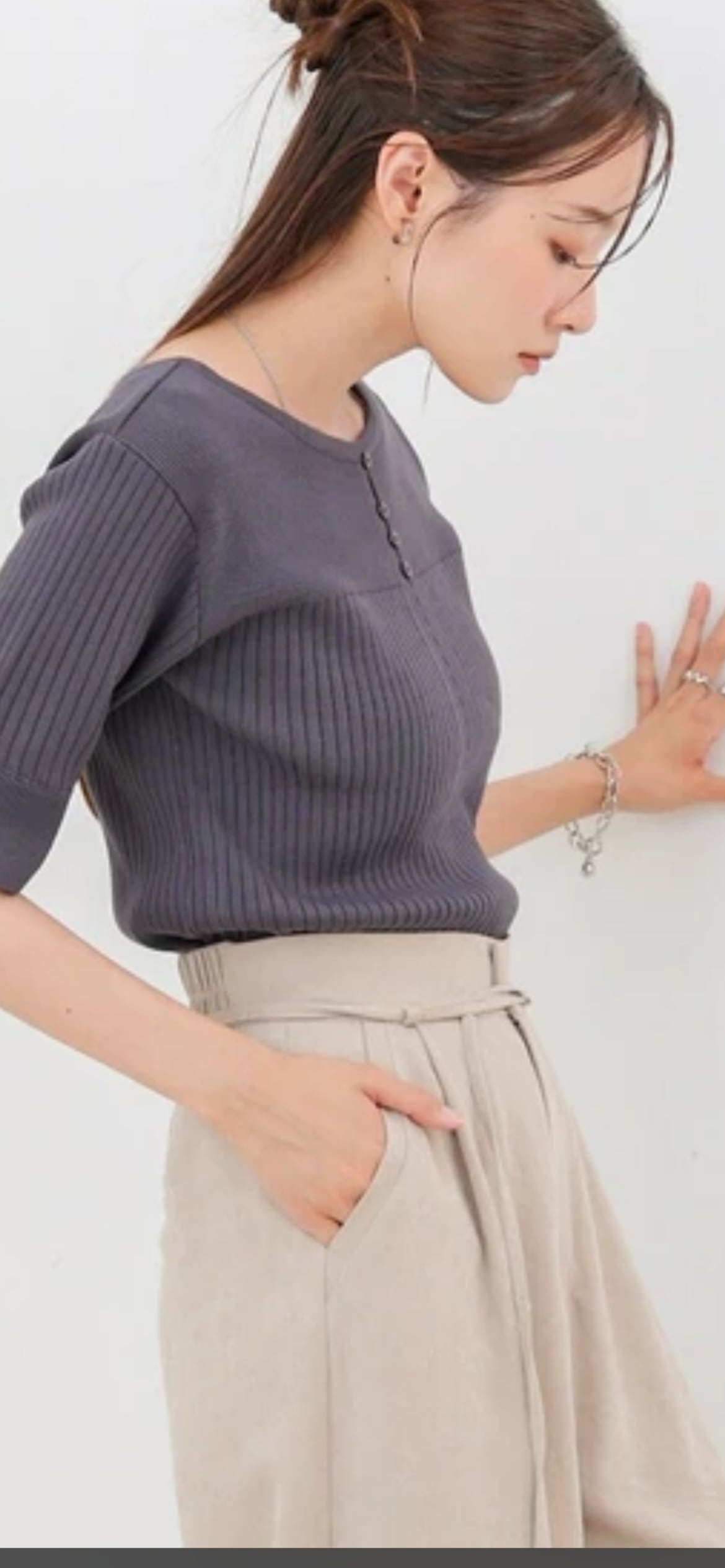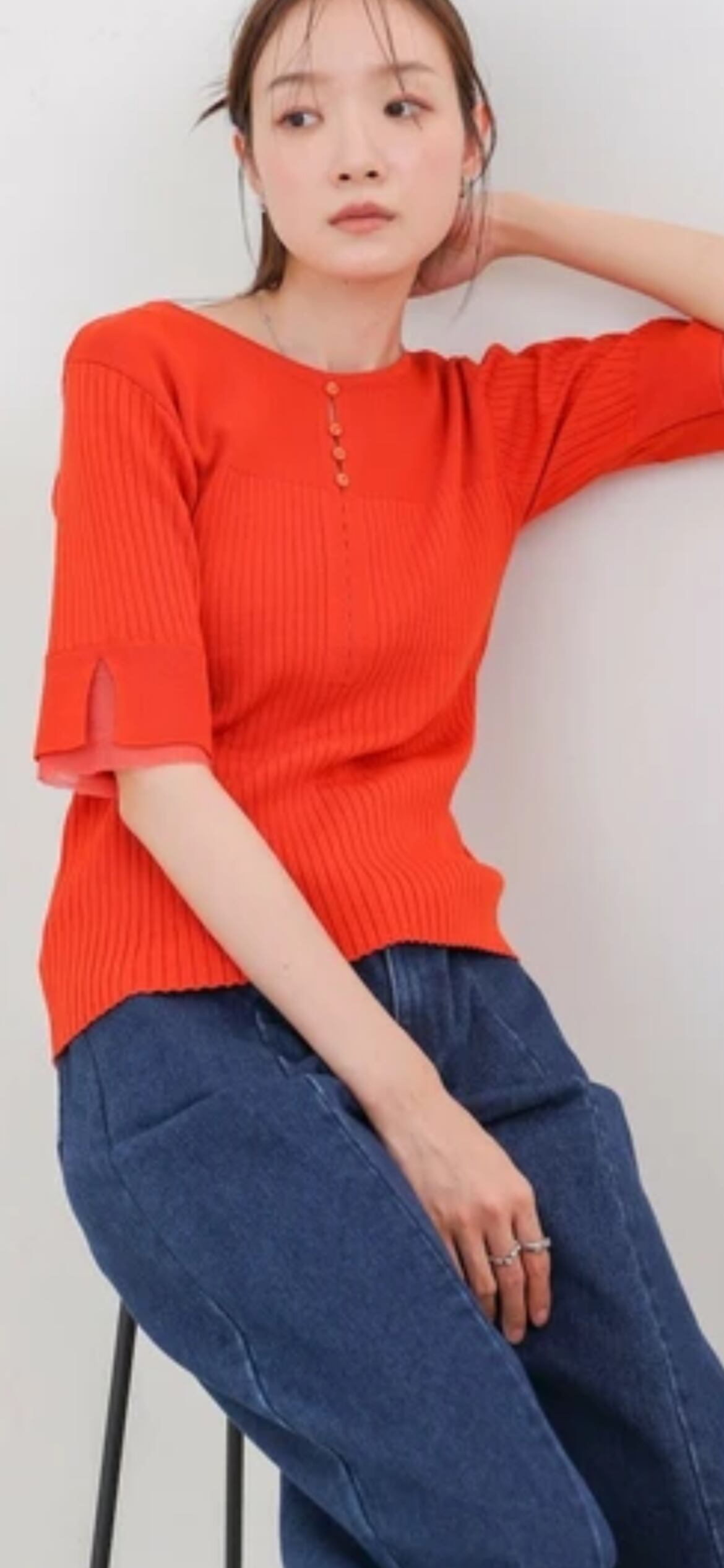 胸元のボタンデザインが上品なアクセントになり、スリット入りの袖がさりげない抜け感を演出。リブ×フラットの編地切り替えが立体感のあるシルエットを作り、ベーシックから差し色まで楽しめる4色展開で着回し力も抜群です。