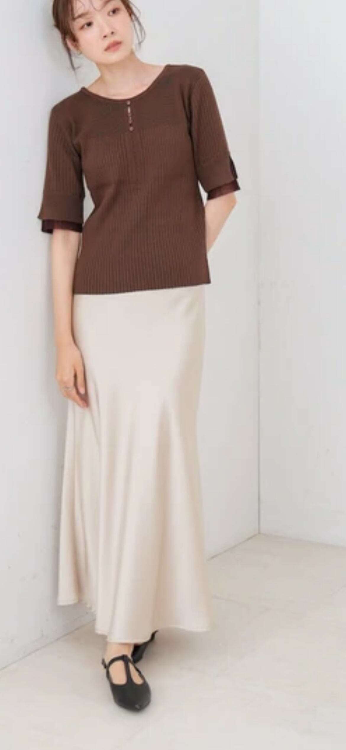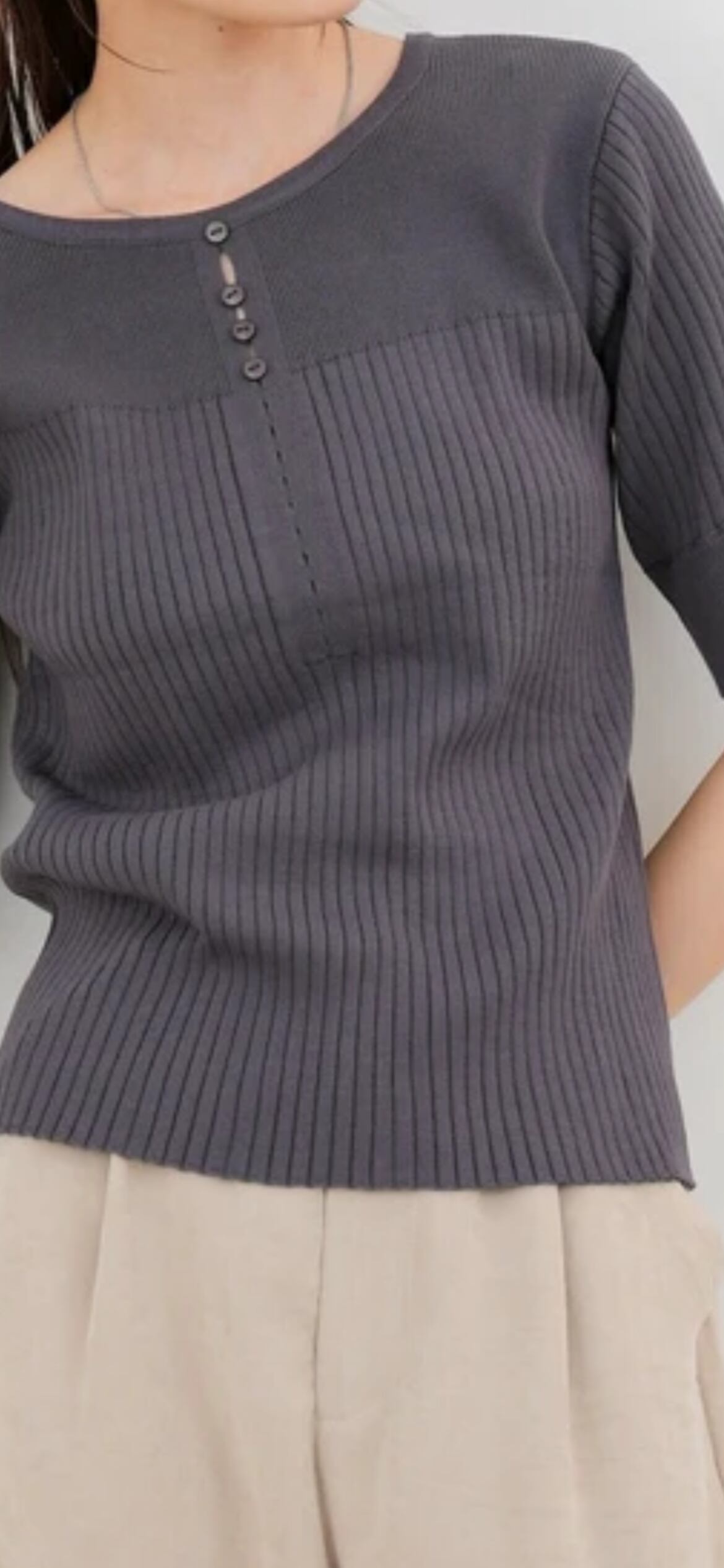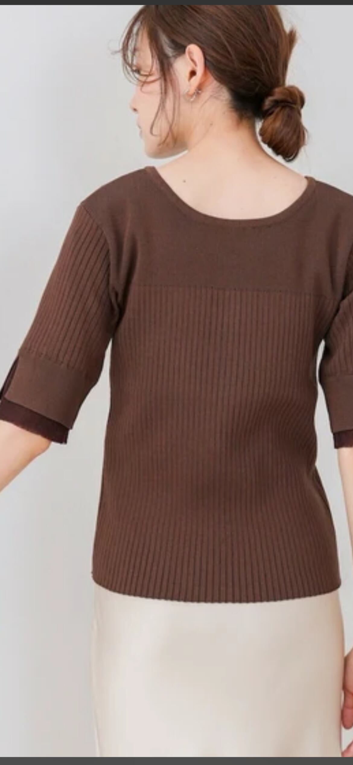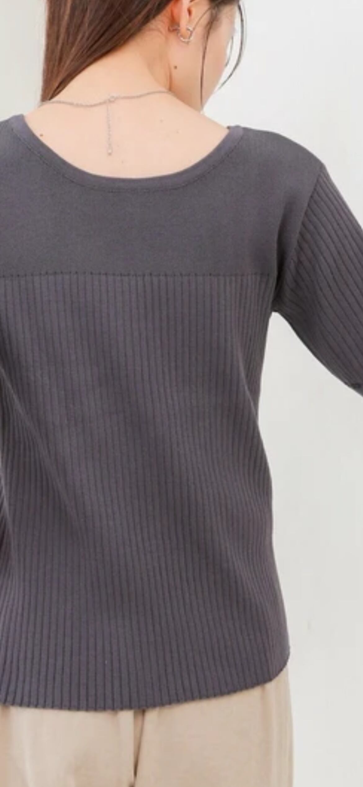 胸元のボタンデザインが上品なアクセントになり、スリット入りの袖がさりげない抜け感を演出。リブ×フラットの編地切り替えが立体感のあるシルエットを作り、ベーシックから差し色まで楽しめる4色展開で着回し力も抜群です。