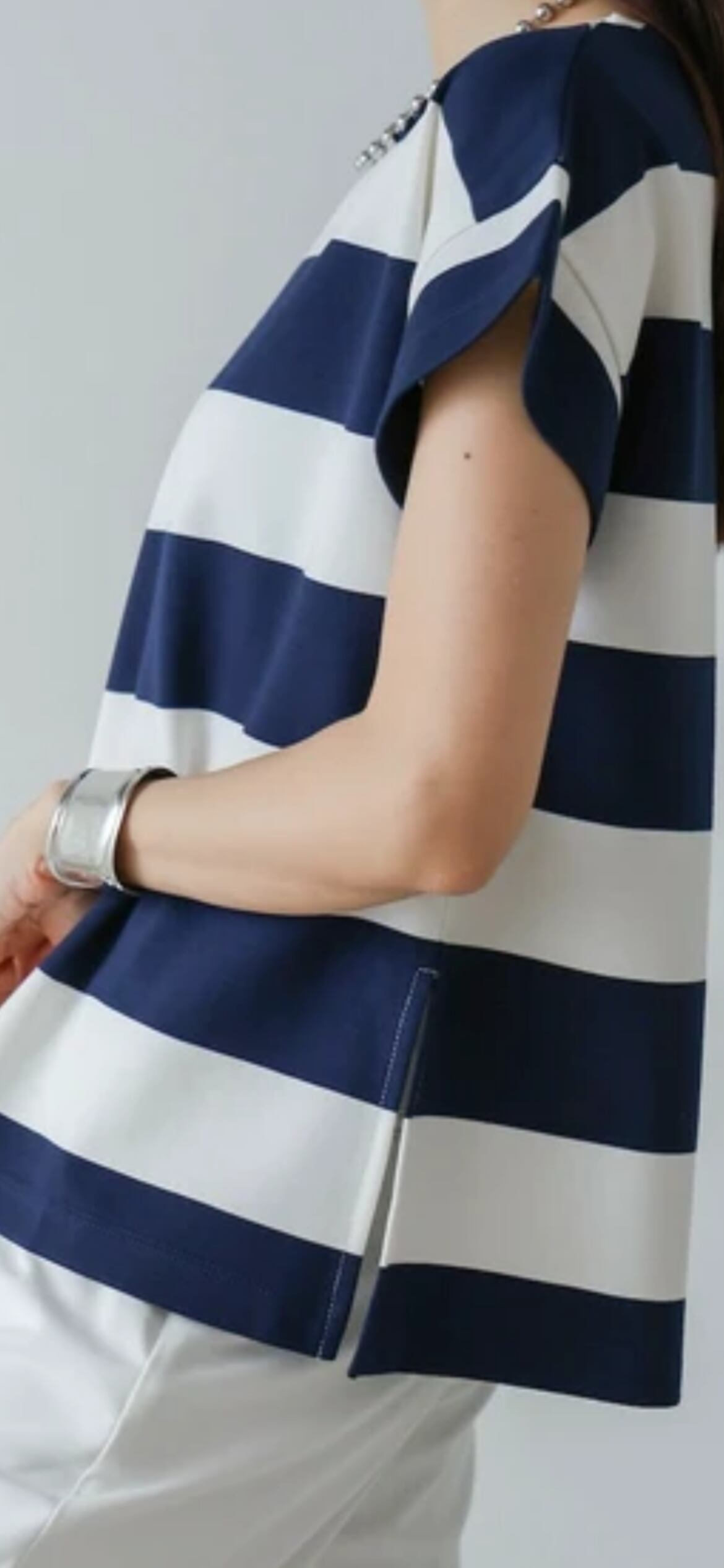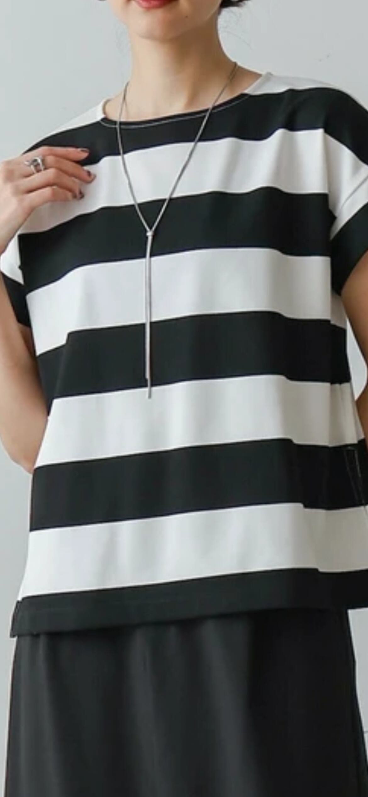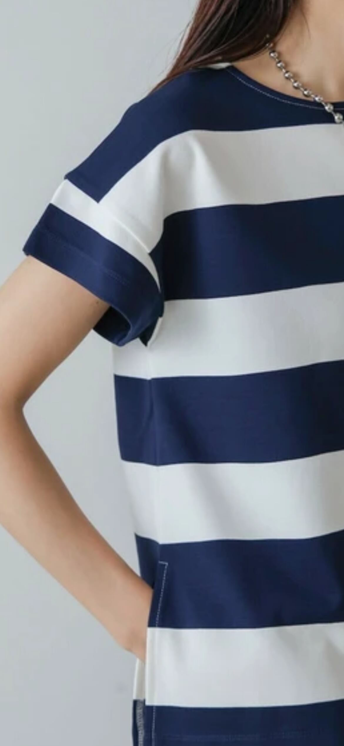 太めのボーダーがフレンチカジュアルな印象の一枚。程よくフレンチスリーブなので、二の腕周りをすっきりと見せてくれるのもポイントです。適度なハリ感で肌離れが良く、さらっと気兼ねなくご着用いただけます。長すぎない丈感で、裾を出して着ても野暮ったくなりません。