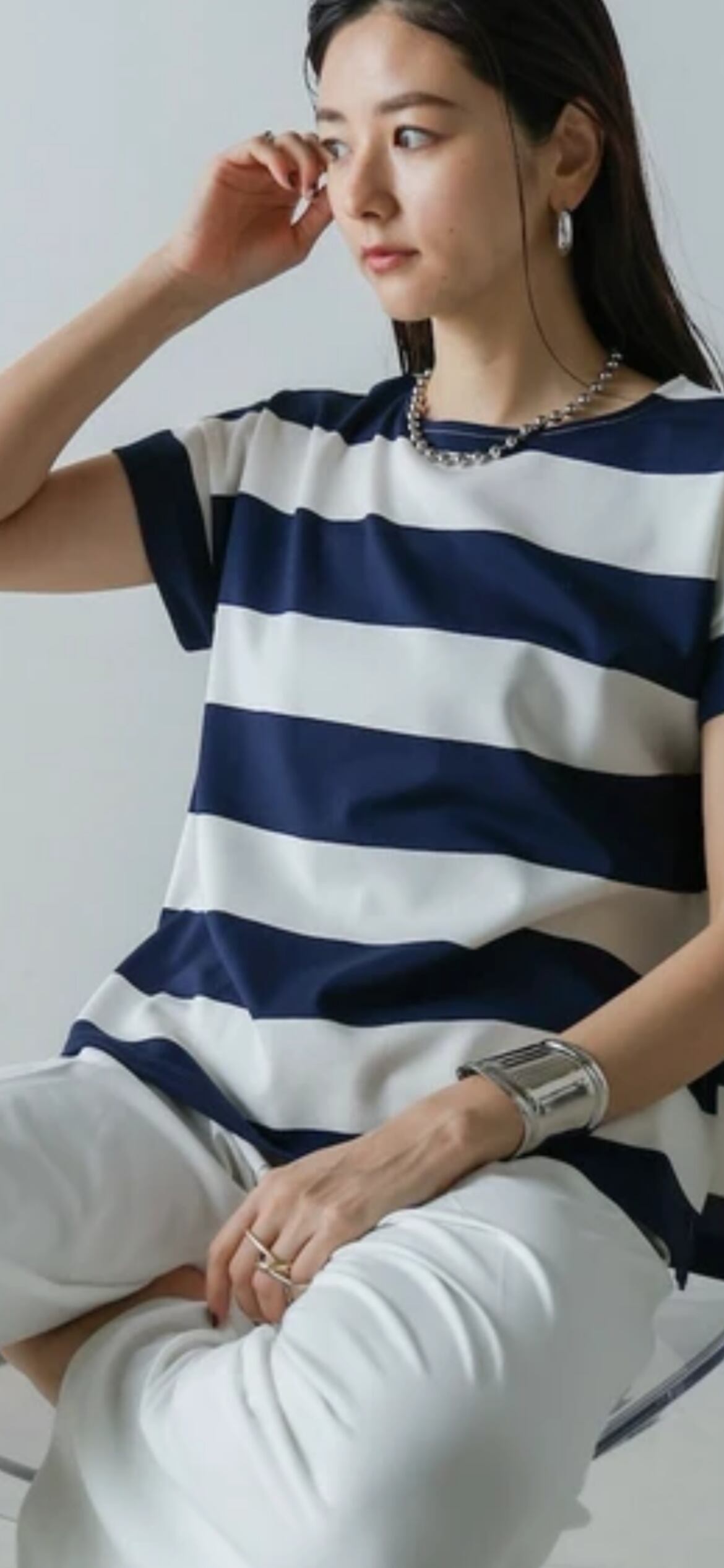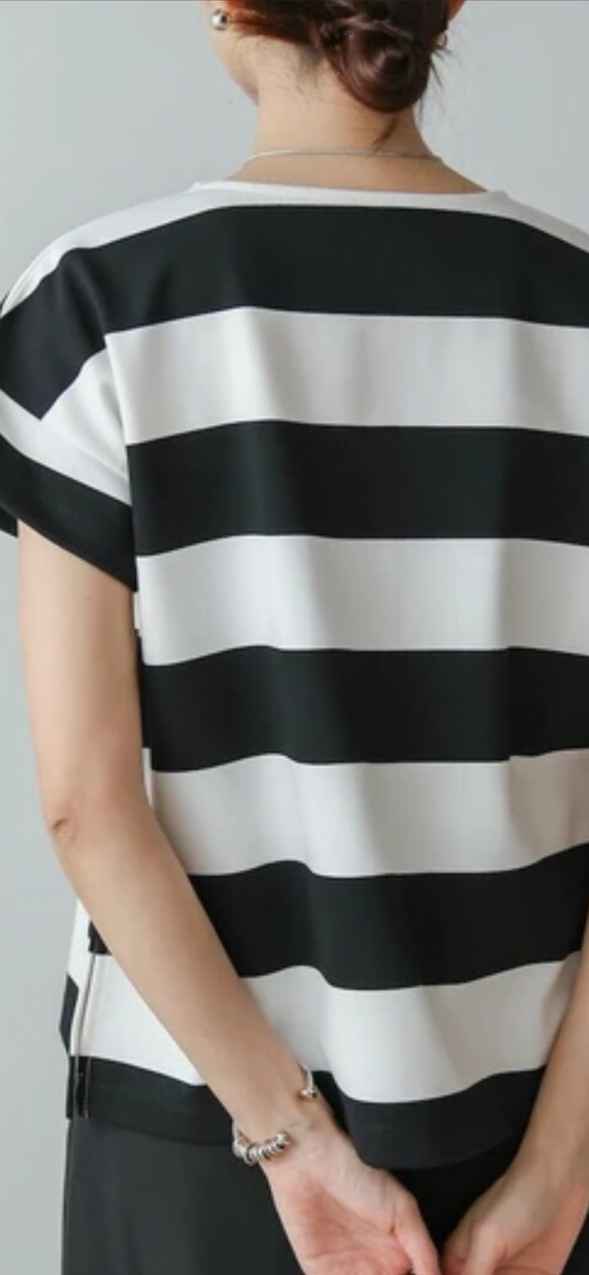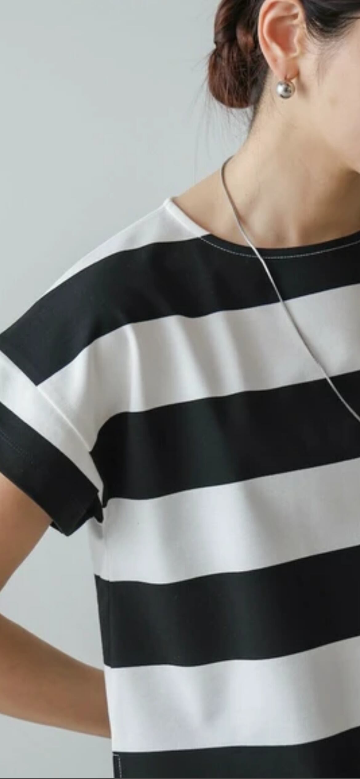 太めのボーダーがフレンチカジュアルな印象の一枚。程よくフレンチスリーブなので、二の腕周りをすっきりと見せてくれるのもポイントです。適度なハリ感で肌離れが良く、さらっと気兼ねなくご着用いただけます。長すぎない丈感で、裾を出して着ても野暮ったくなりません。