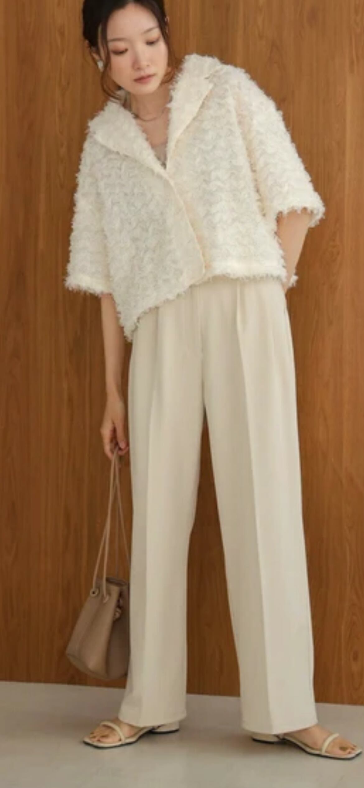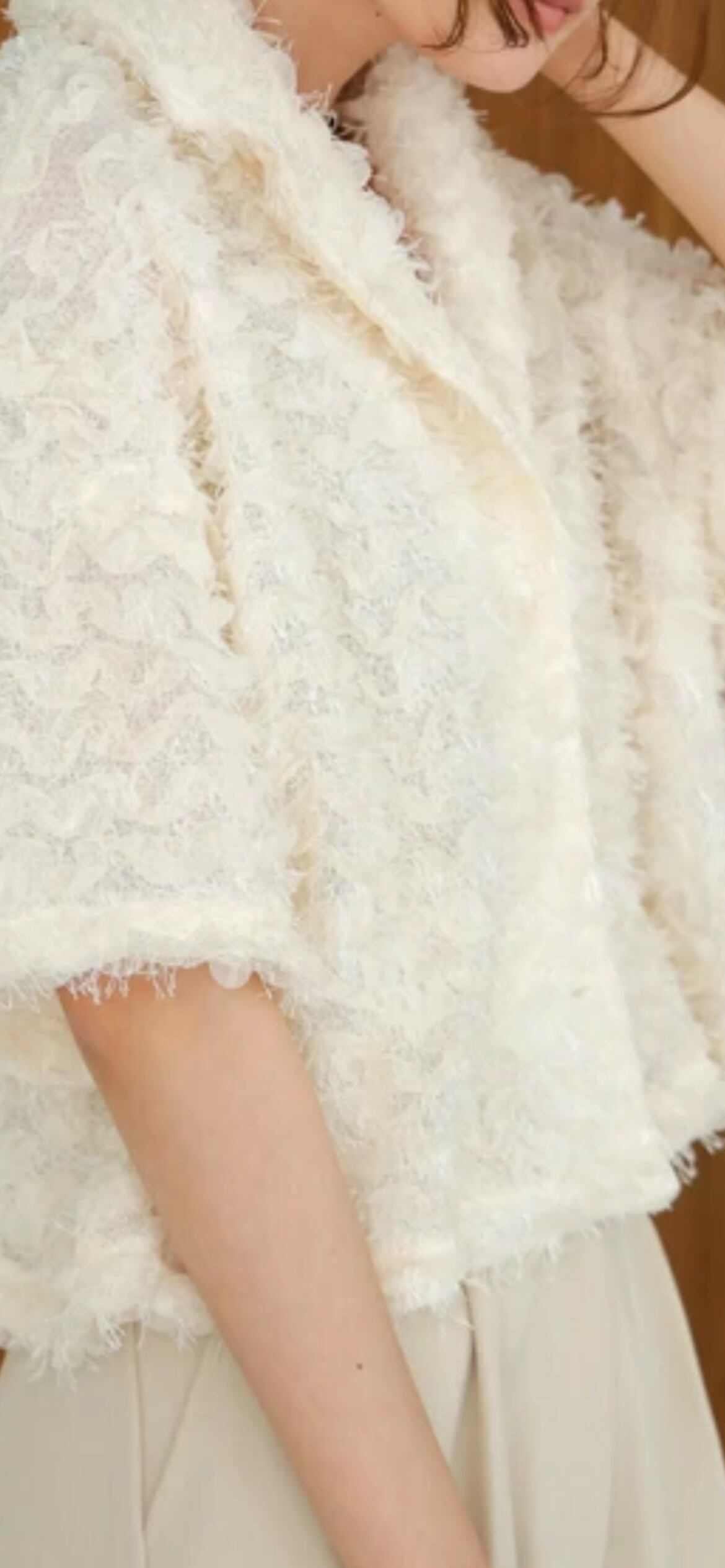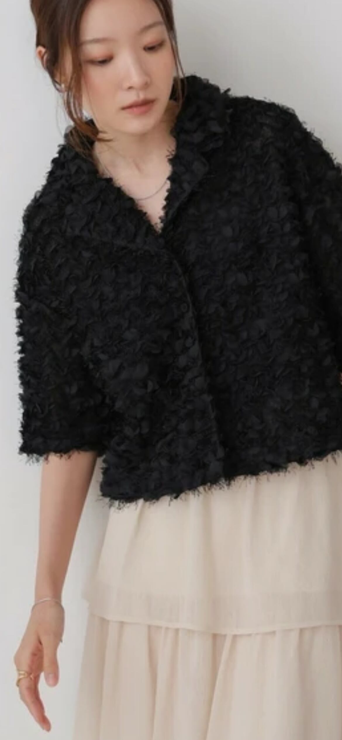 まるで花びらを縫い付けたかのようなフリンジテキスタイルがフェミニンで可愛らしい1着です。