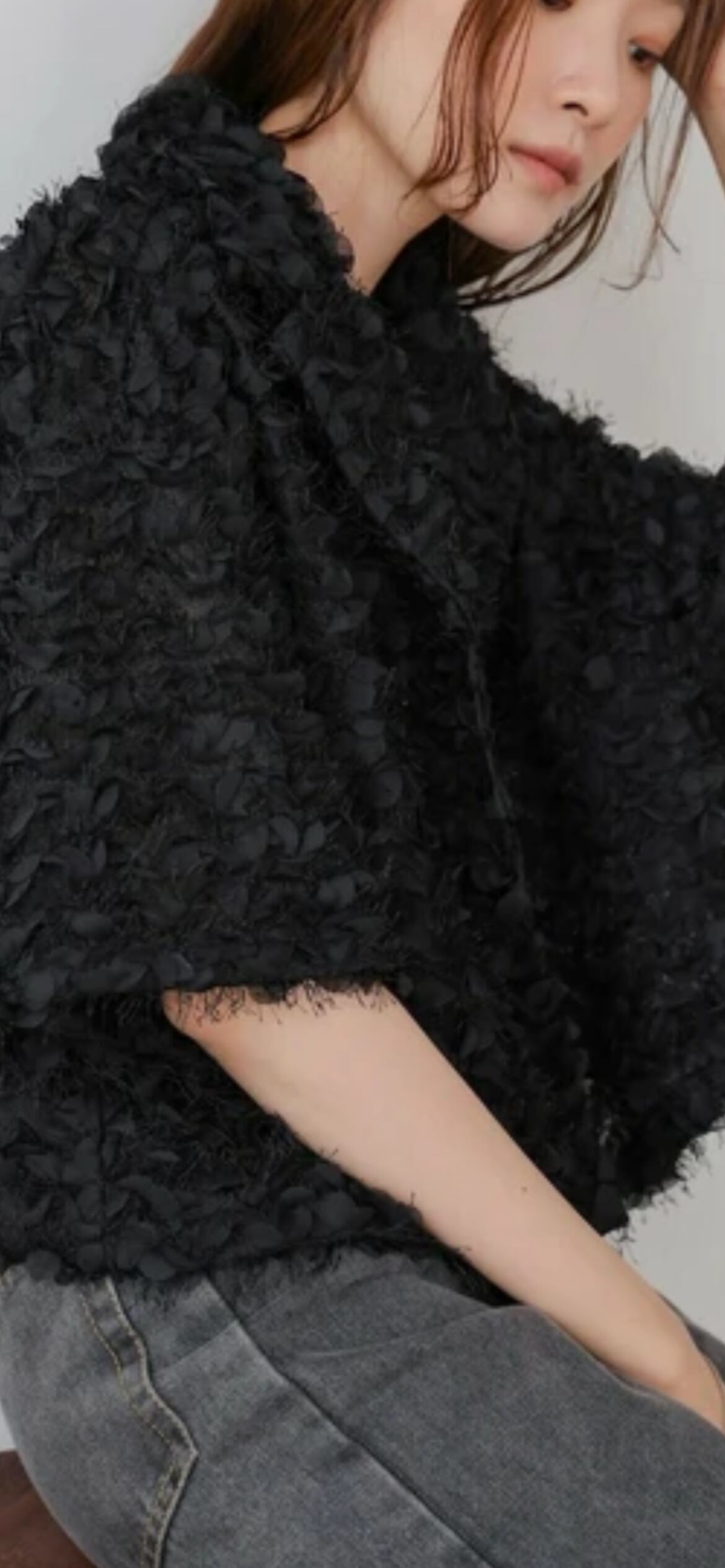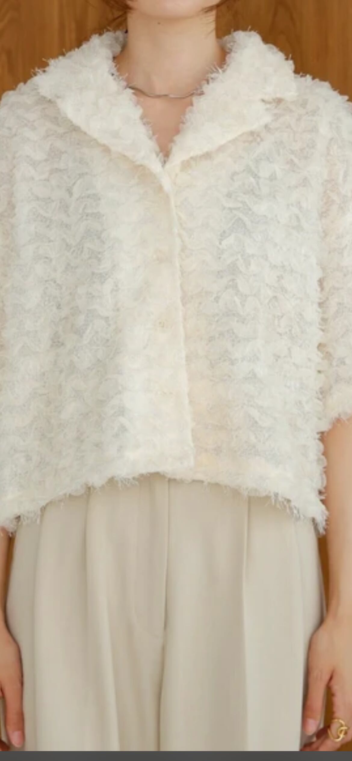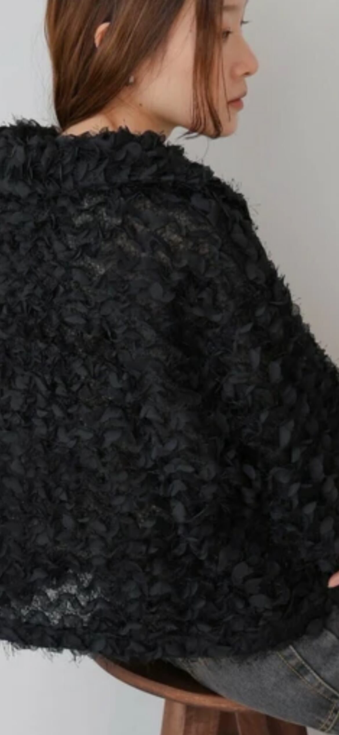 まるで花びらを縫い付けたかのようなフリンジテキスタイルがフェミニンで可愛らしい1着です。