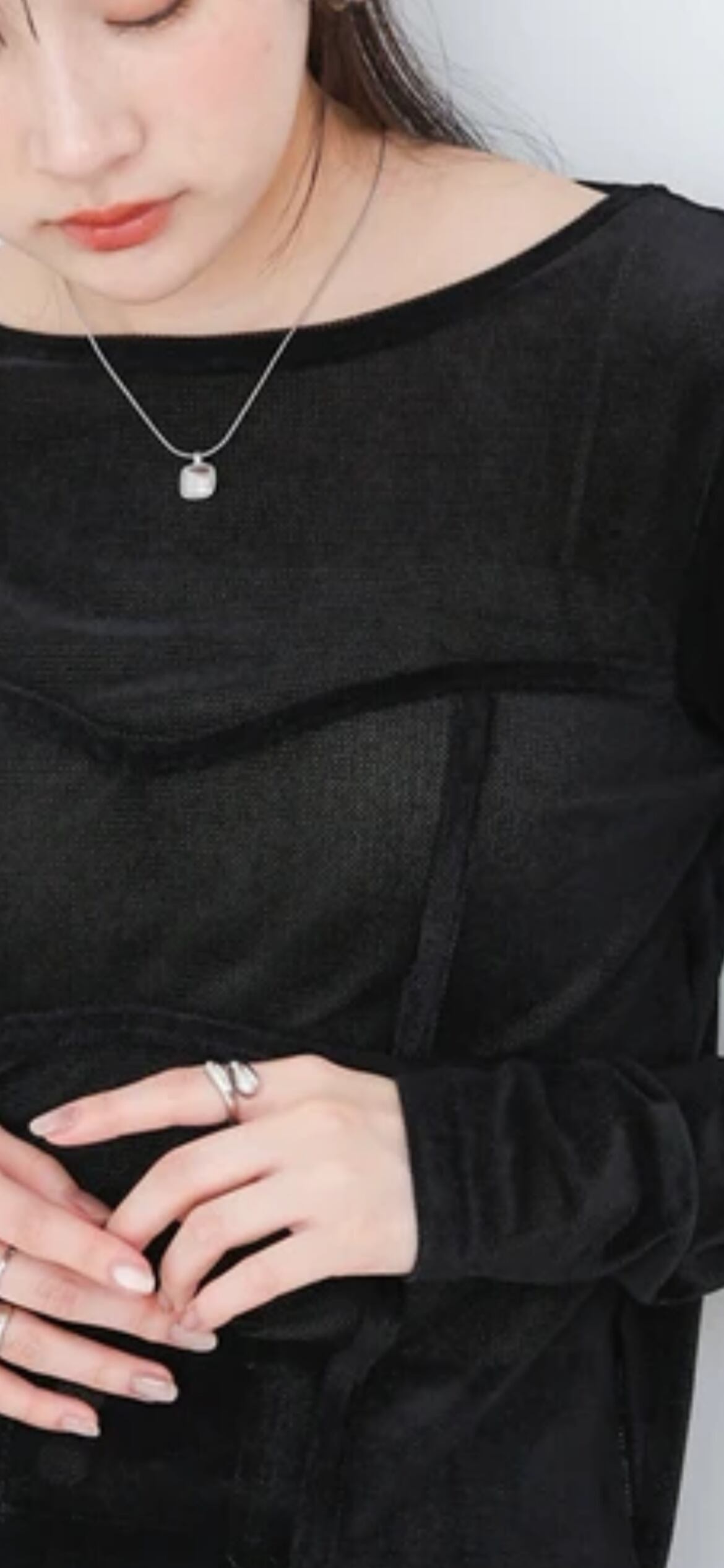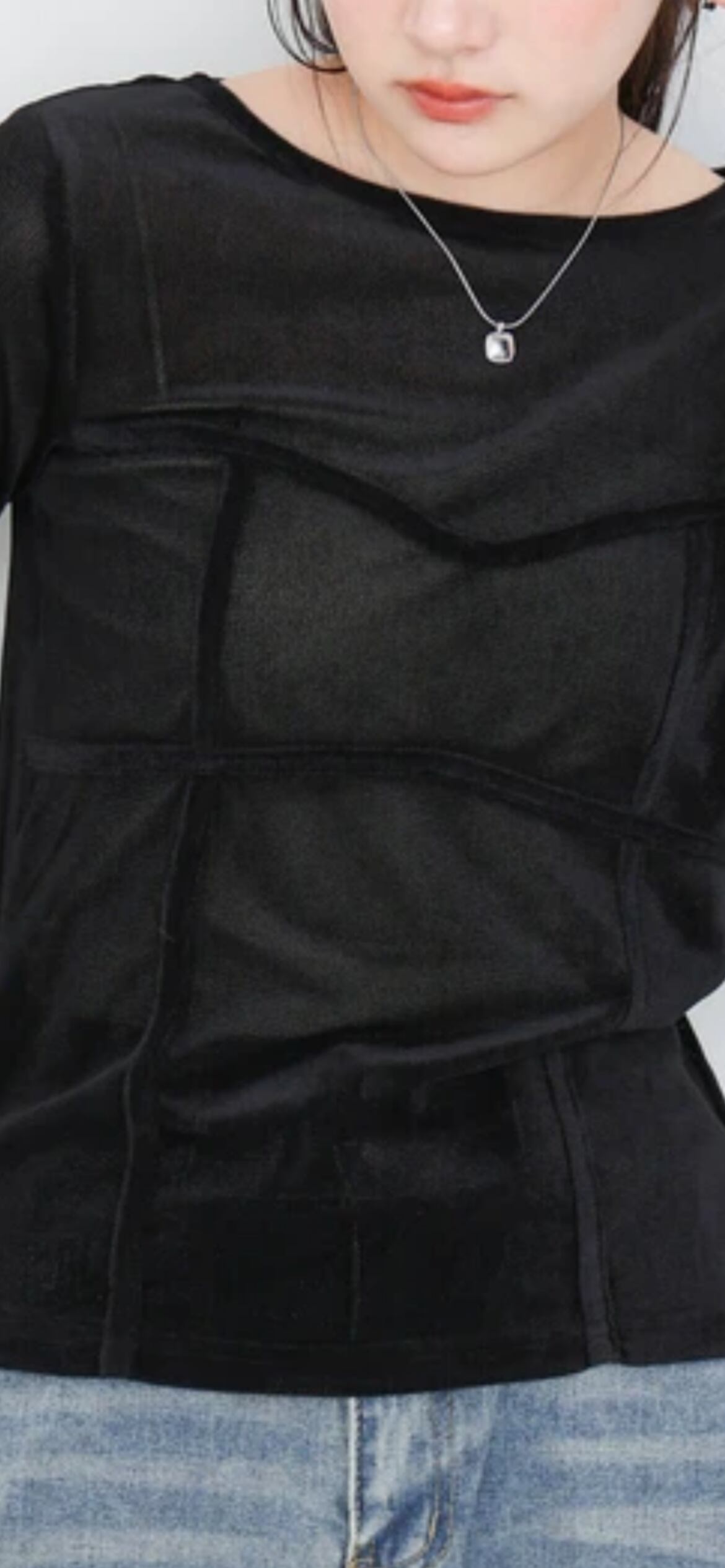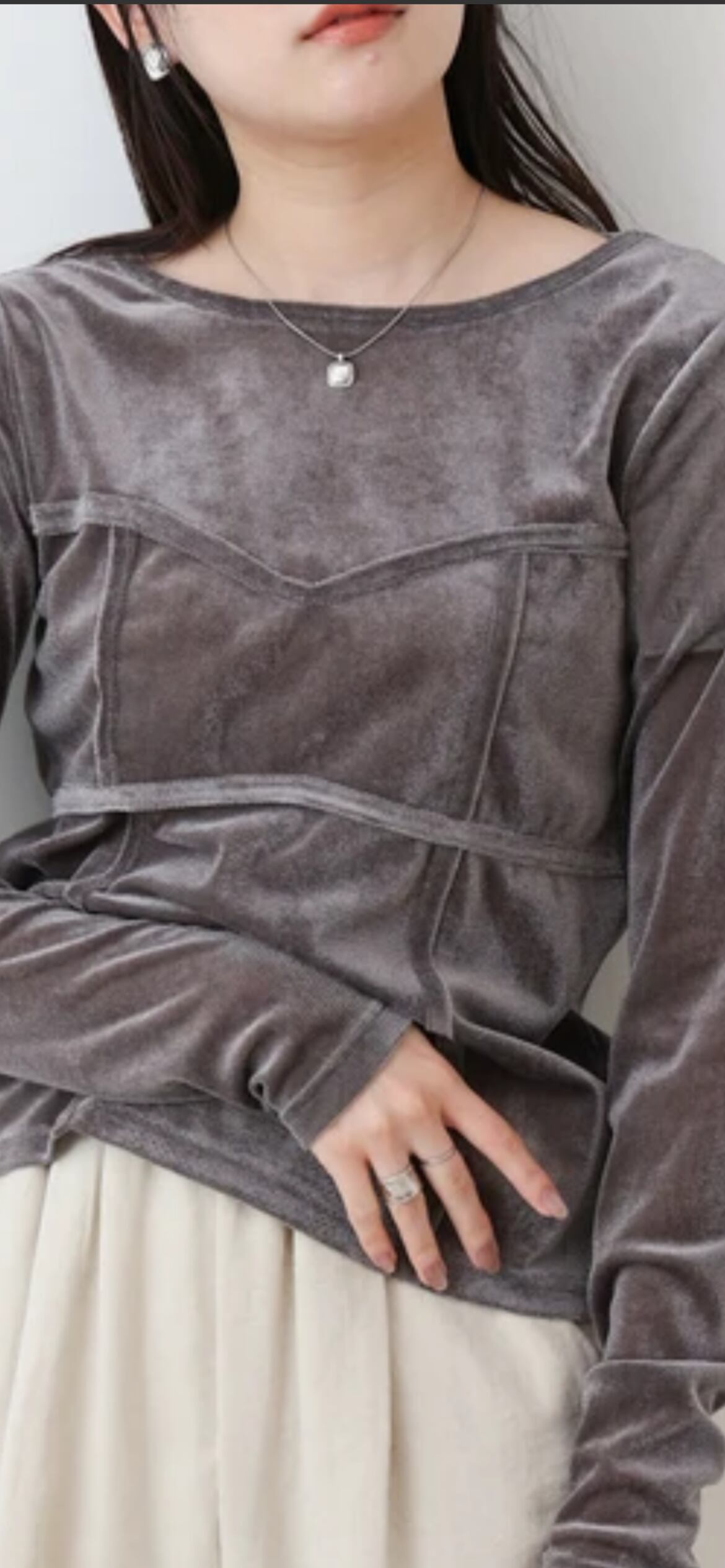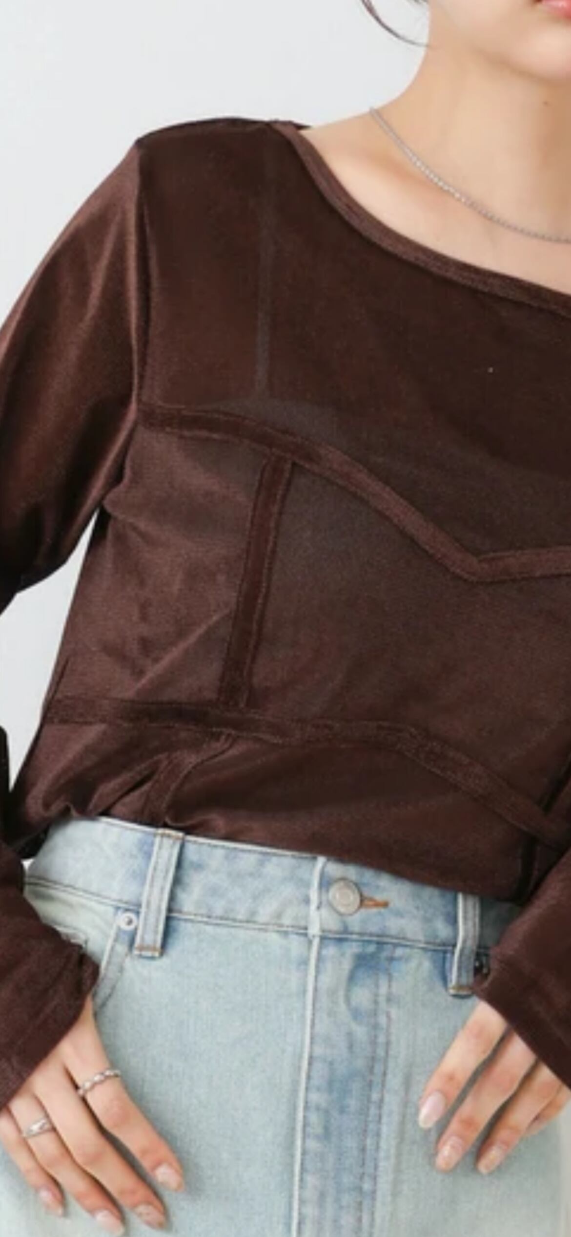 ベロア素材とシアー生地を合わせた上品ながらもしっかりと抜け感があるデザインになっています。立体的にビスチェ風のドッキングを加えることで女性らしいシルエットを演出。シンプルながらも素材を生かした、カジュアルに見えつつもきちんと感もある1枚になっています。