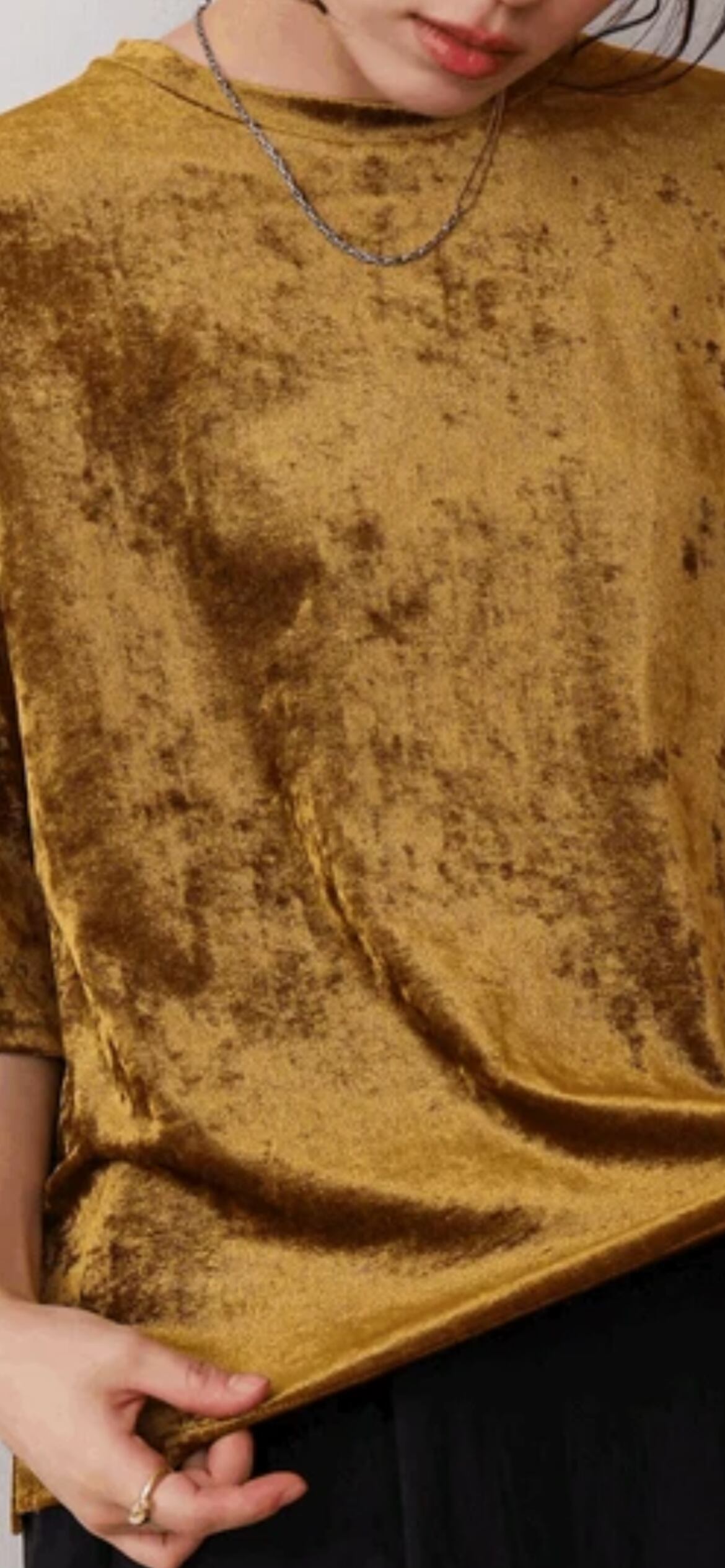 シアーベロア素材を使用した、ゆったりとしたシルエットの5分袖Tシャツ。