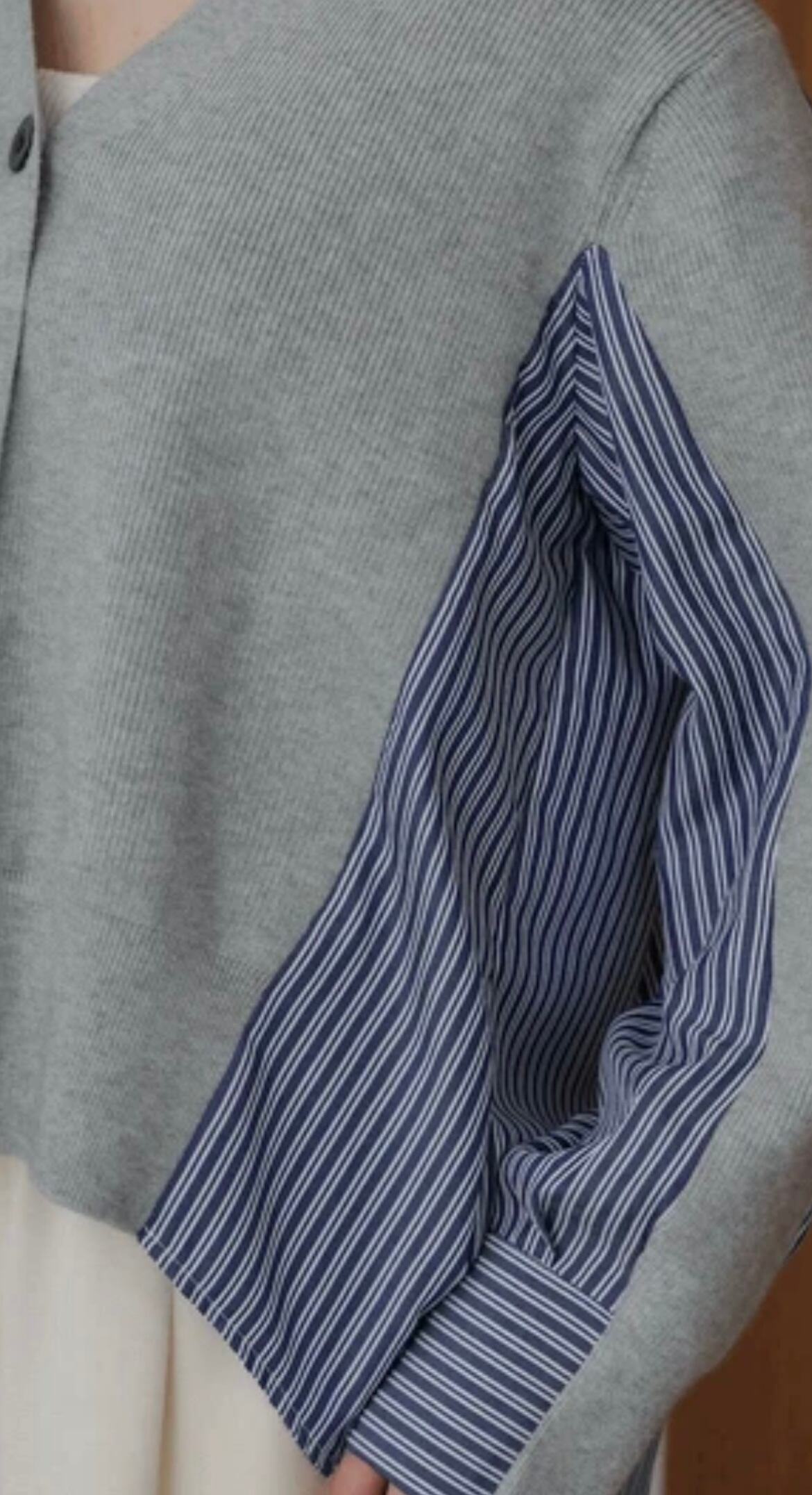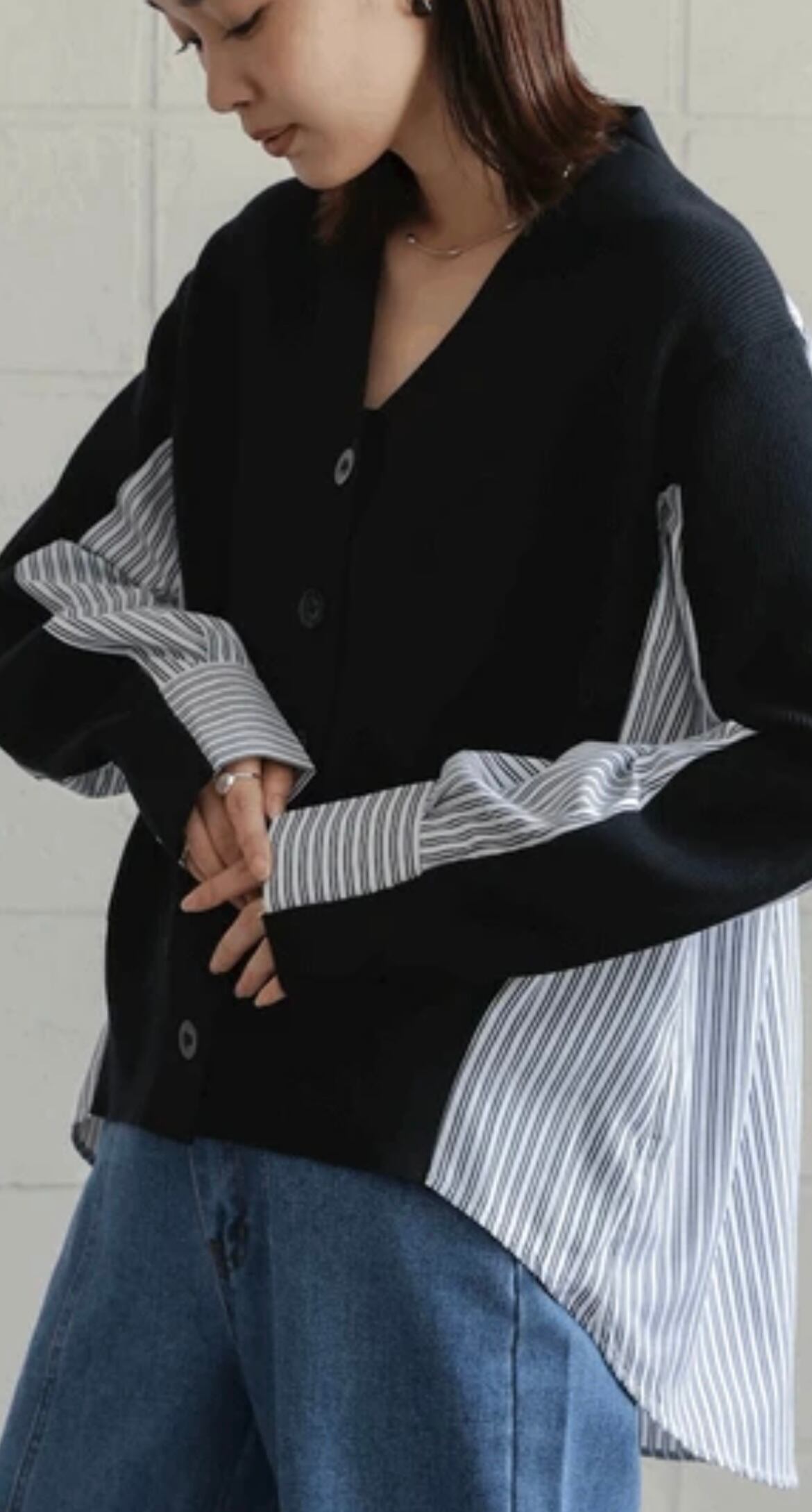 身幅に余裕を持たせたボックスシルエットで、身体のラインを拾いにくく、二ットとストライプの視覚効果で細見え効果抜群があります。