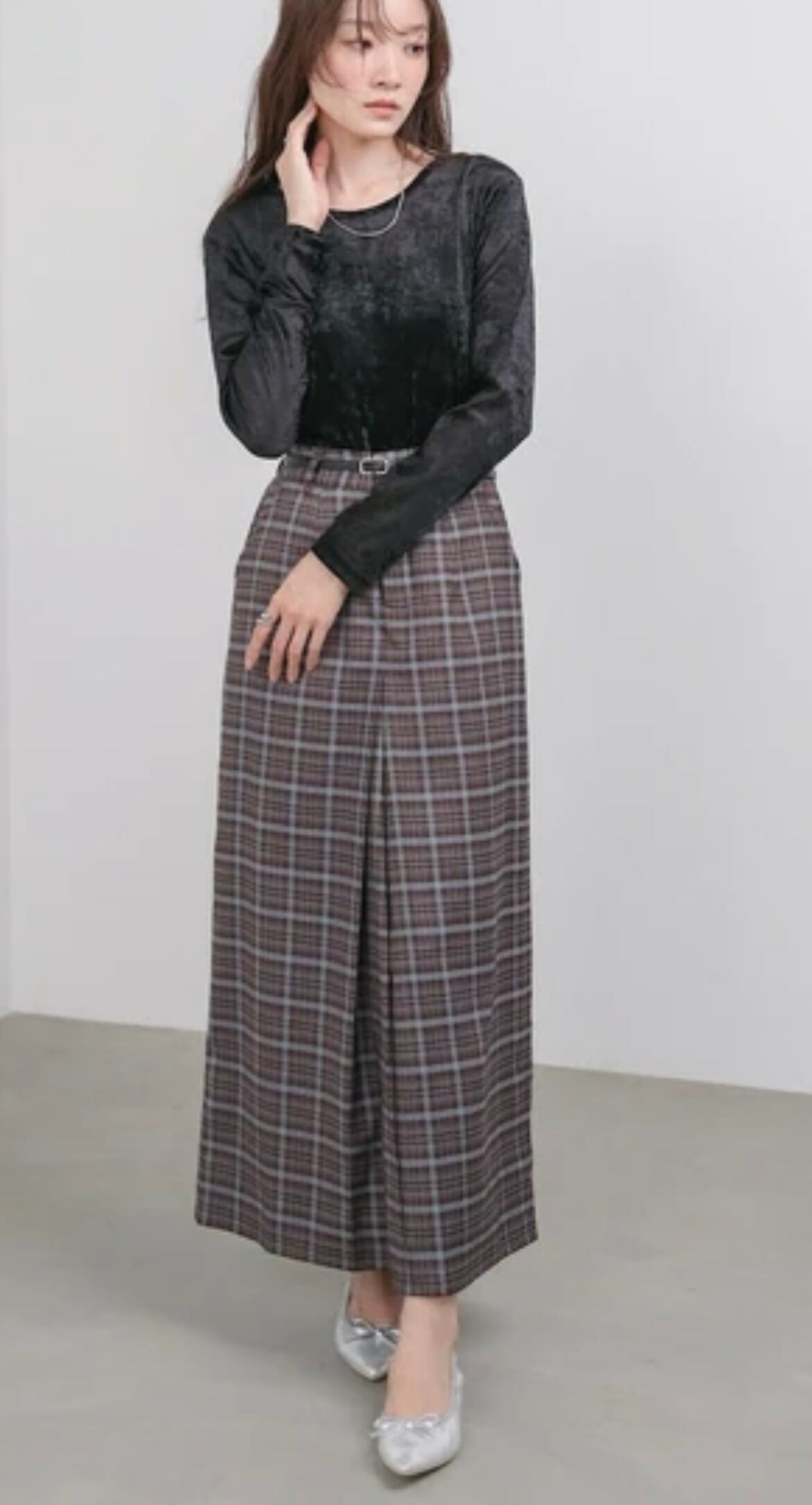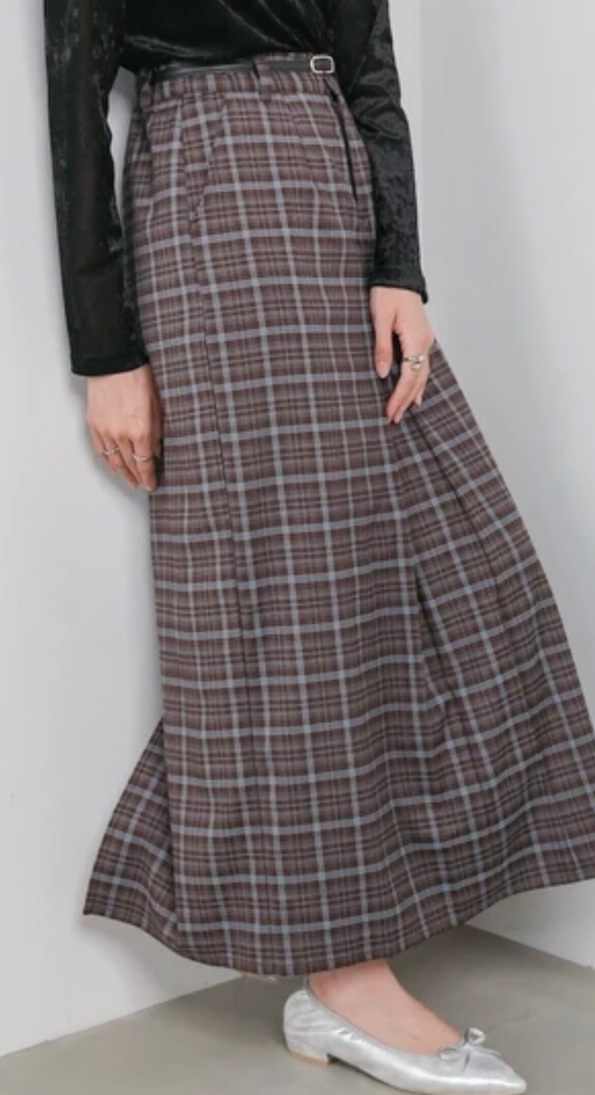 前後ろ両方にタックが入ったIラインスカートになっています。フロントの方は深めに入っているので歩きやすく、さらに細見えするシルエットになります。ウエストバック部分は一部がゴムになっているのでストレッチ性もしっかりあります。カラー展開も3色展開とトレンドのチェック柄を秋らしい深みのある色味に変えたカラーを含め、シーン別に使いやすい色味で仕上げました。