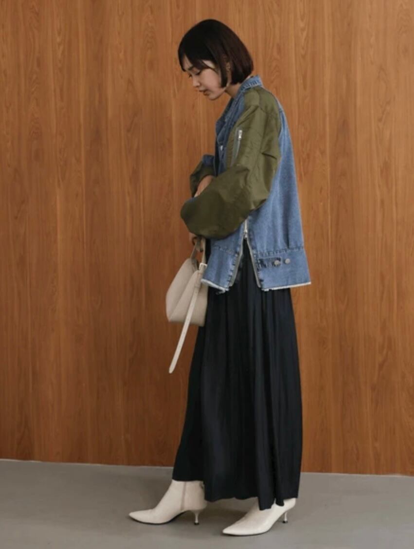 ボディ部分には程よくヴィンテージ感のあるデニムを使用し、肩から袖にかけては光沢感のあるナイロン素材で切り替え。