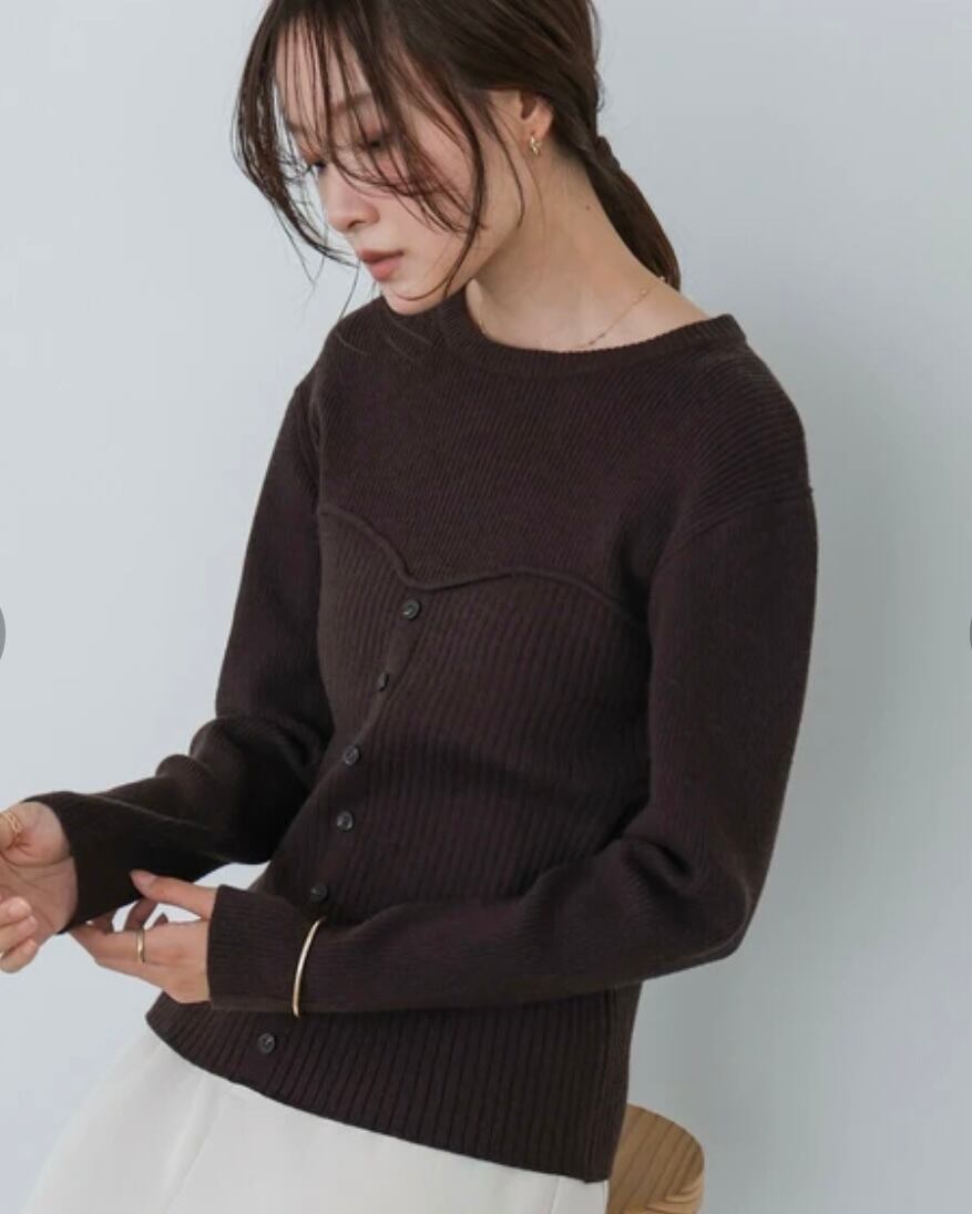 ビスチェ風のフロントデザインが女性らしさを引き立てる、二ットトップス。小さな飾りボタンをあしらい、上品でクラシカルなムードをプラスしました。柔らかなレーヨン素材で着心地も軽やか。長袖なので一枚でも、ジャケットやカーディガンのインナーとしても活躍します。フェミニンな印象をキープしながら、オフィスにも休日のカフェ巡りにもぴったりのアイテムです。