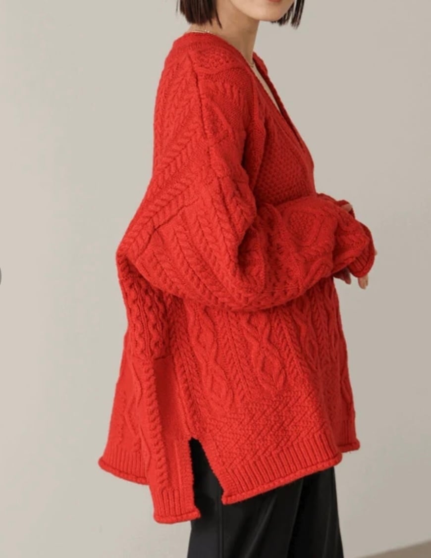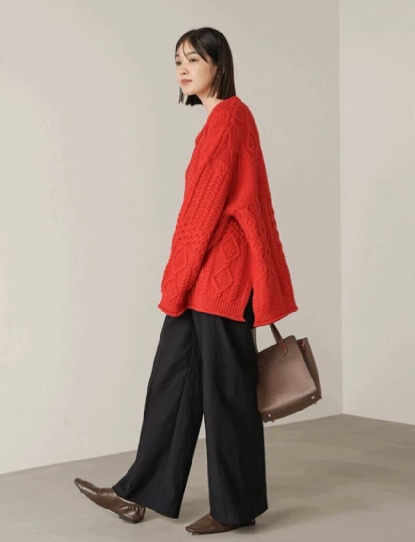 トレンド感たっぷりの深めVネックが魅力のケーブルニット。