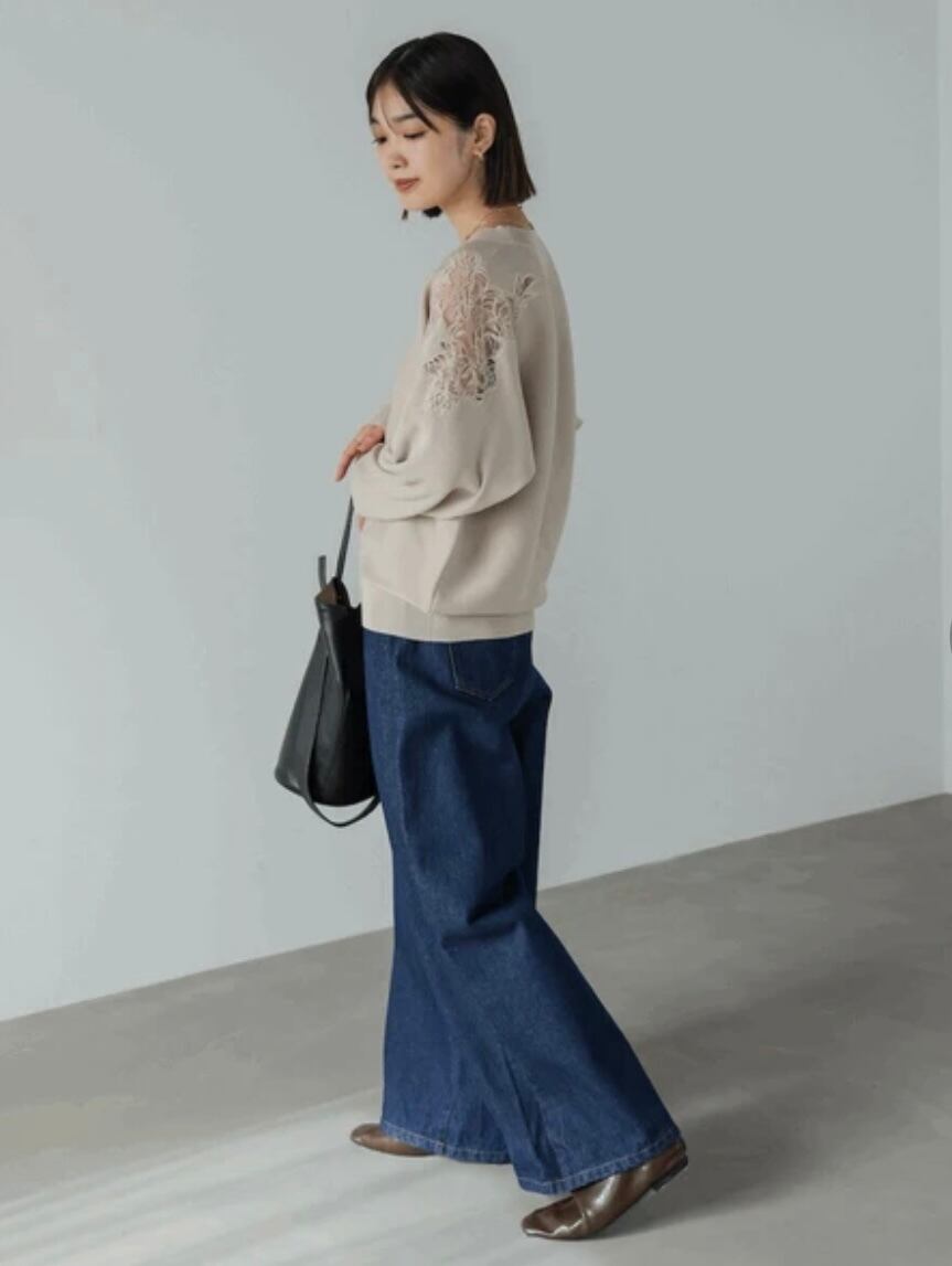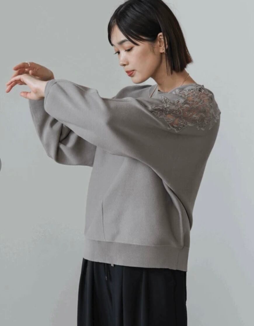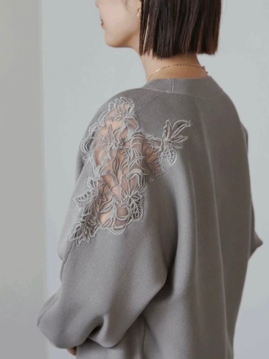 ドルマンスリーブと肩のレースモチーフが女性らしいニット。