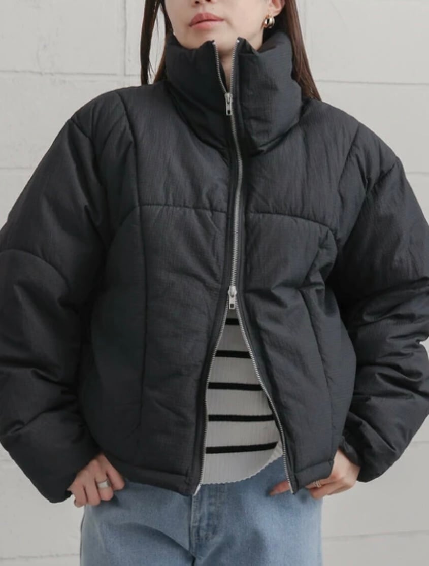 シャープな切り替えデザインが他と差をつける、ショート丈中綿ジャケットが登場!ボリューム感たっぷりで、刃織るだけで今っぽいスタイルが手に入ります。小顔効果も期待できるインパクト大なスタンドカラーは、上までファスナーを留めると防寒に◎。もちろん、襟を折り返してレギュラーカラーでお召し頂いても上品です。裾のドローコードでシルエットチェンジも