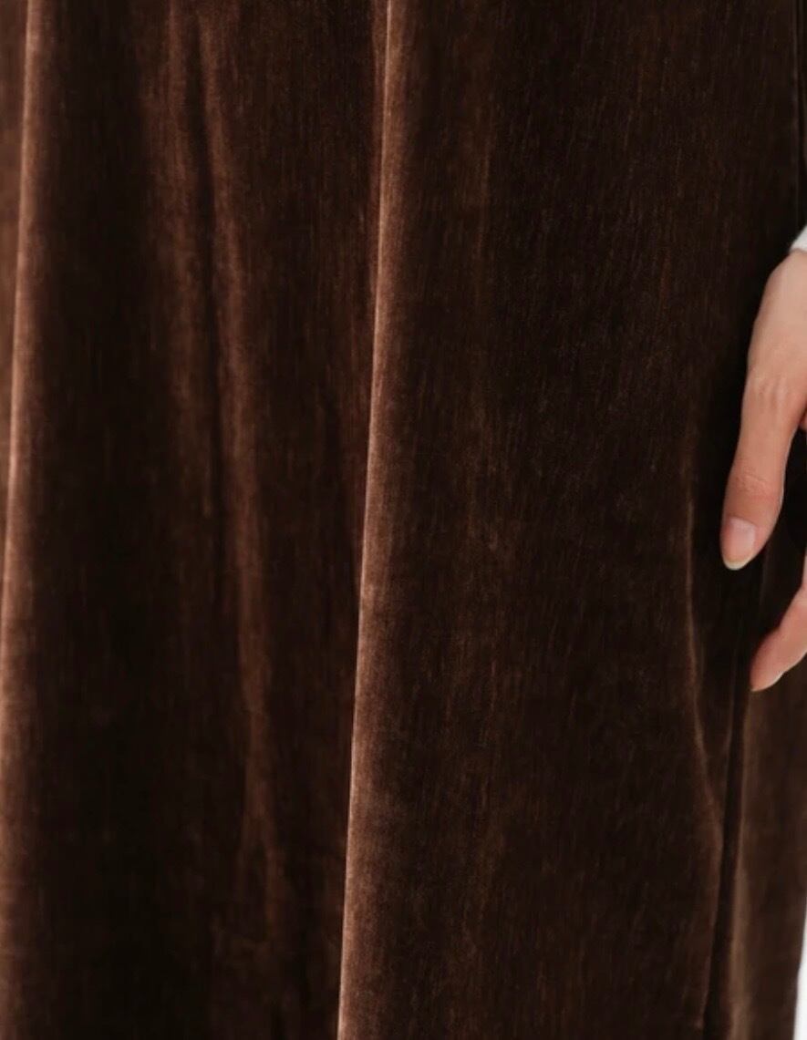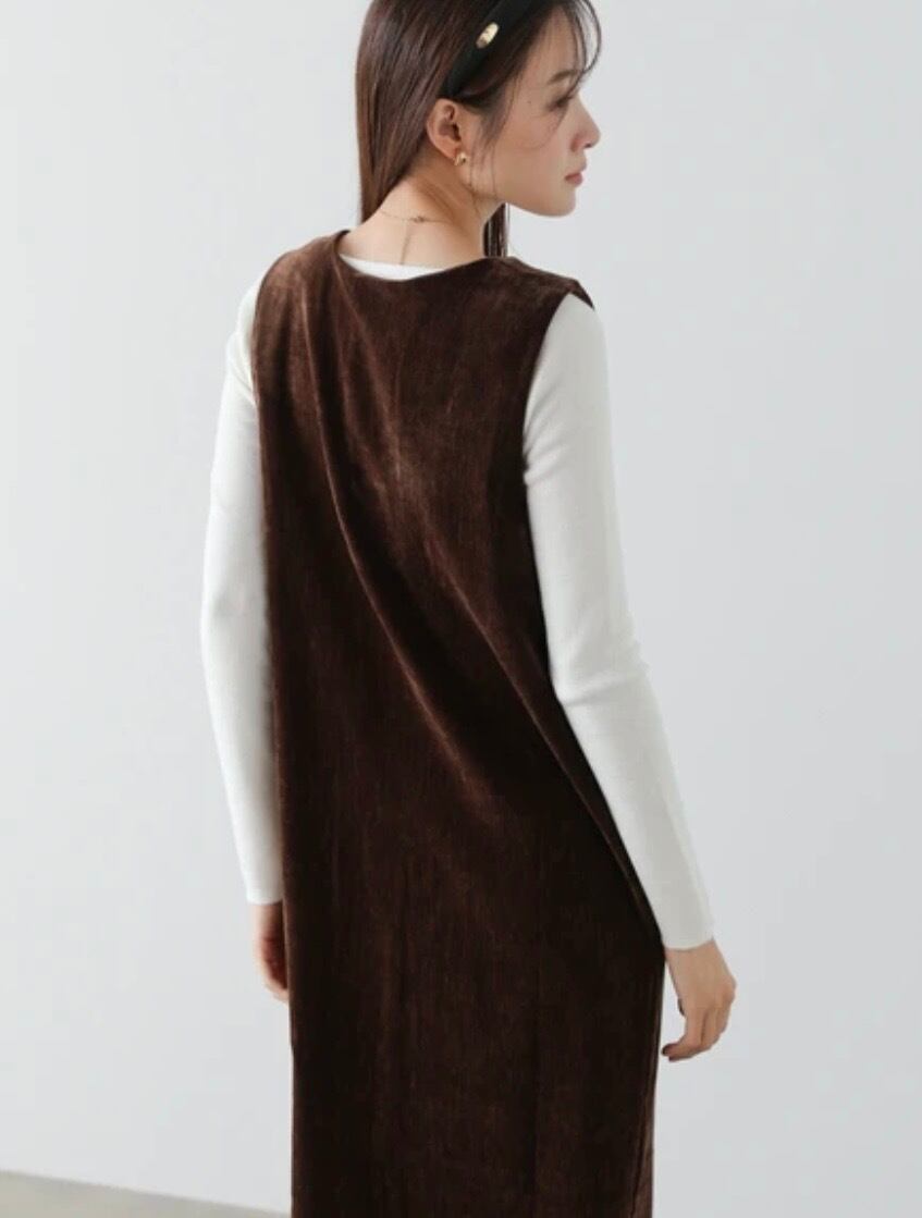しっとりとした光沢感が魅力のベロアロングワンピース。シンプルな丸首デザインとスリットのないストレートシルエットが、ベロア素材の上品な存在感を際立たせます。余計な装飾をそぎ落としたミニマルなデザインだからこそ、落ち着いた雰囲気と女性らしい柔らかさを引き出してくれる一枚です。ブラウンはクラシカルでやわらかな印象に、ブラックはシックでモードな印象に仕上がります。