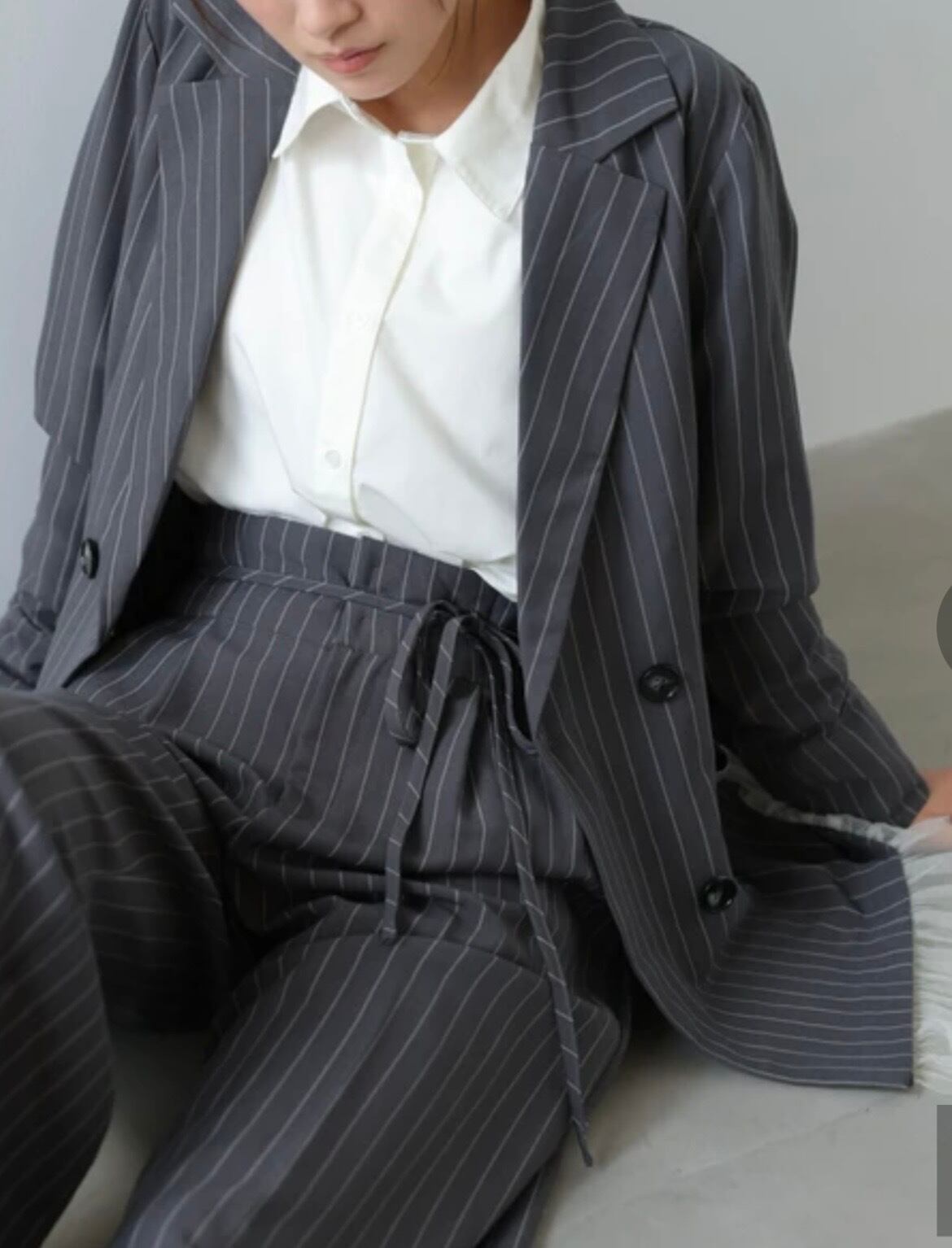 メンズライクなテーラードジャケットに、フリルを施したデザイン。