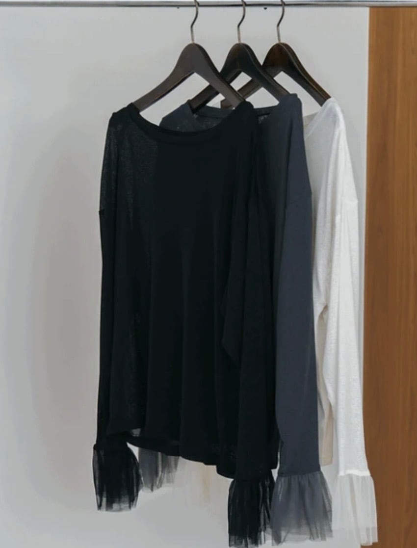 袖先にはチュール素材のフリルをあしらい、さりげない甘さと華やかさをプラスしました。
