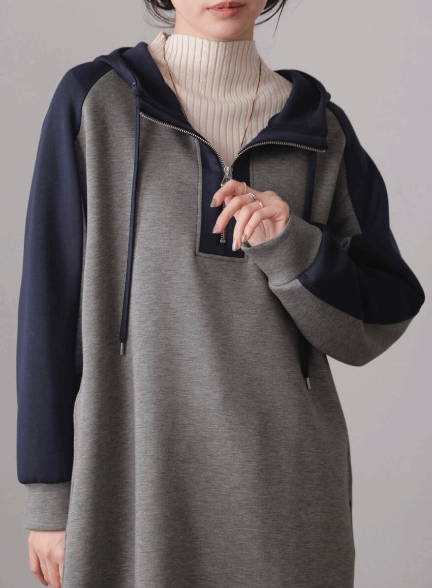 バイカラーのフーディデザインがモードスポーティなチュニックアイテム。