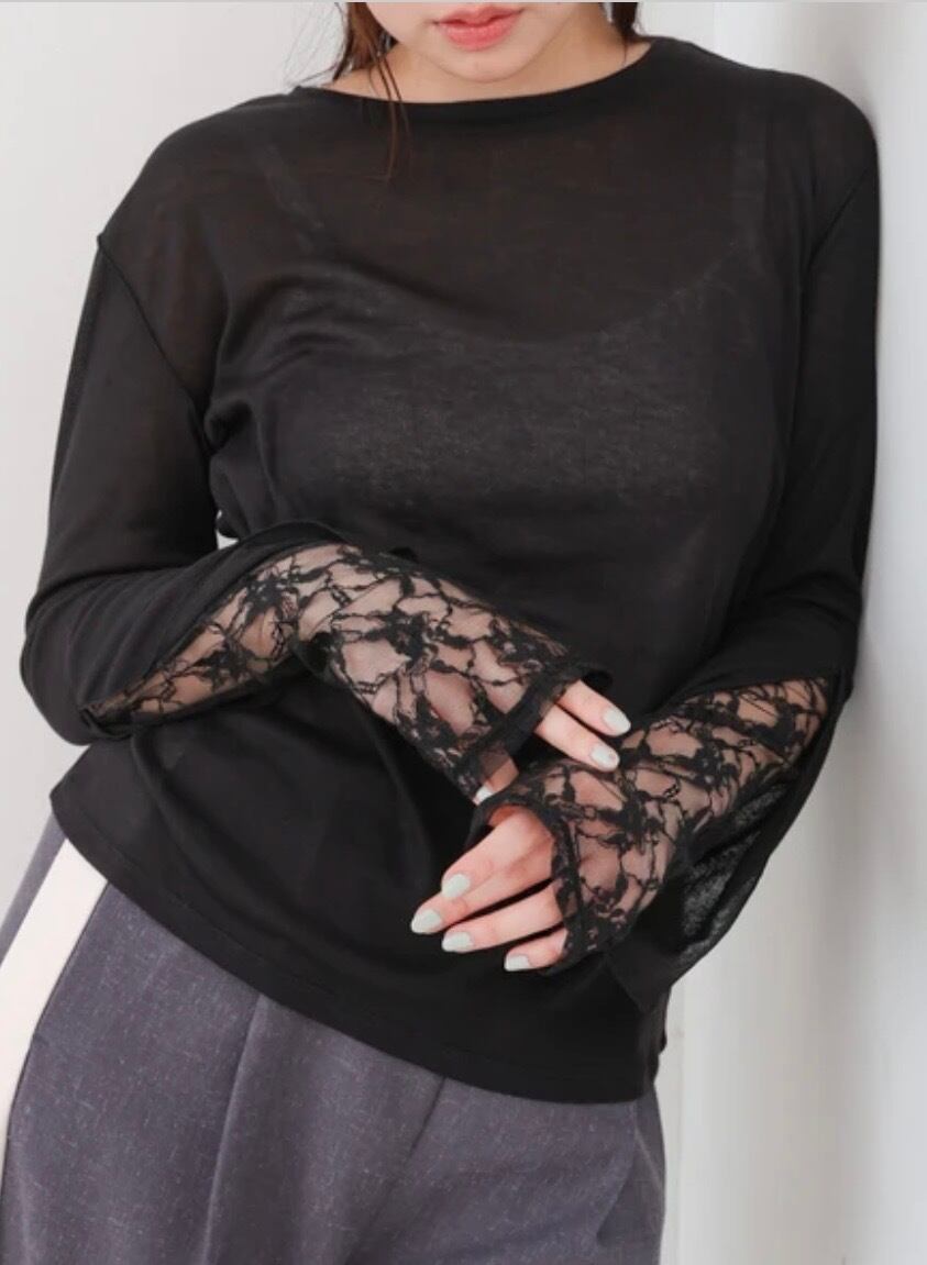 袖の部分がレースシアーになっているのが魅力的なプルオーバーです。レースの柄とトップスの色合いが少し早めの秋を感じさせるデザインになっています。さらに薄めの生地感なので夏と秋の間にぴったりなアイテムです。所々ラインがはいっているのでメリハリがある着用感になります。ワンピースのインナーにしたりビスチェと合わせたりと使いやすさ抜群なので1枚持っていて損しないアイテムです。