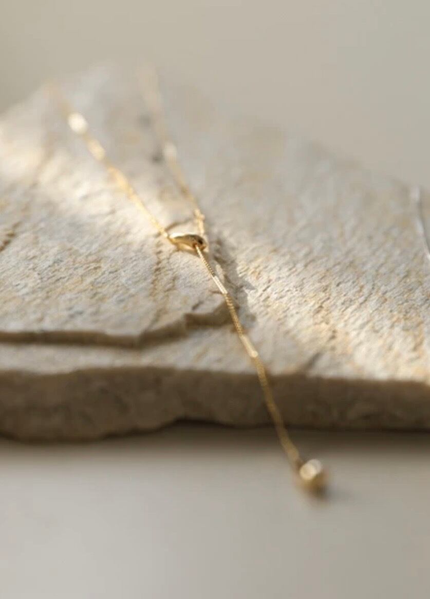 コロンと小粒のしずくモチーフを2つあしらった、さりげなく印象的なタイニードロップロングネックレス。片方のしずくはスライド仕様になっており、チェーンを動かすだけで長さを自由に調整できる一癖デザインがポイントです。繊細なロングシルエットが縦ラインを強調し、ニットやブラウスに合わせるだけで大人の抜け感をプラス。ゴールドは柔らかい女性らしさを引き立ててくれるカラー。シンプルコーデにひとさじの表情を添えてくれる、万能ロングネックレスです。