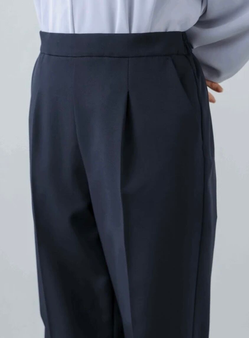 腰まわりは程よくフィットし、裾に向かって細くなるテーパードラインが脚を美しく演出。