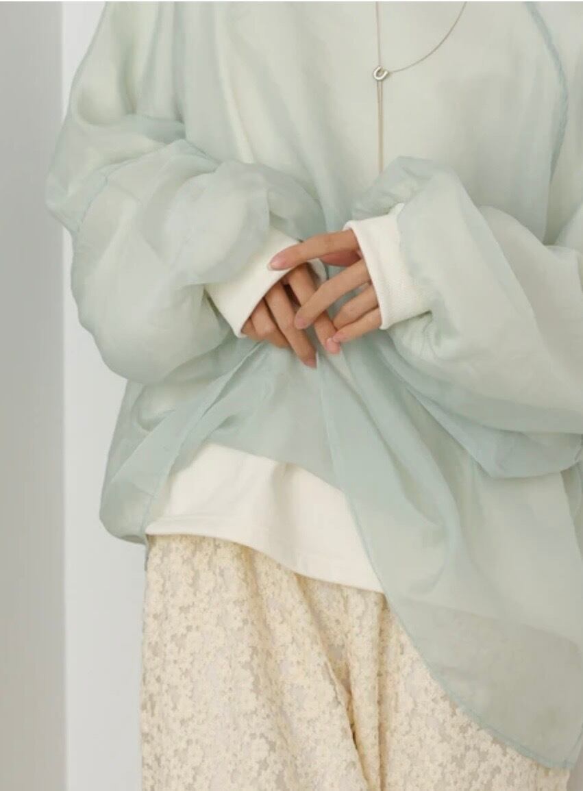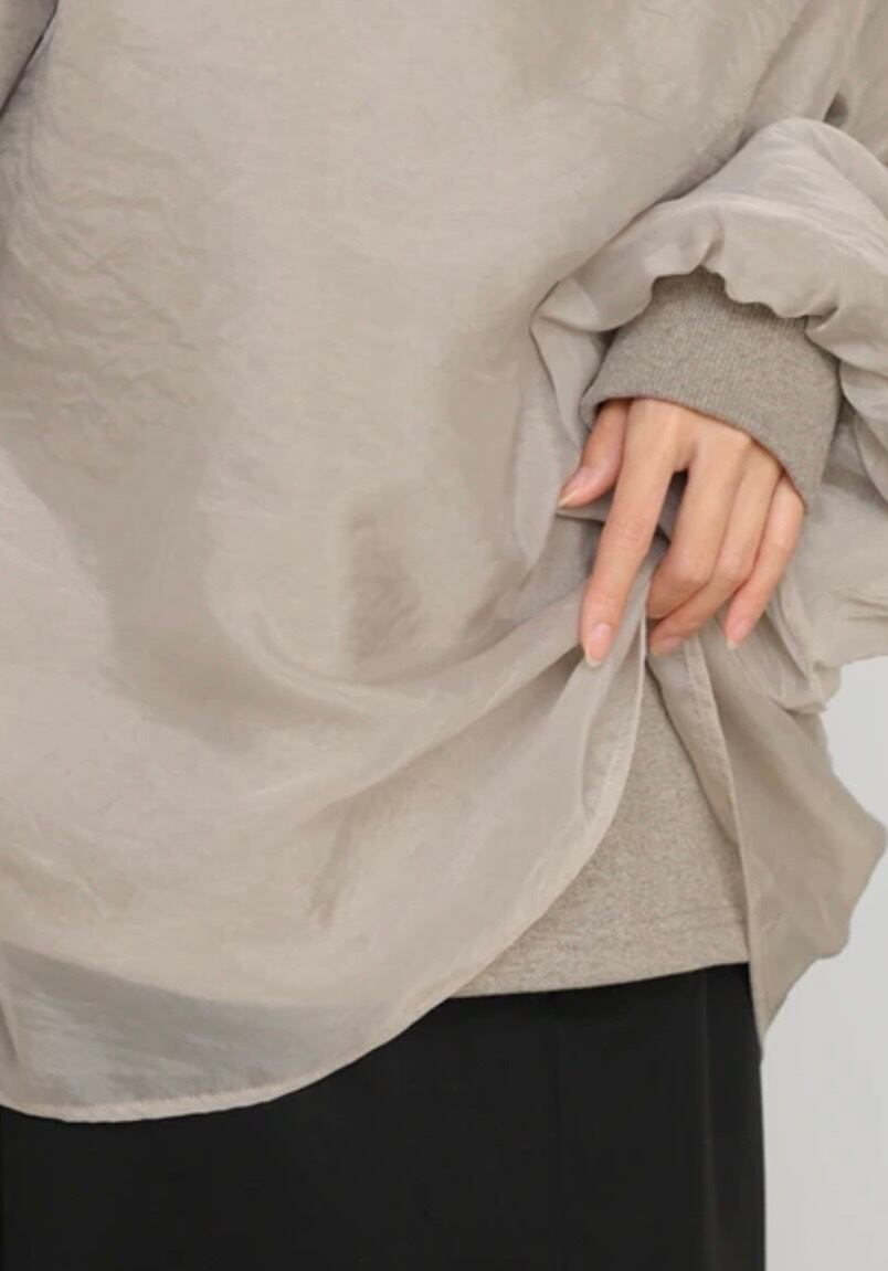イージーな着心地の裏毛スウェットにオーガンジーをレイヤードして着映え抜群の1枚が出来上がりました!オーガンジー部分は光の当たり具合で様々な表情が浮かび上がります。ラグランスリーブの程よくルーズなシルエットがこなれ感を演出し、袖もぱふっと感があり 可愛らしいボリューム感でフェミニンさを引き立てます。バランスの取りやすい腰までのレングスも魅力的です。